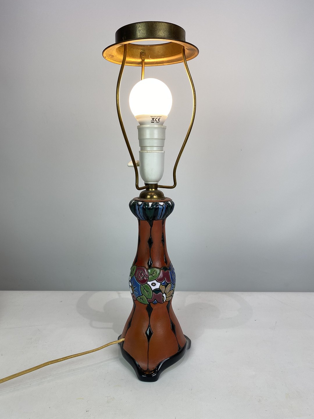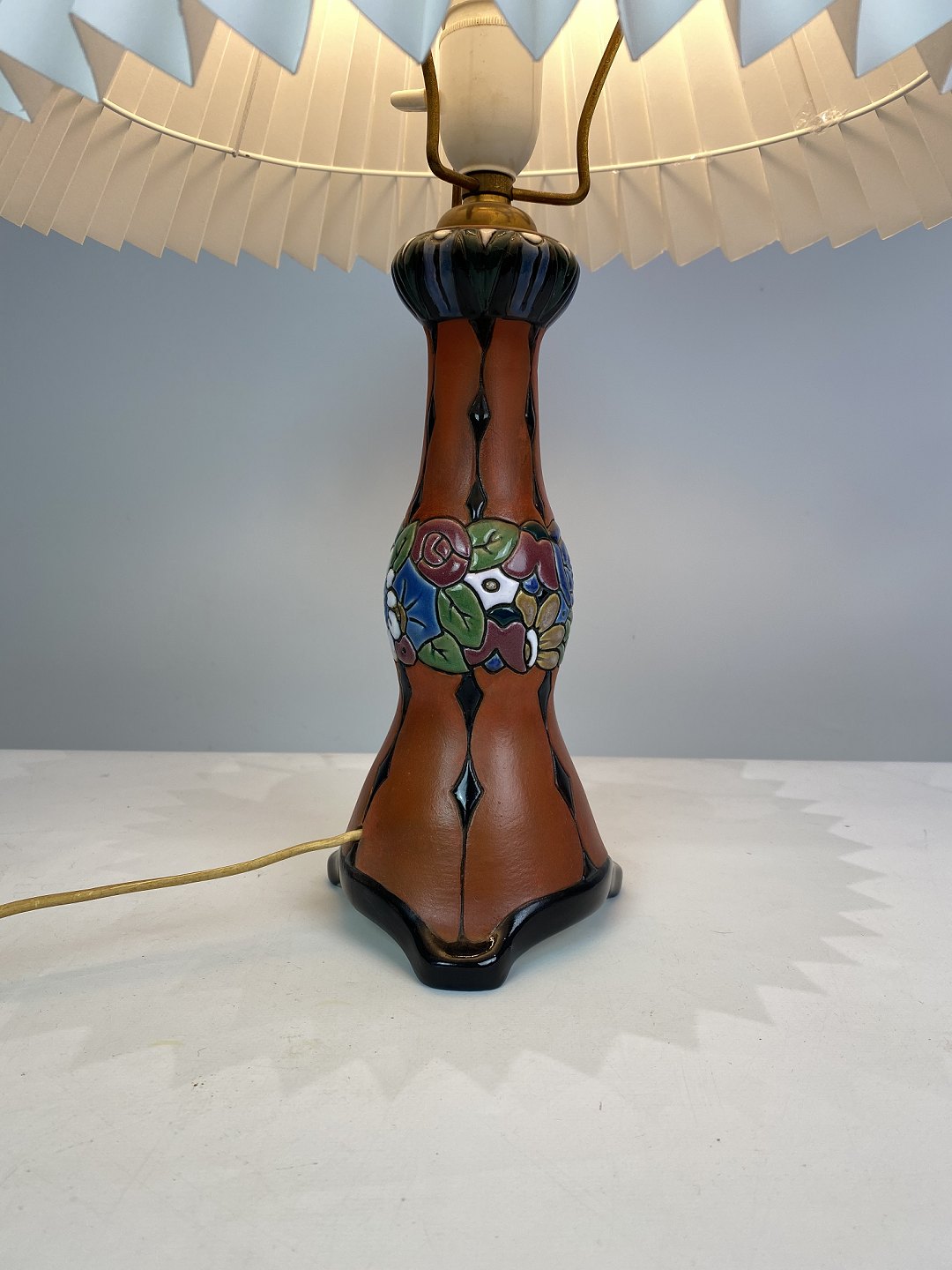 Ceramic table lampe with an orange glaze and with paper shade, from the 1960s. The lamp is with number 15436 and in great vintage condition.