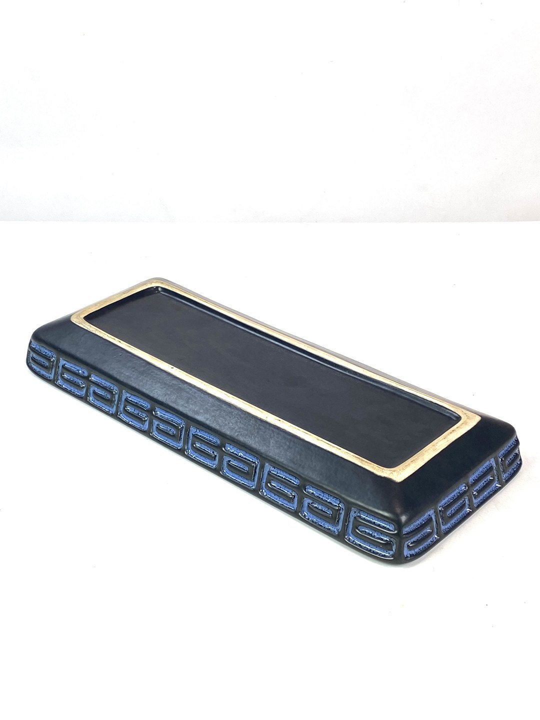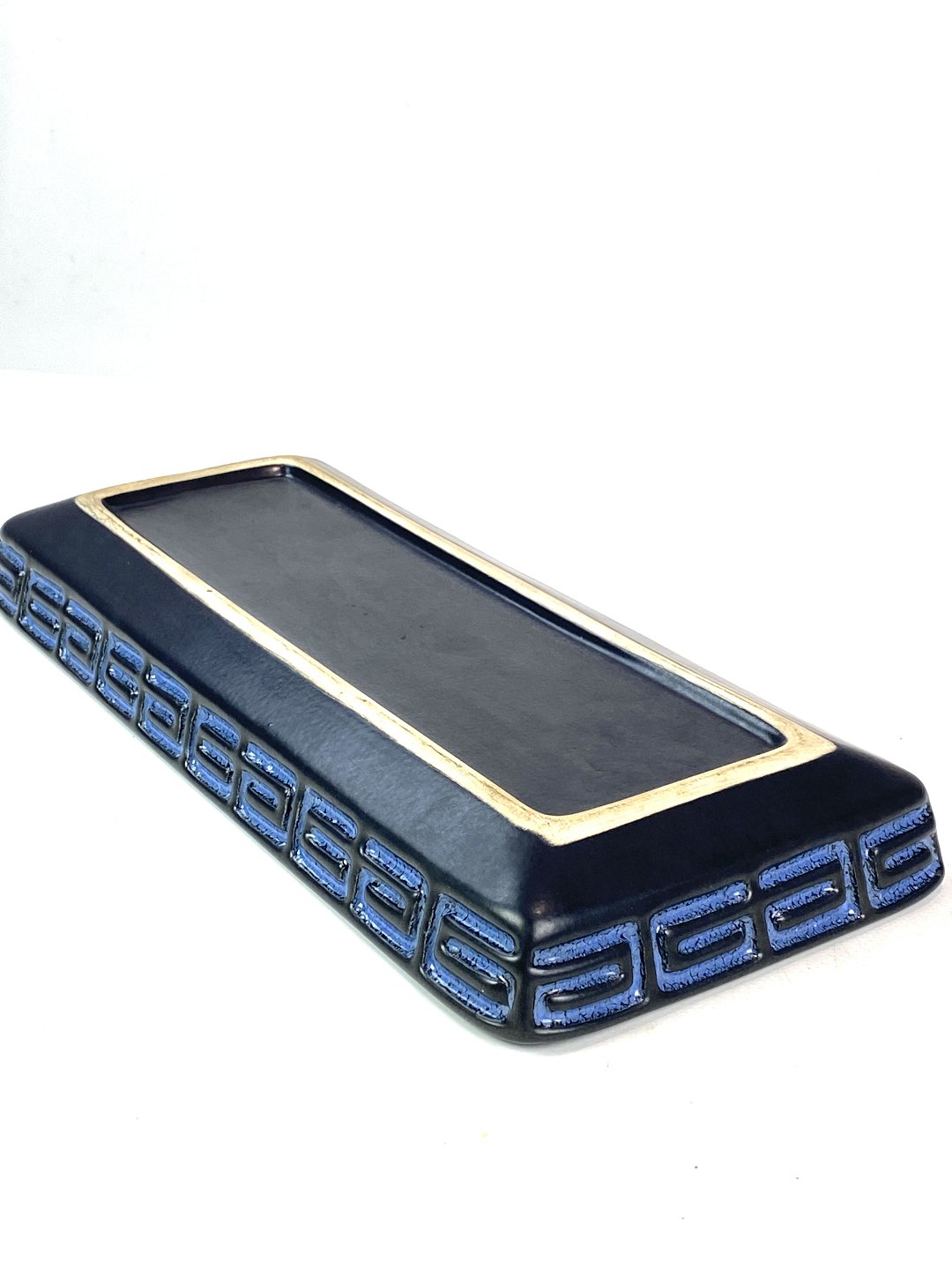 Aflangt keramik fad med blå glasur fra omkring 1950erne.
