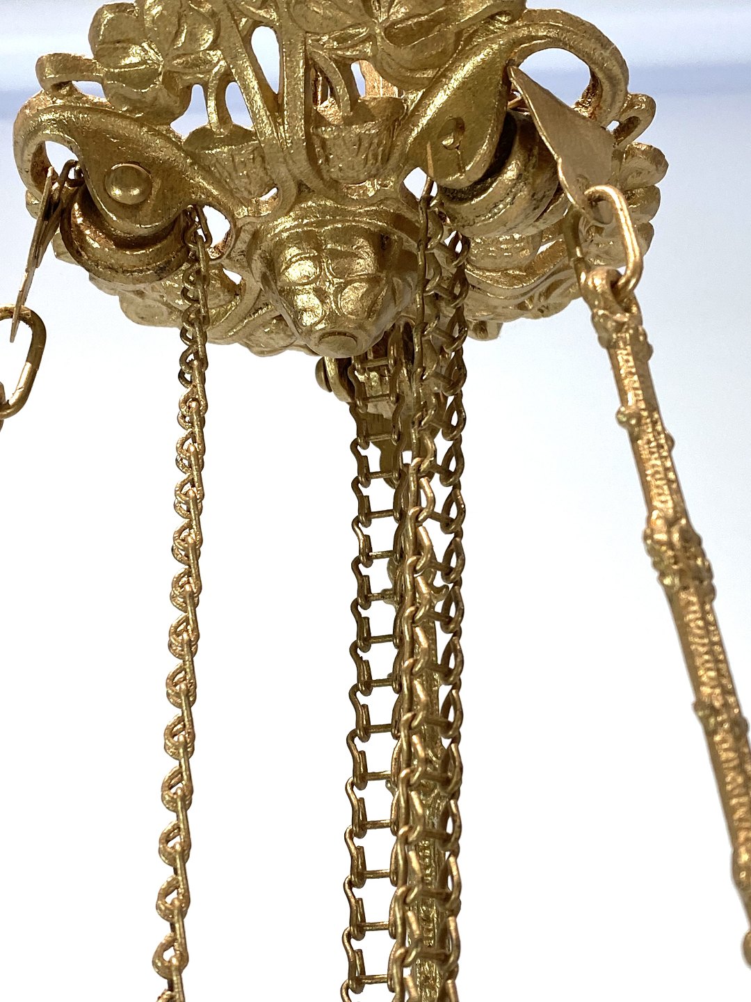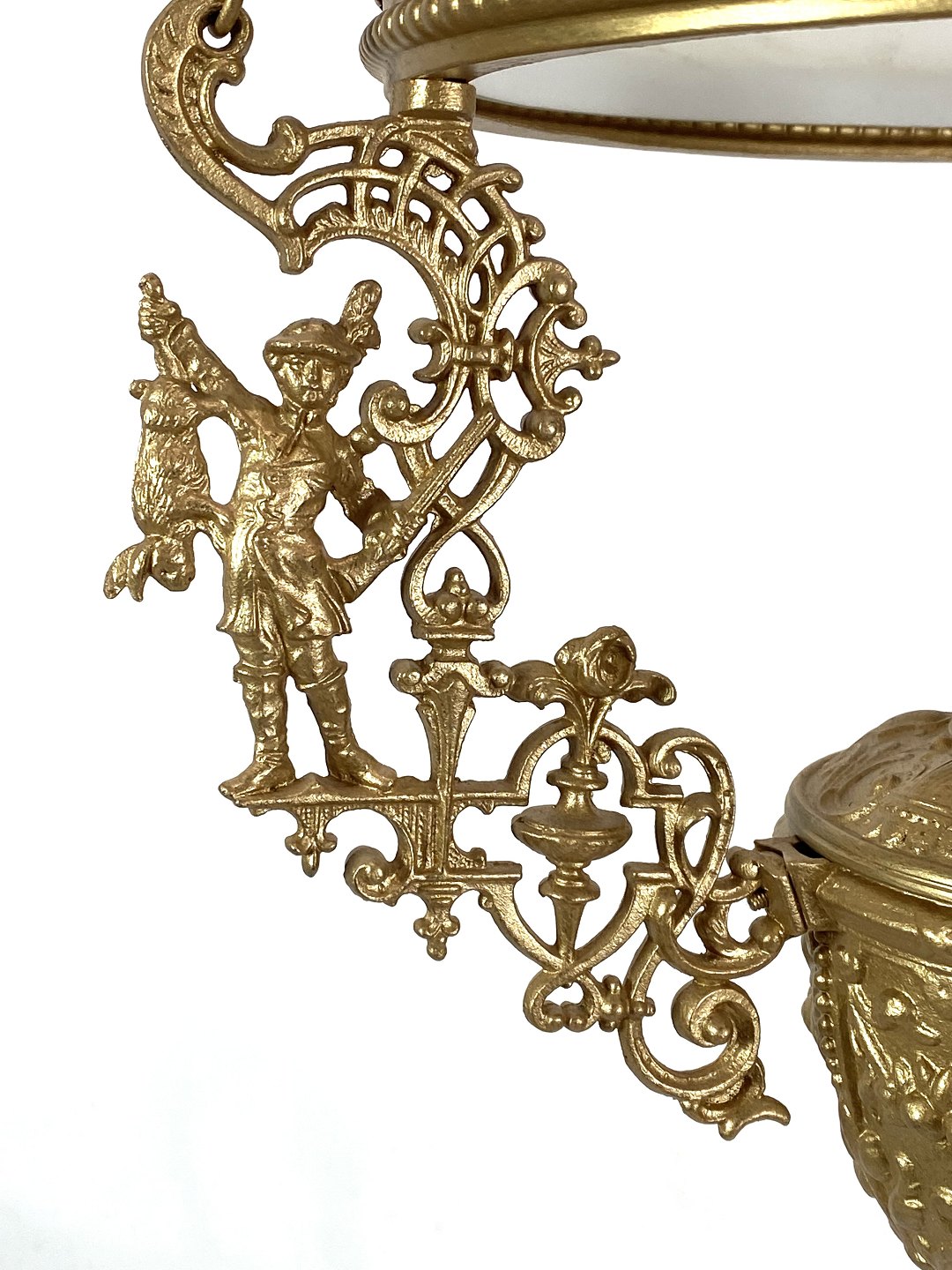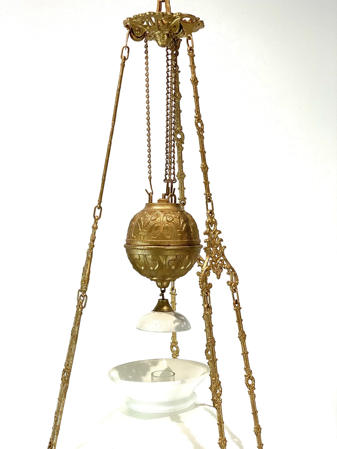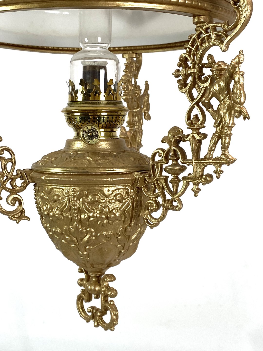 Large kerosene lamp of patinated brass and shade of white opaline glass from around the 1880s. The lamp is in great antique condition.