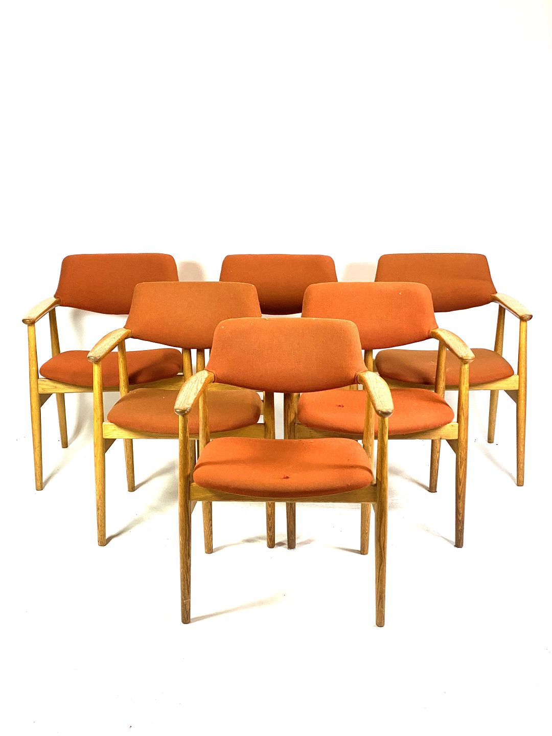 Seks armstole i eg og polstret med orange uldstof designet af Erik Kirkegaard fra 1960erne.