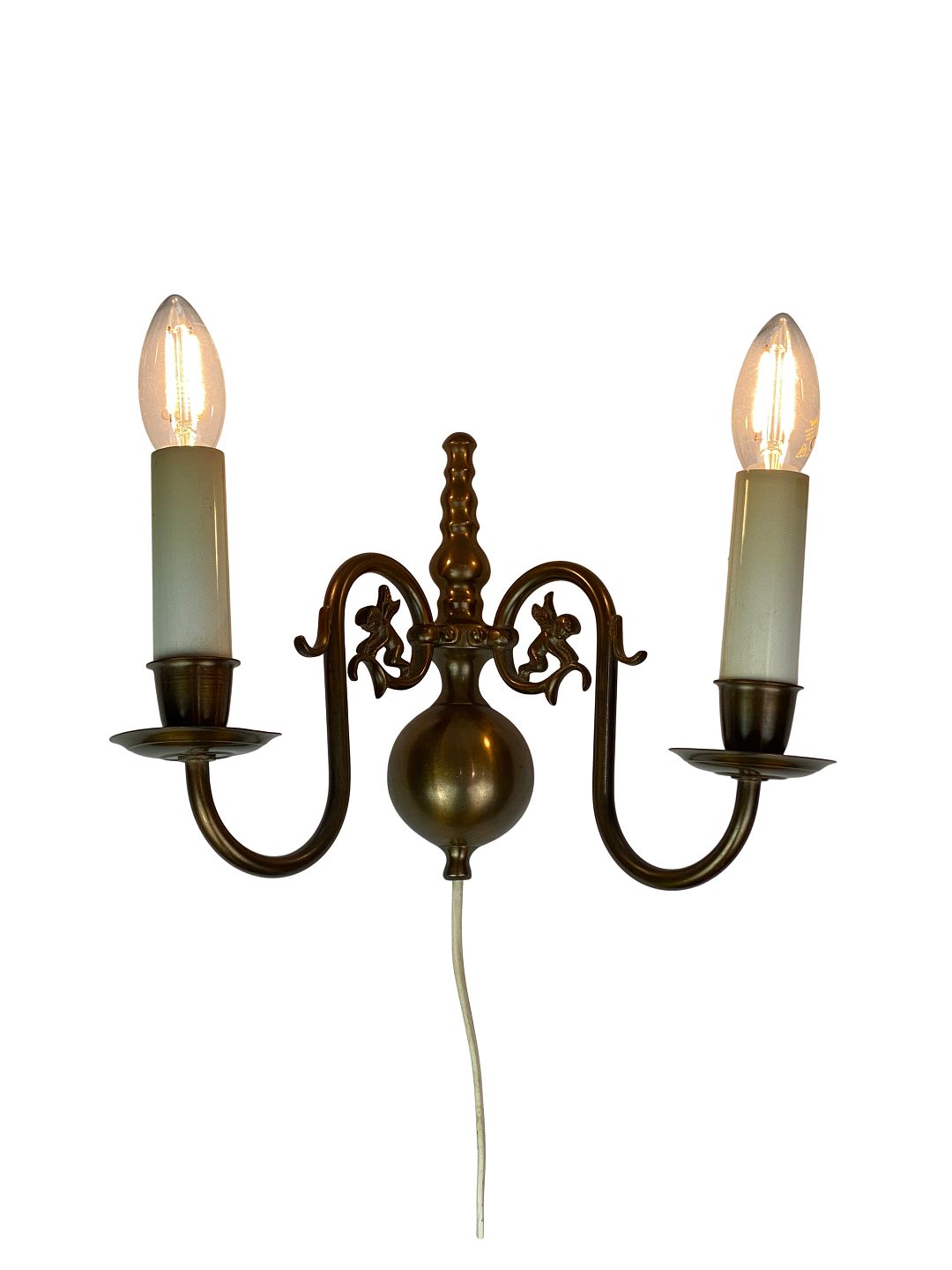 Wall mounted lamp of burnished brass decorated with angels from around the 1920s.