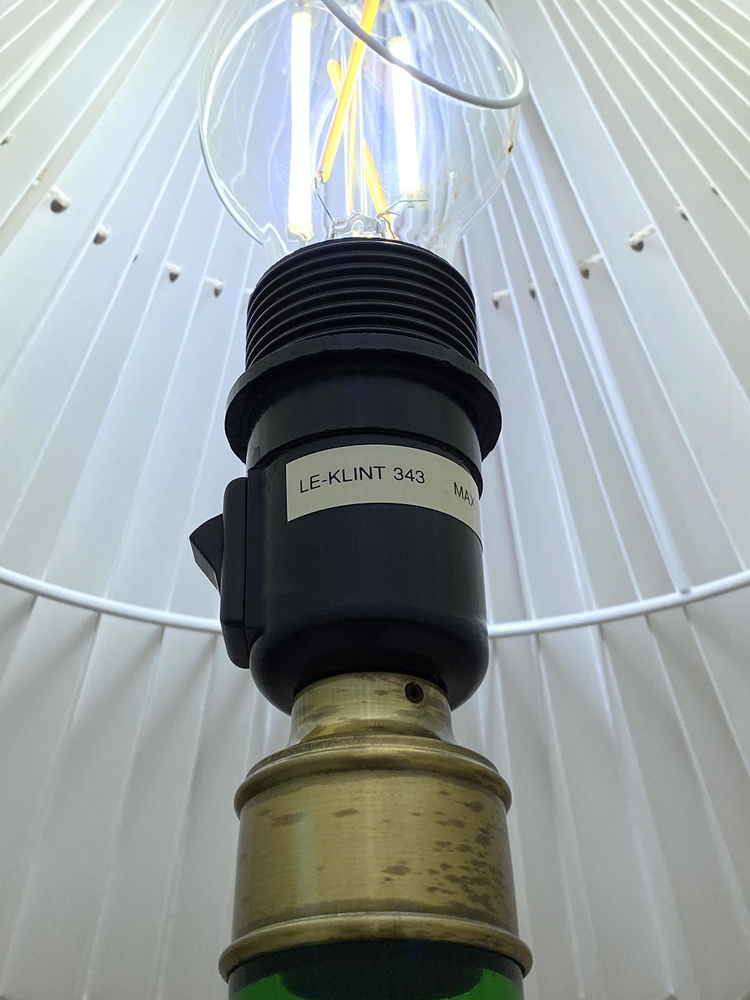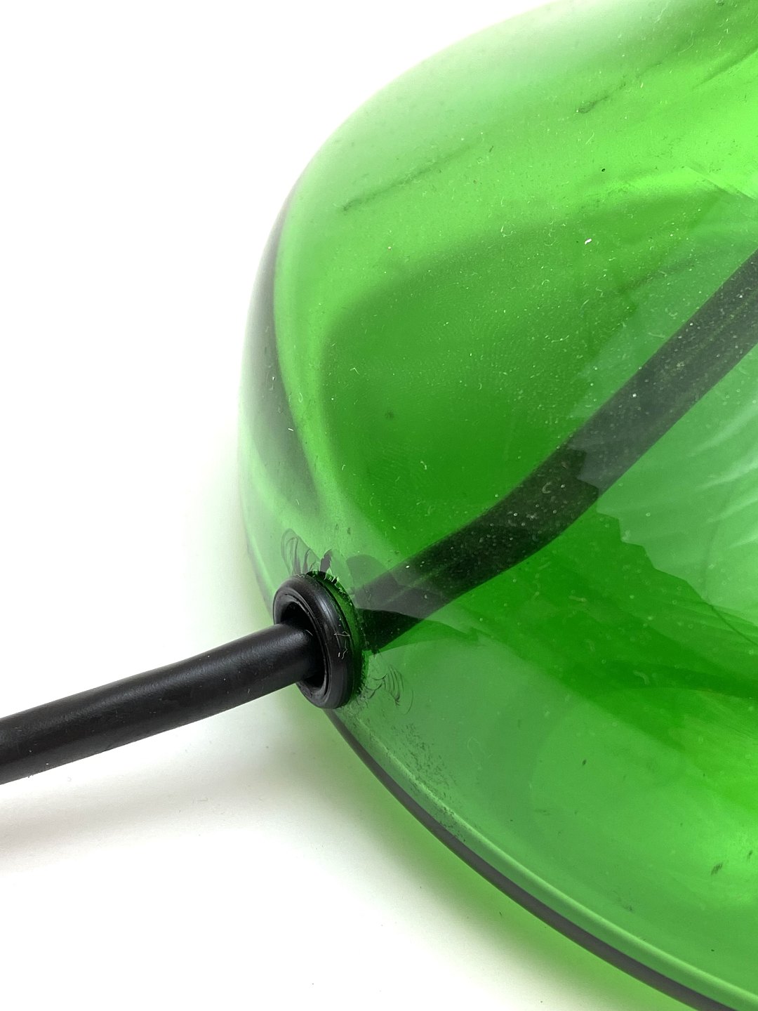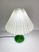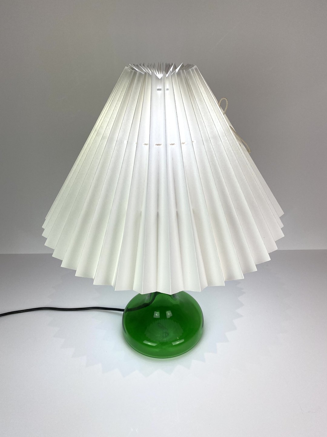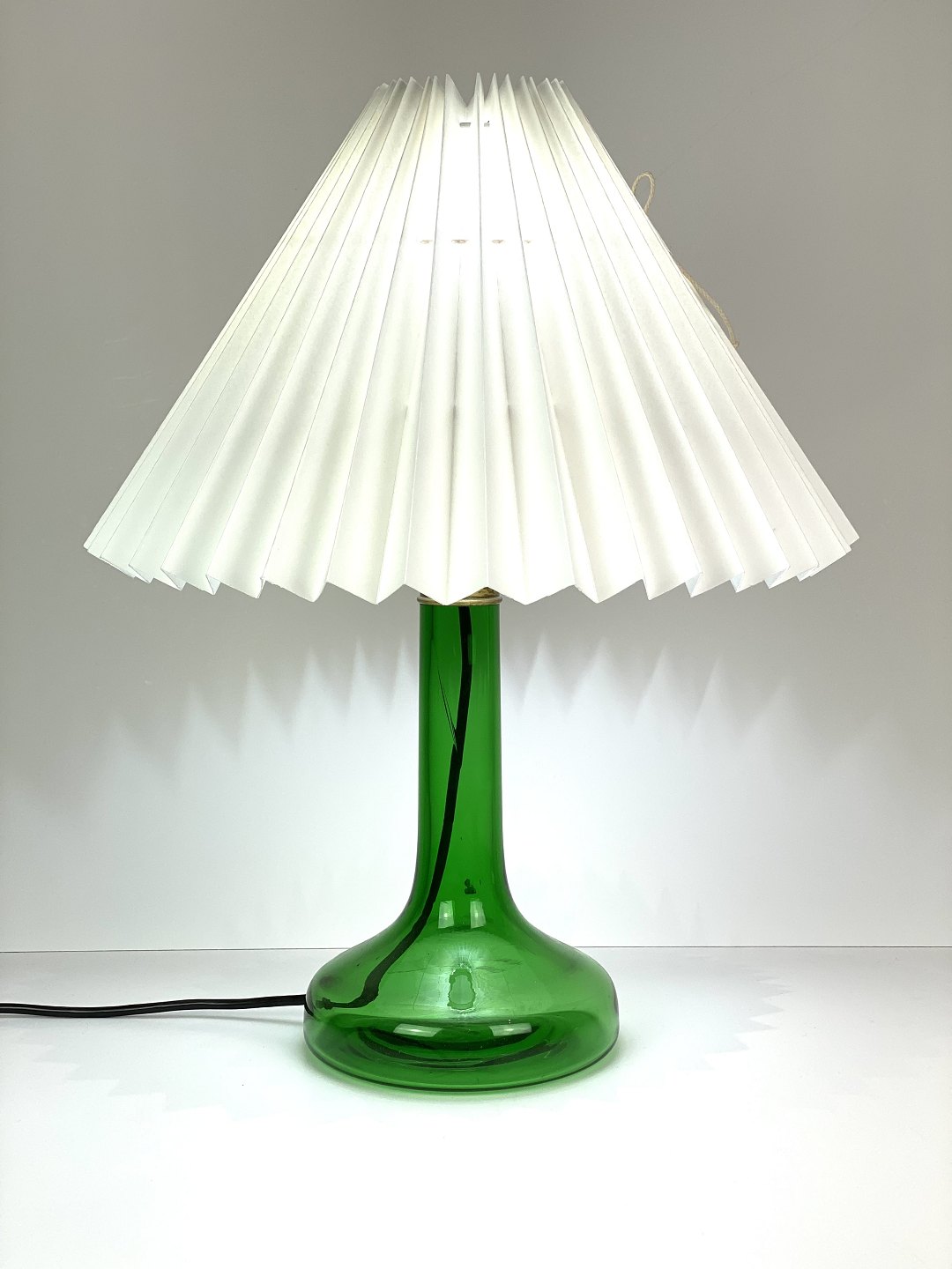 SolgtBordlampe af grønt glas med papirskærm, af Holmegaard. Lampen er i flot brugt stand.