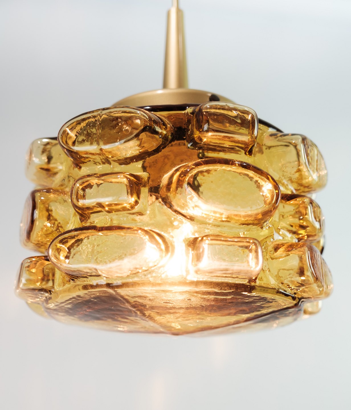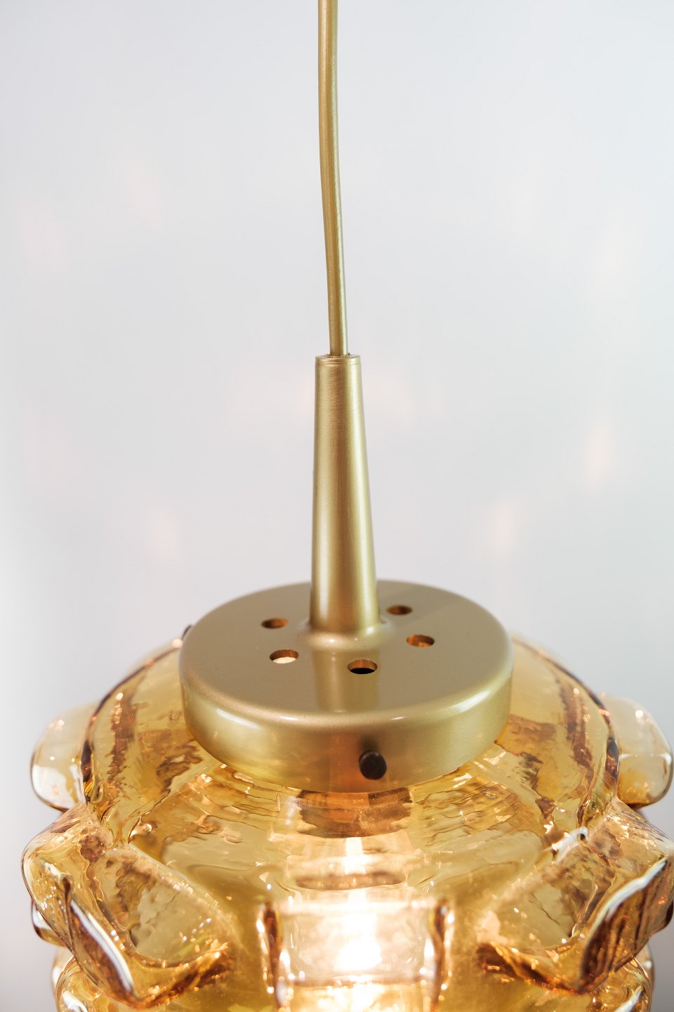 SolgtGlasloftslampe med messingelementer og honningfarvet glas fremstillet i Danmark i 1960'erne. Står i meget god vintage stand.
