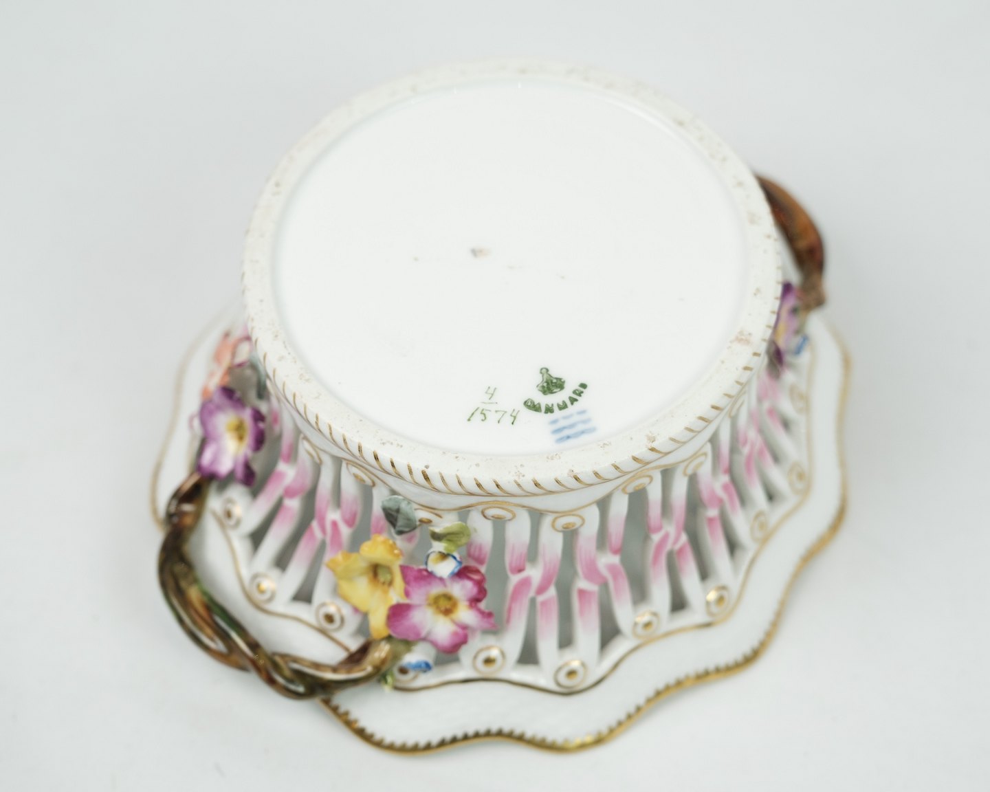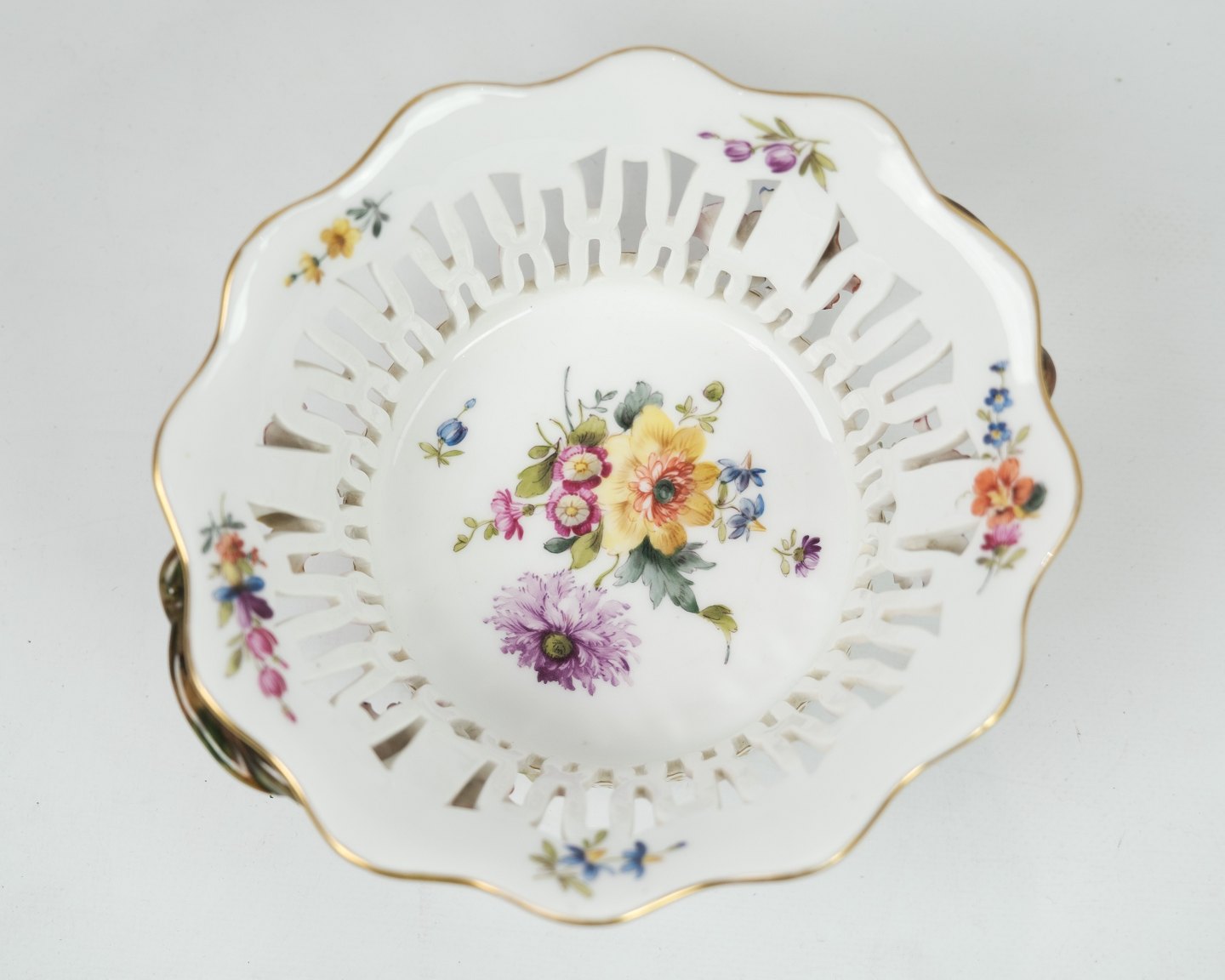 SolgtRoyal Copenhagen kongelig skål i gennembrudt med flotte påsatte blomster i mønstret saksisk blomst nr. 1574. Denne varer er utrolig smuk og har ingen skader. Den er før 1923 og meget sjælden