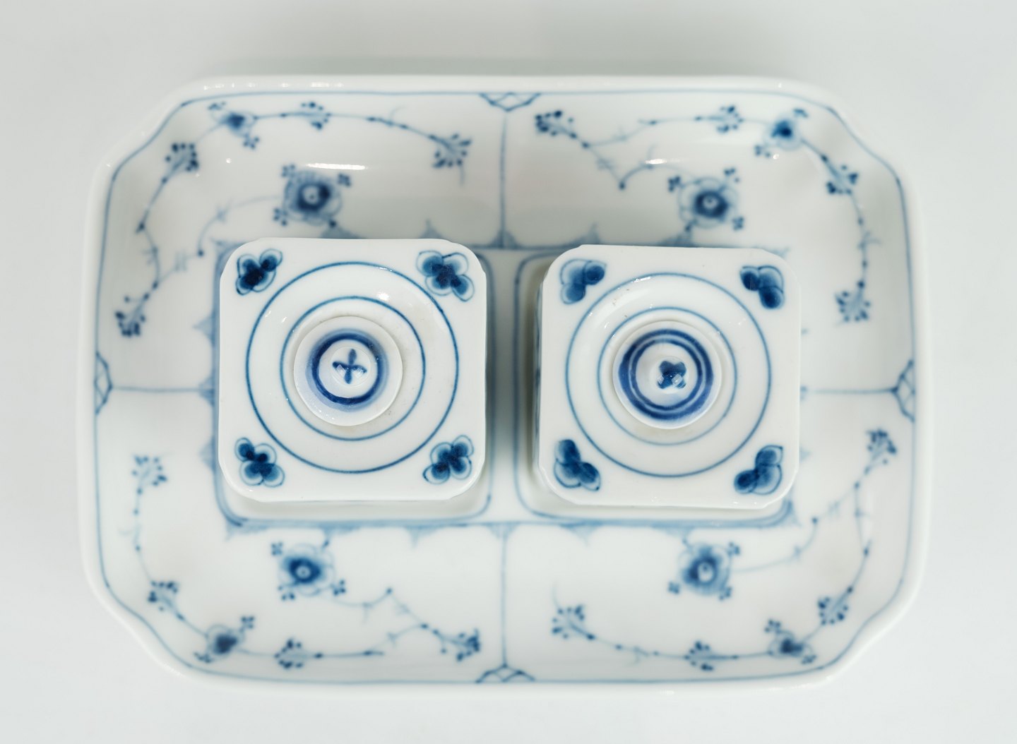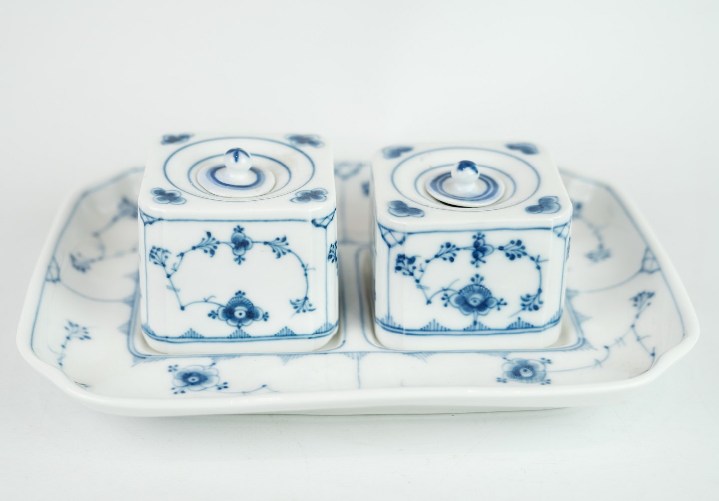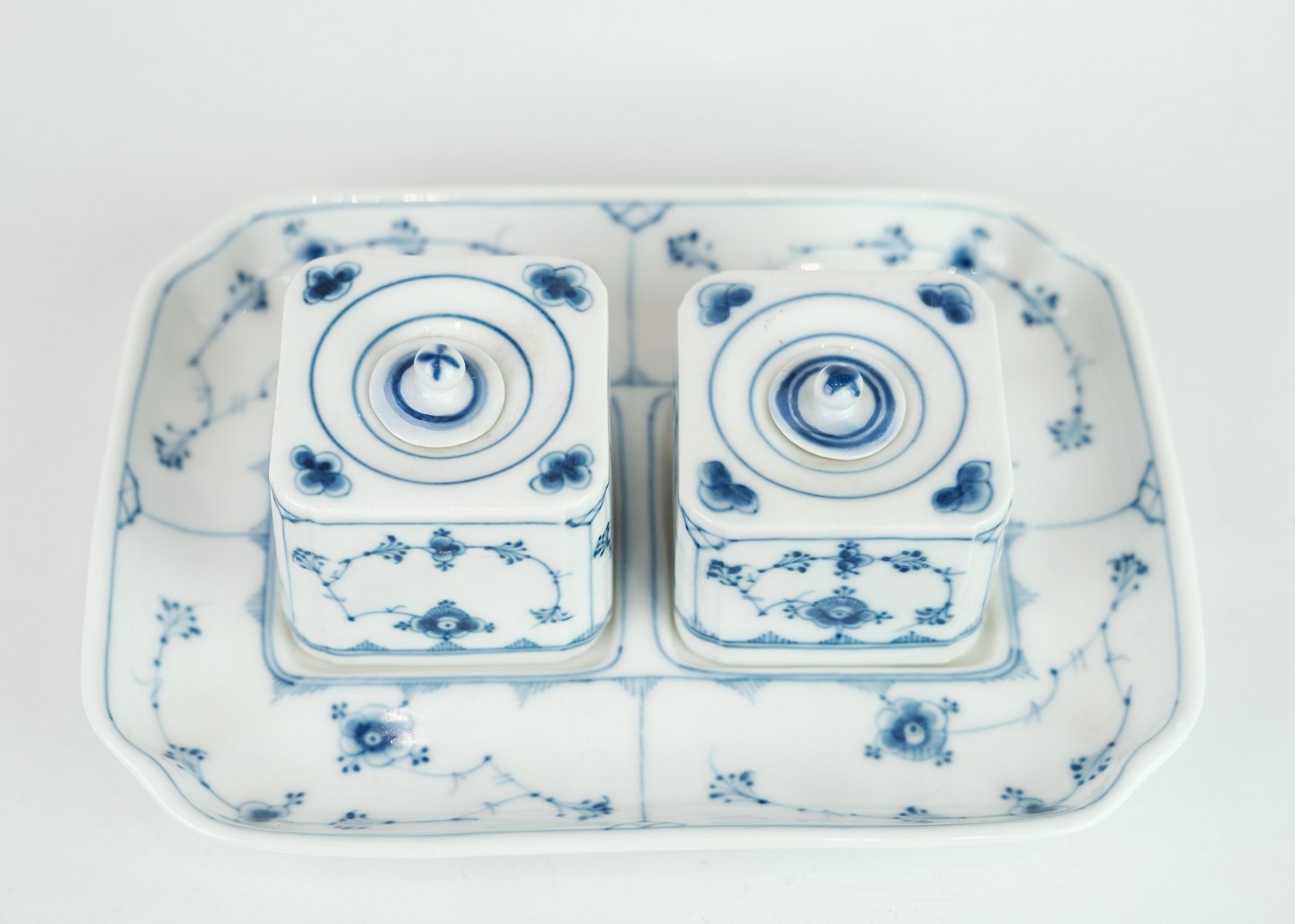 Bing & Grøndahl musselmalet skrivesæt med blækhus egnet til blæk og sand i de gamle dage.