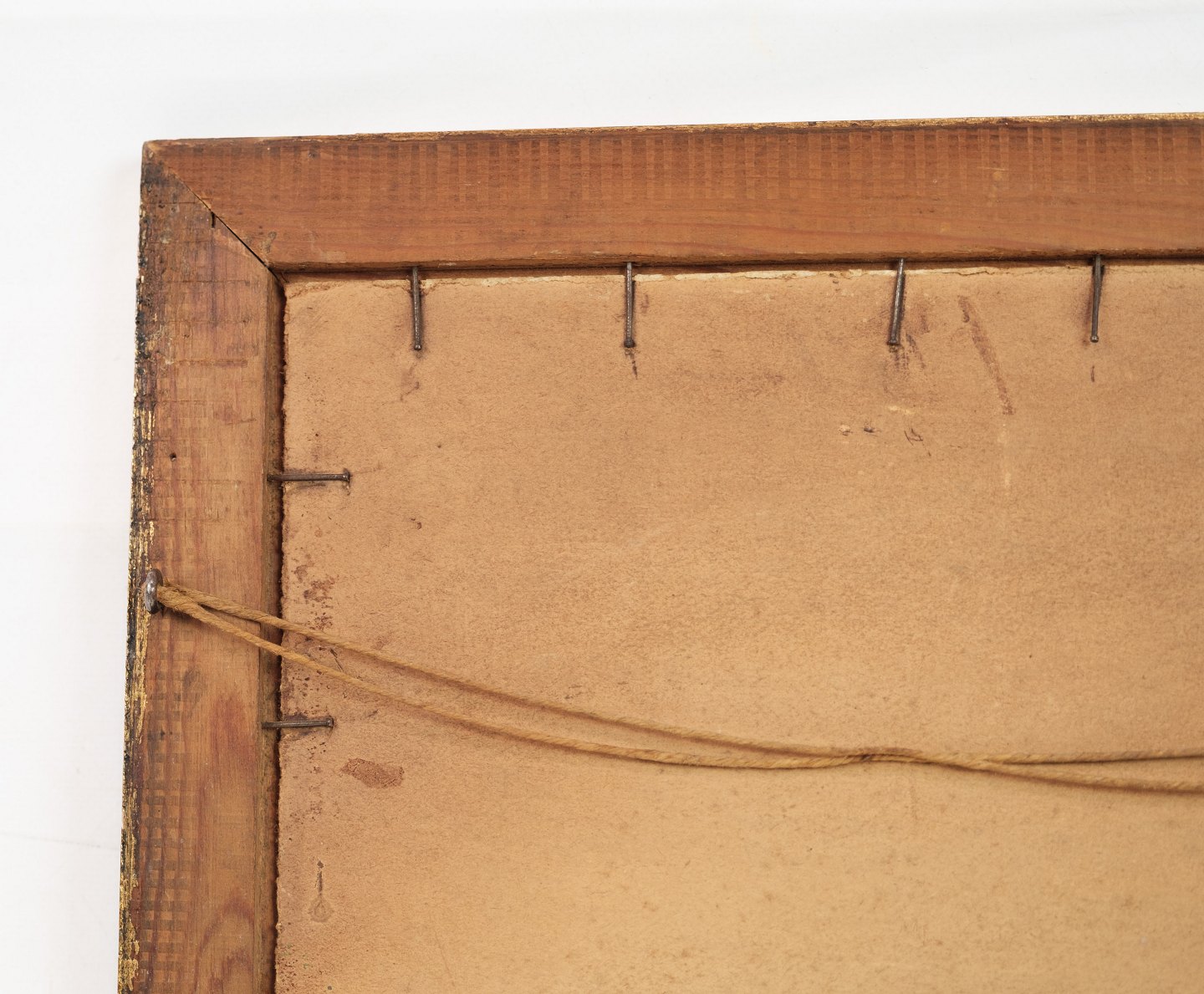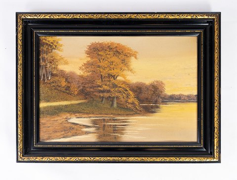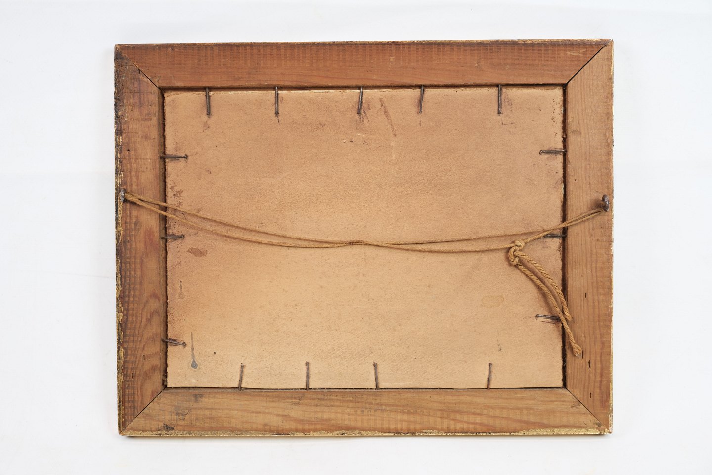 Oliemaleri af et lille bondehus og grusvej malet på træplade med guld ramme fra omkring år 1940'erne. Står i meget fin brugt stand.