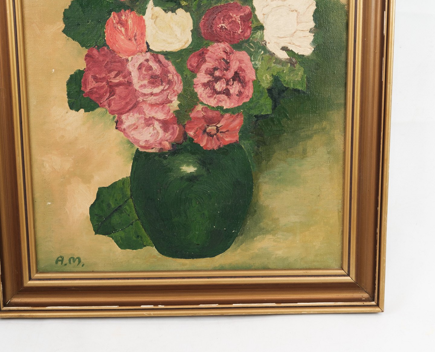 Oliemaleri med motiv af blomster malet på lærredet signet A.M. fra år 1940'erne. Står i meget fin brugt stand.