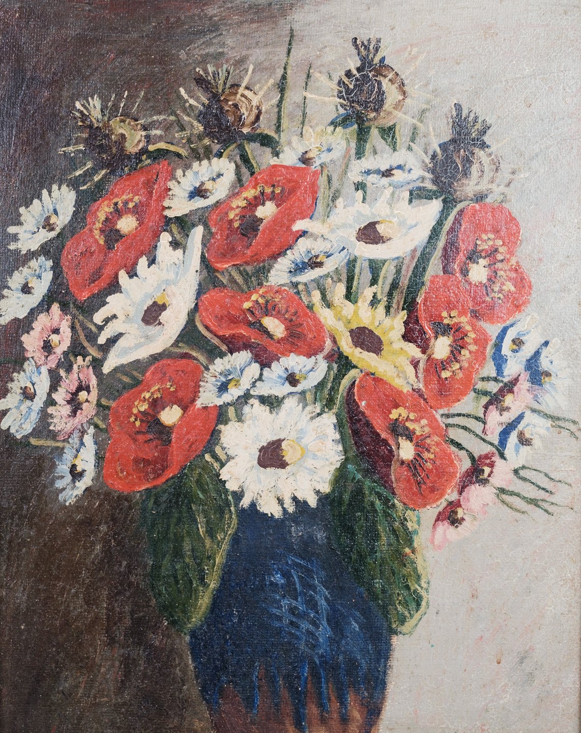 Blomster oliemaleri malet på træ plade fra år 1940'erne. Står i meget fin brugt stand.