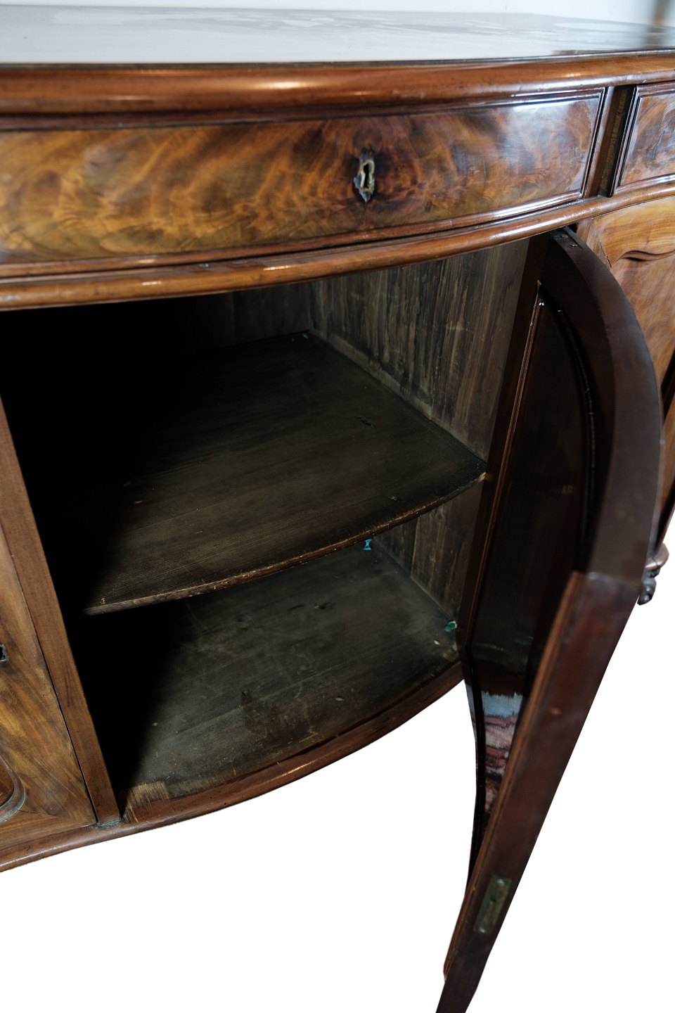 SolgtEn skænk i mahogni med en buede front med oprindelse fra Danmark lavet i 1860'erne. Står i meget fin brugt stand.