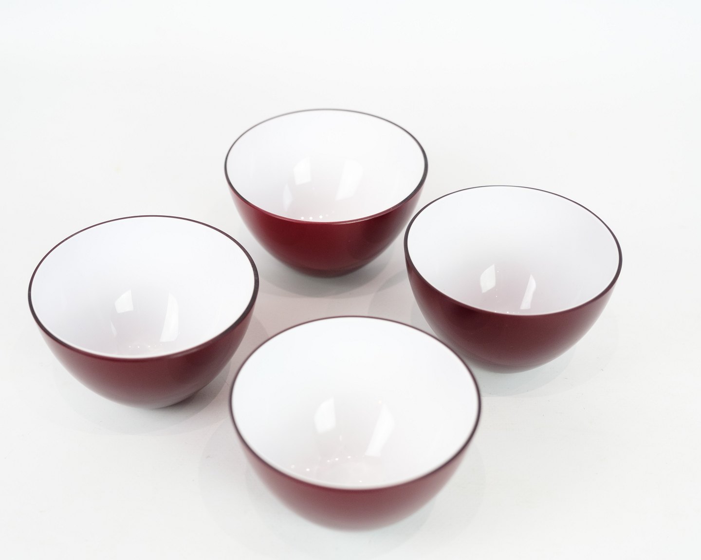 Four small Holmegaard bowls in red and white colors from around the 1980s.