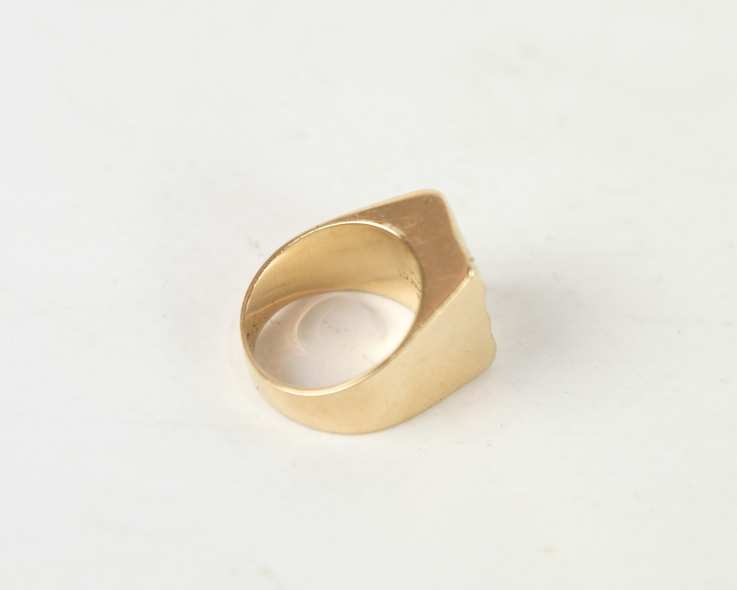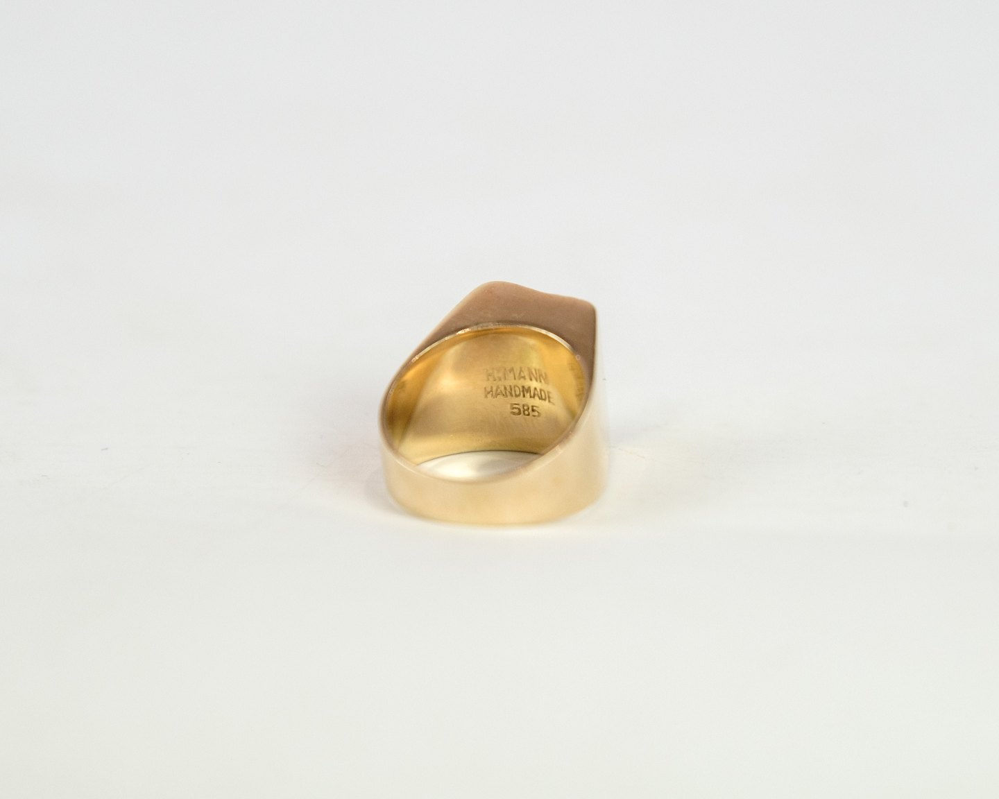 Sold14 carat handmade gold ring stamped H.Mann 585. Thick smooth ring rail with a perforated surface.