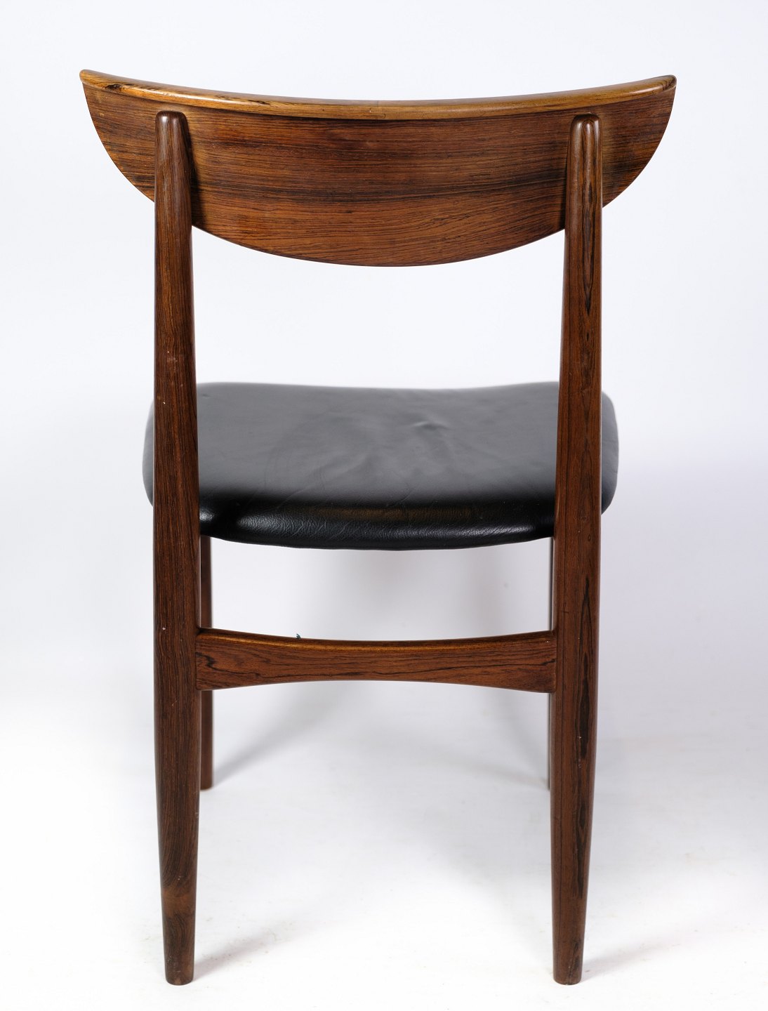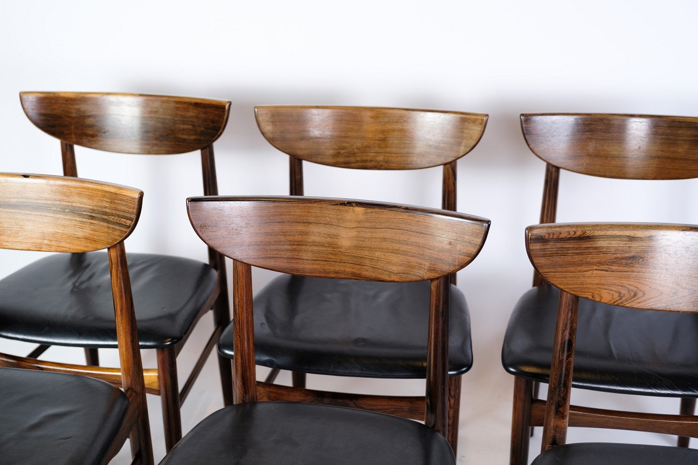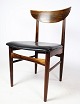 Et sæt af seks spisebordsstole af dansk design i palisander med sort læder fra omkring år 1960'erne. Alle står i meget god stand.