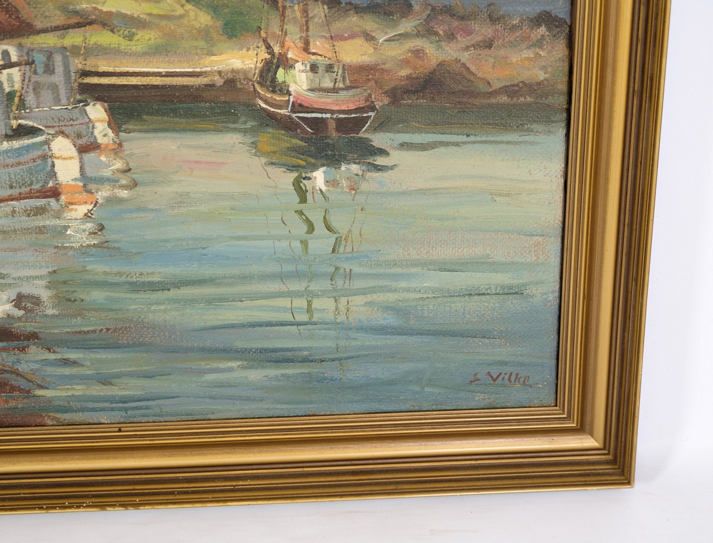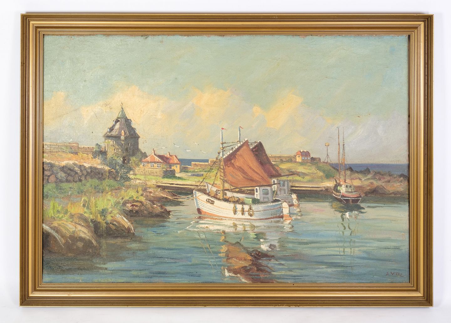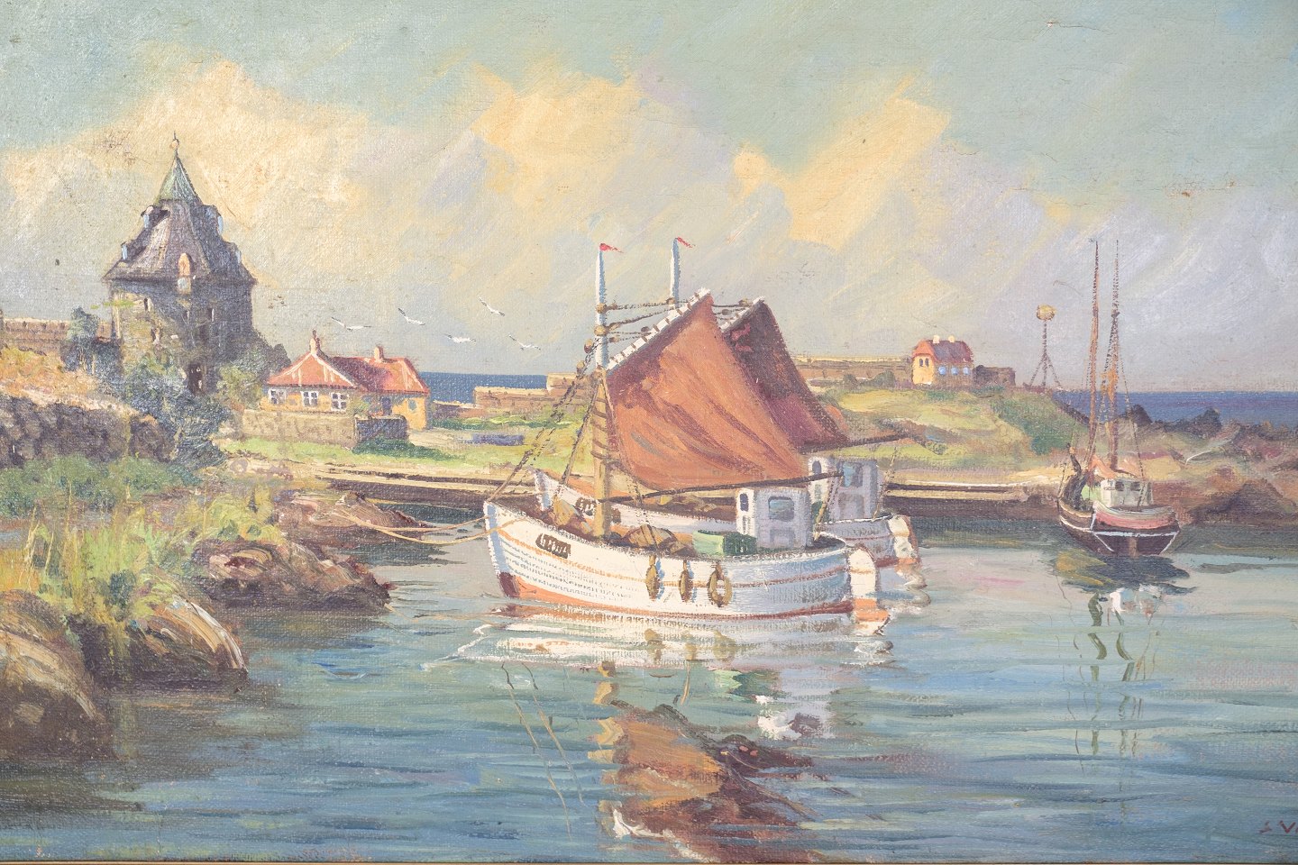 A large oil painting on canvas with motif of fishing boats near shore from around 1930s.