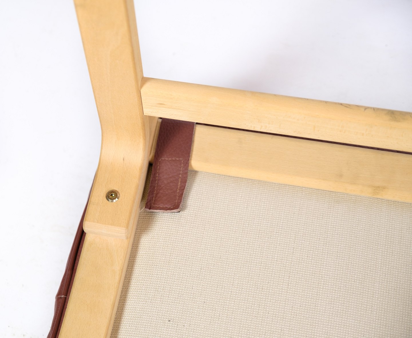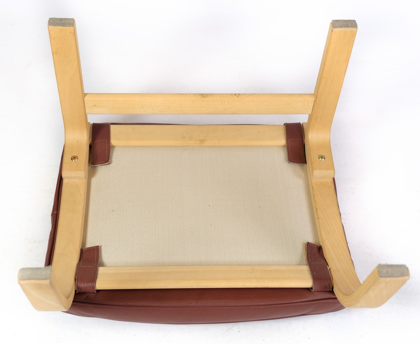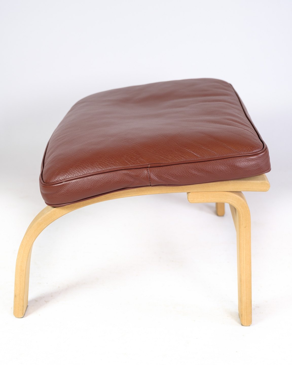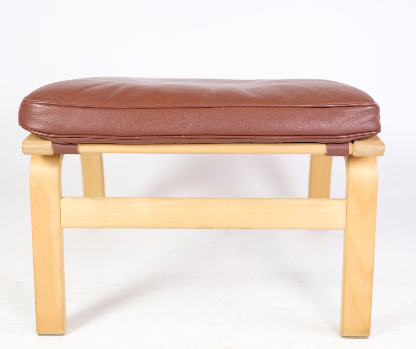 Den brune læderhynde i cognacfarve tilføjer varme og komfort til skamlen og er med til at skabe en indbydende atmosfære. Læderet er af høj kvalitet og vil med tiden udvikle en smuk patina, der kun tilføjer til skønheden i møblet.