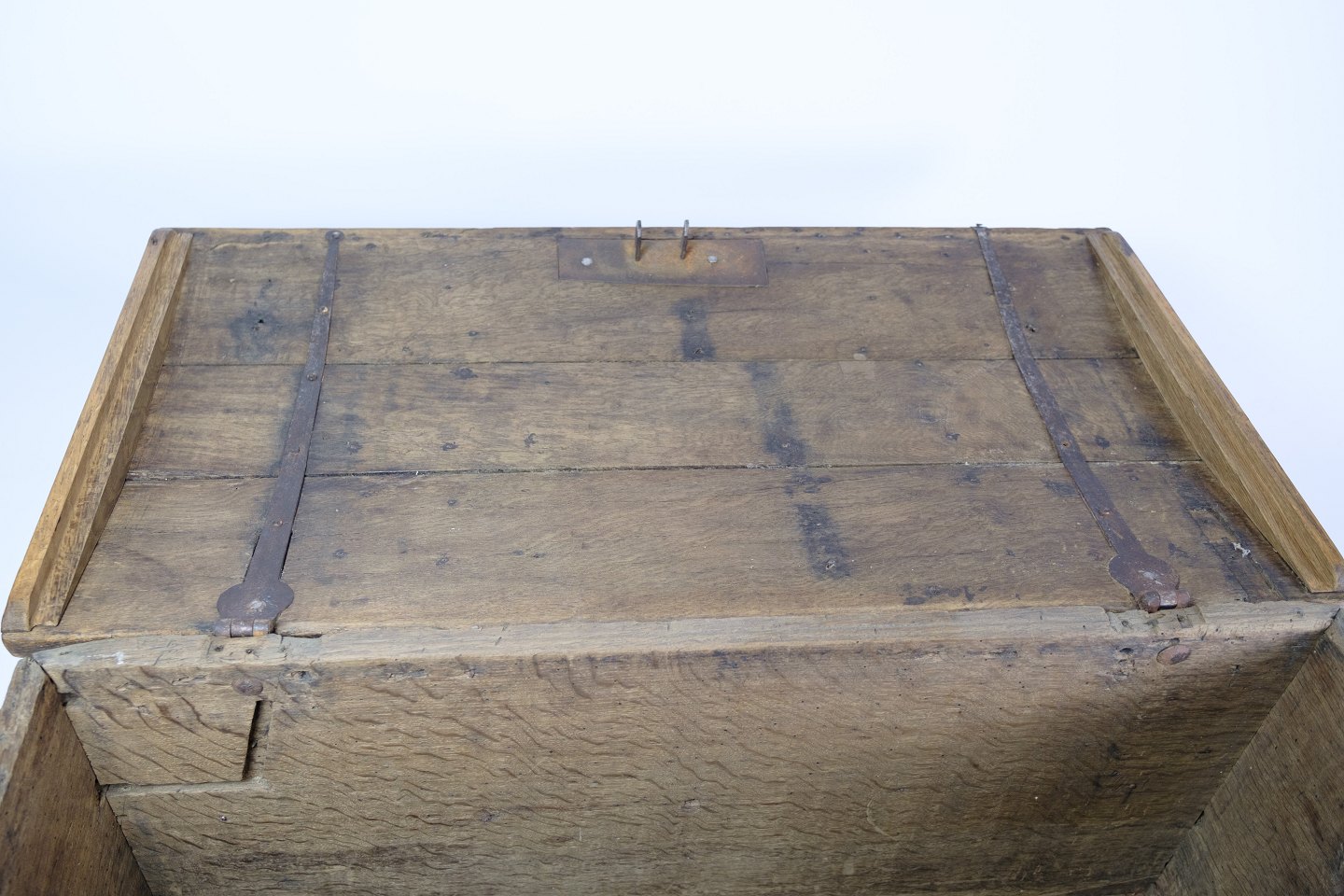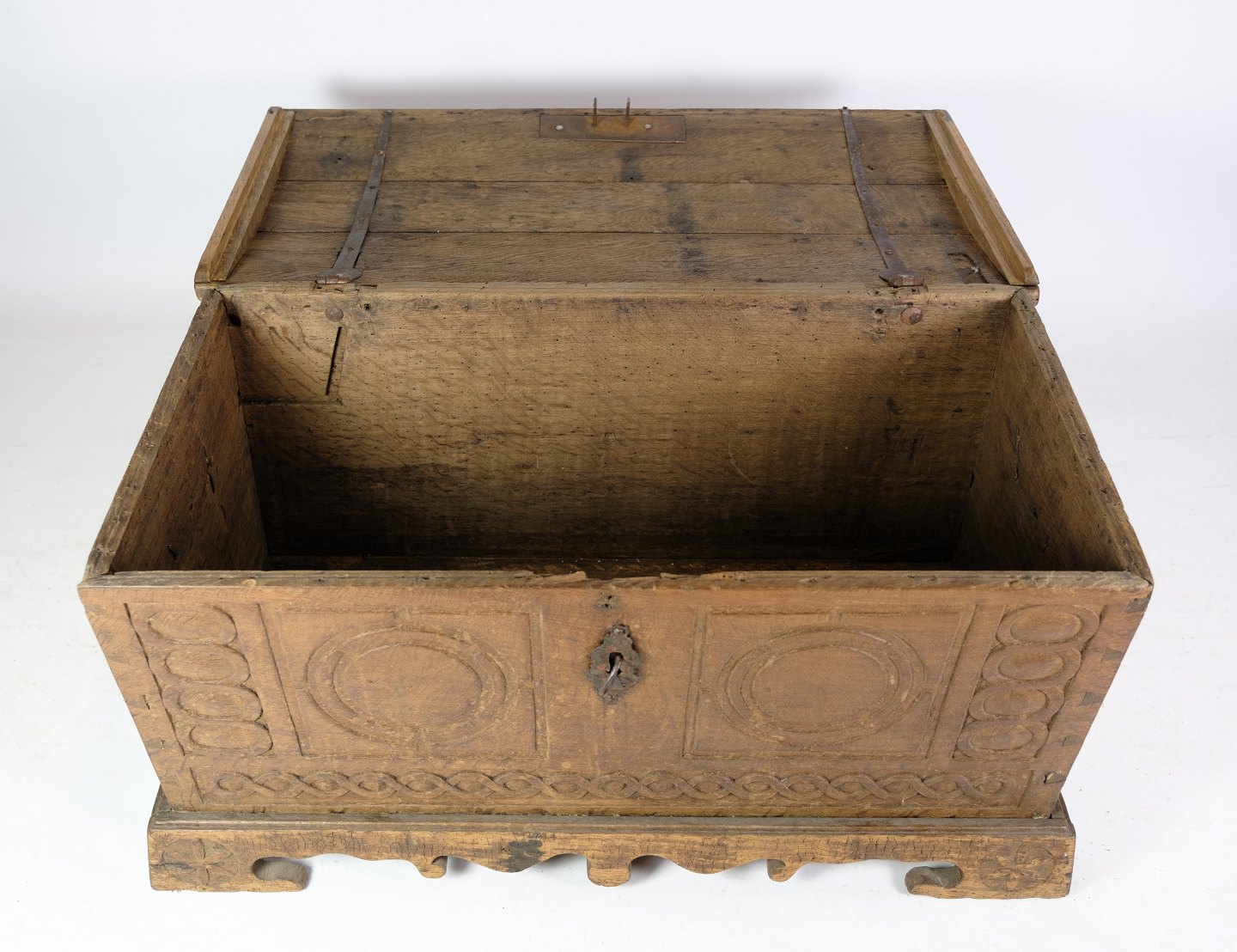 SolgtSønderjysk egetræs kiste med udskæringer fra omkring år 1760'erne. Sjælden størrelse i flot stand.