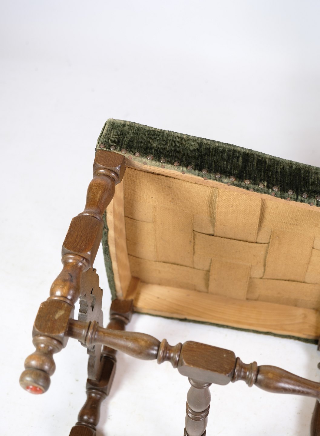 2 oak chairs in Renaissance style upholstered with green velor fabric from around the 1930s