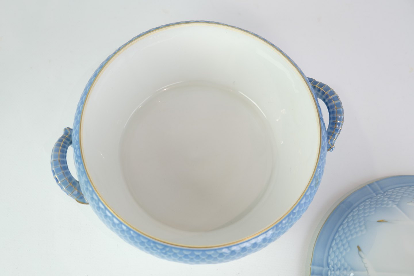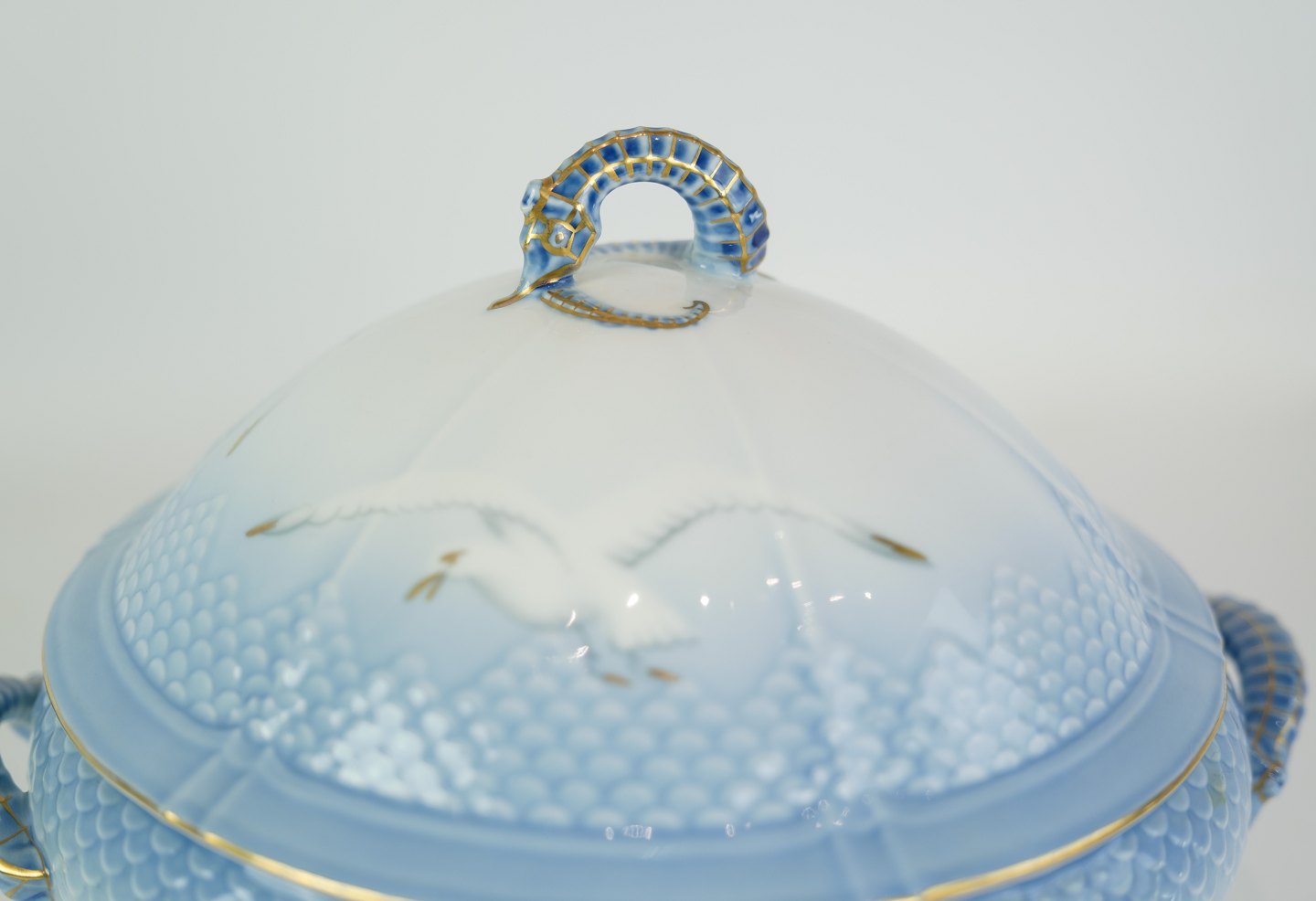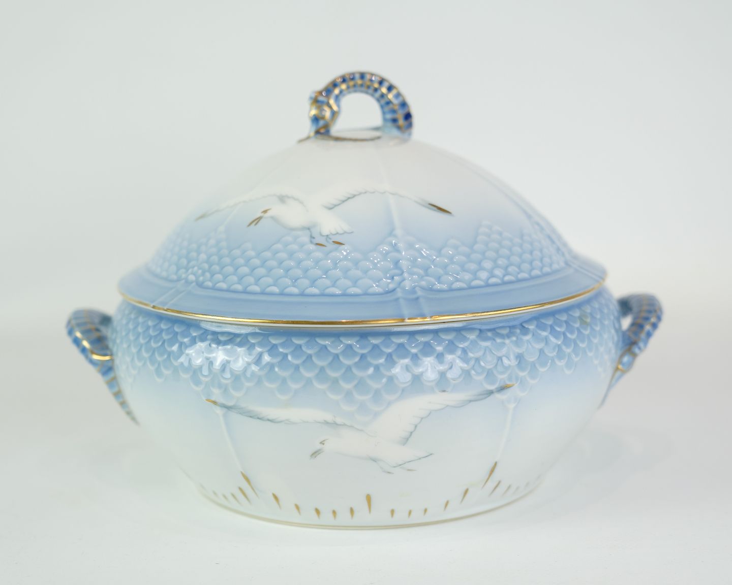 SolgtRund terrin fra Bing & Grøndahl i mågestel med guldkant.