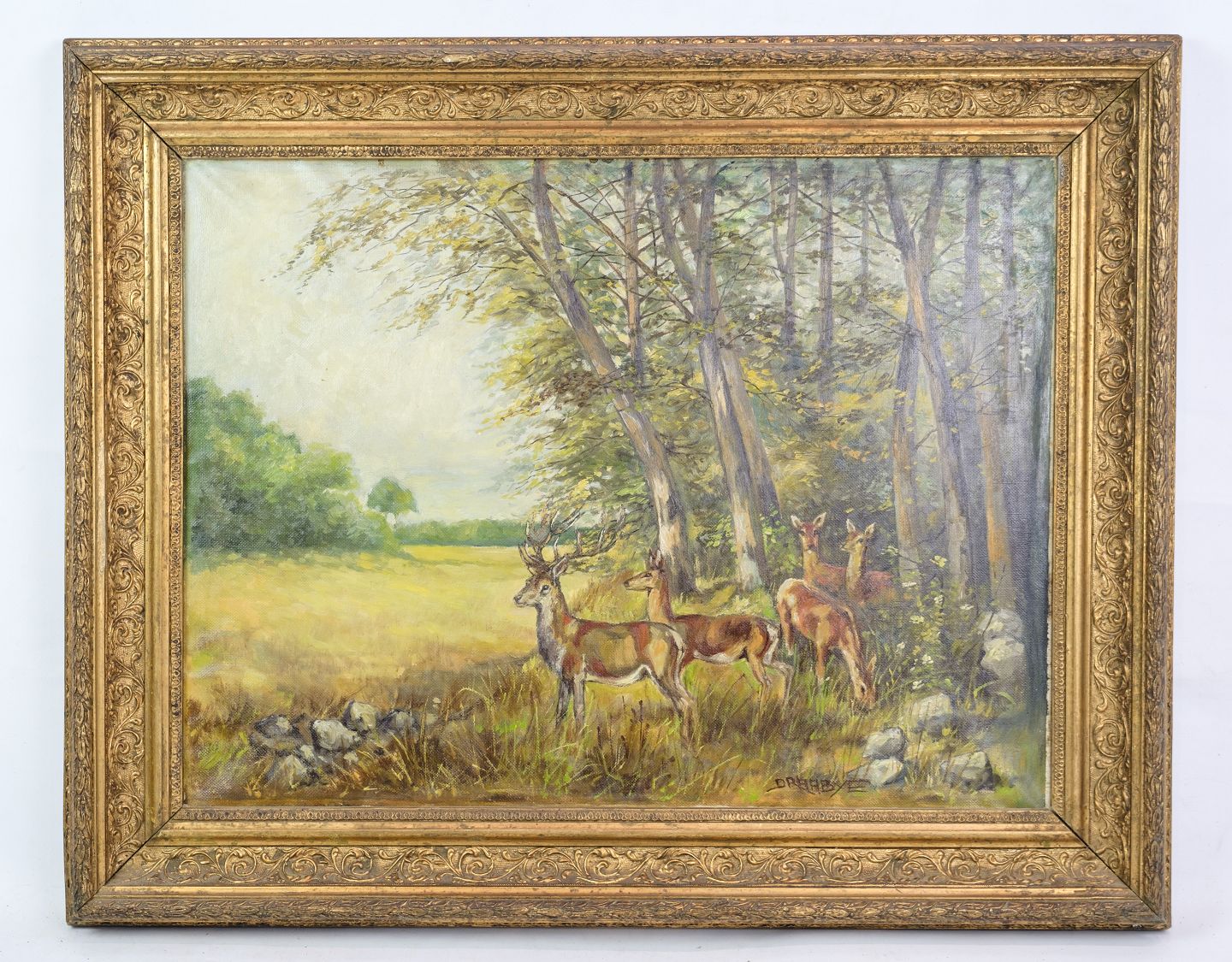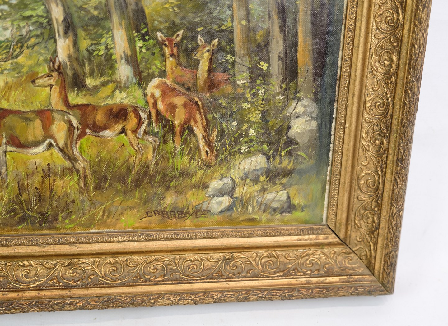 Oliemaleri på lærredet med motiv af dådyr med ramme af bladguld fra omkring 1940'erne. Signeret "Draabye" Lars.