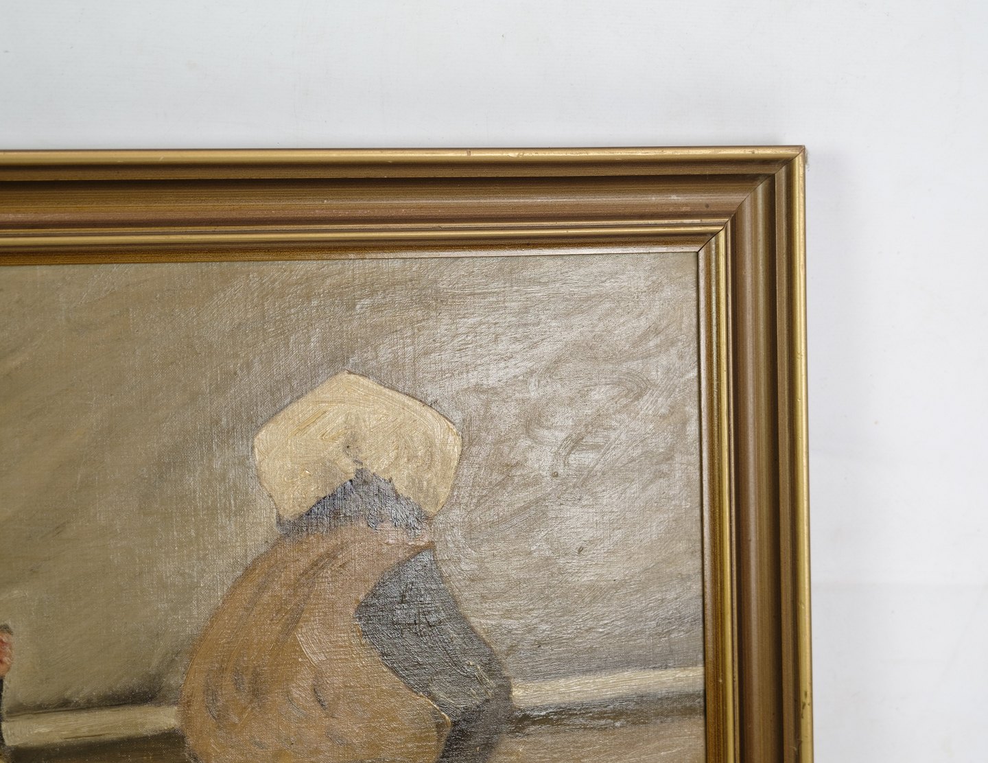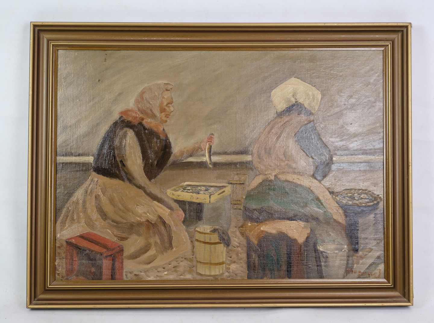 Oliemaleri malet på træplade med motiv af fiske koner fra gammelstrand i København fra omkring år 1930'erne. Signeret