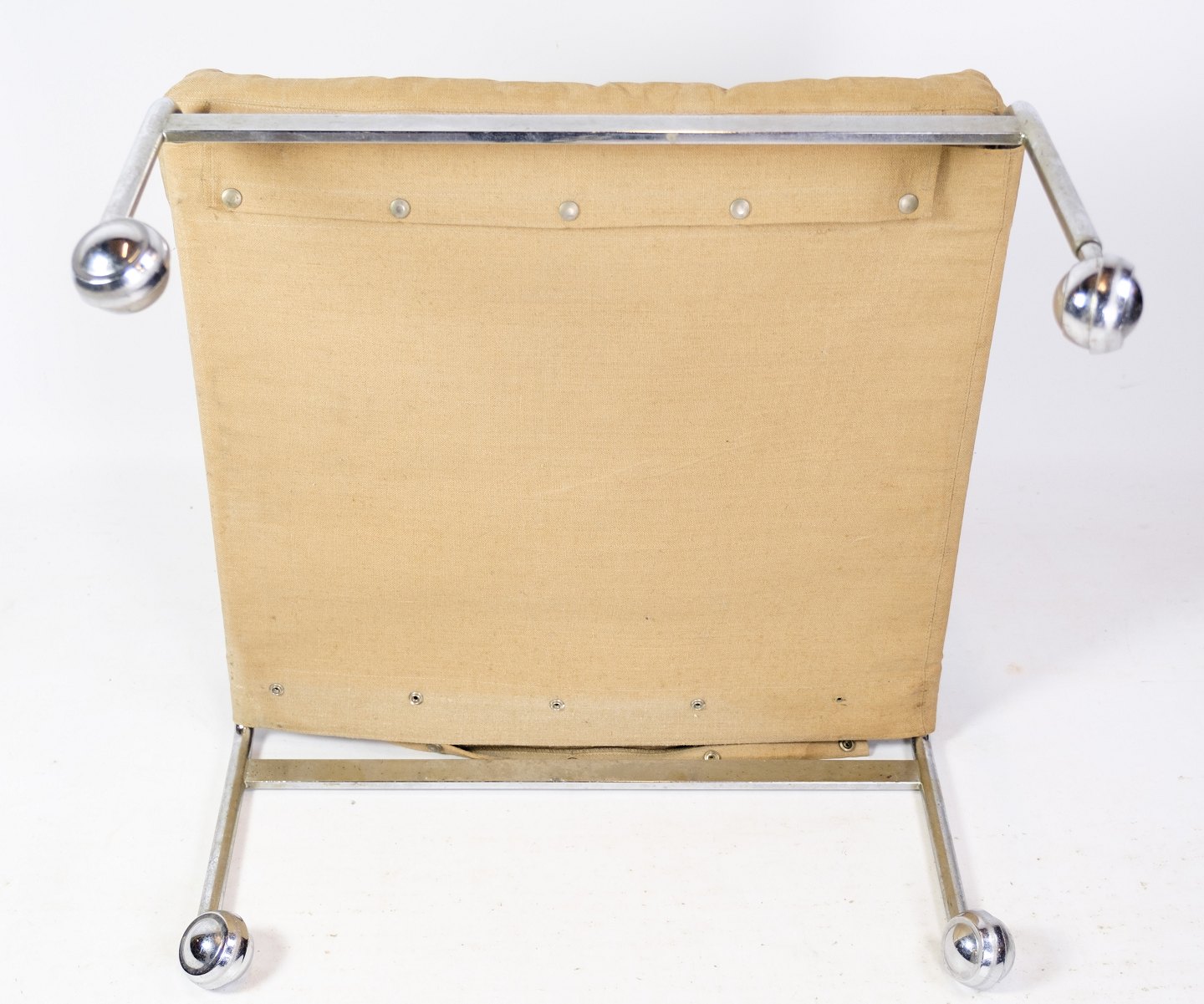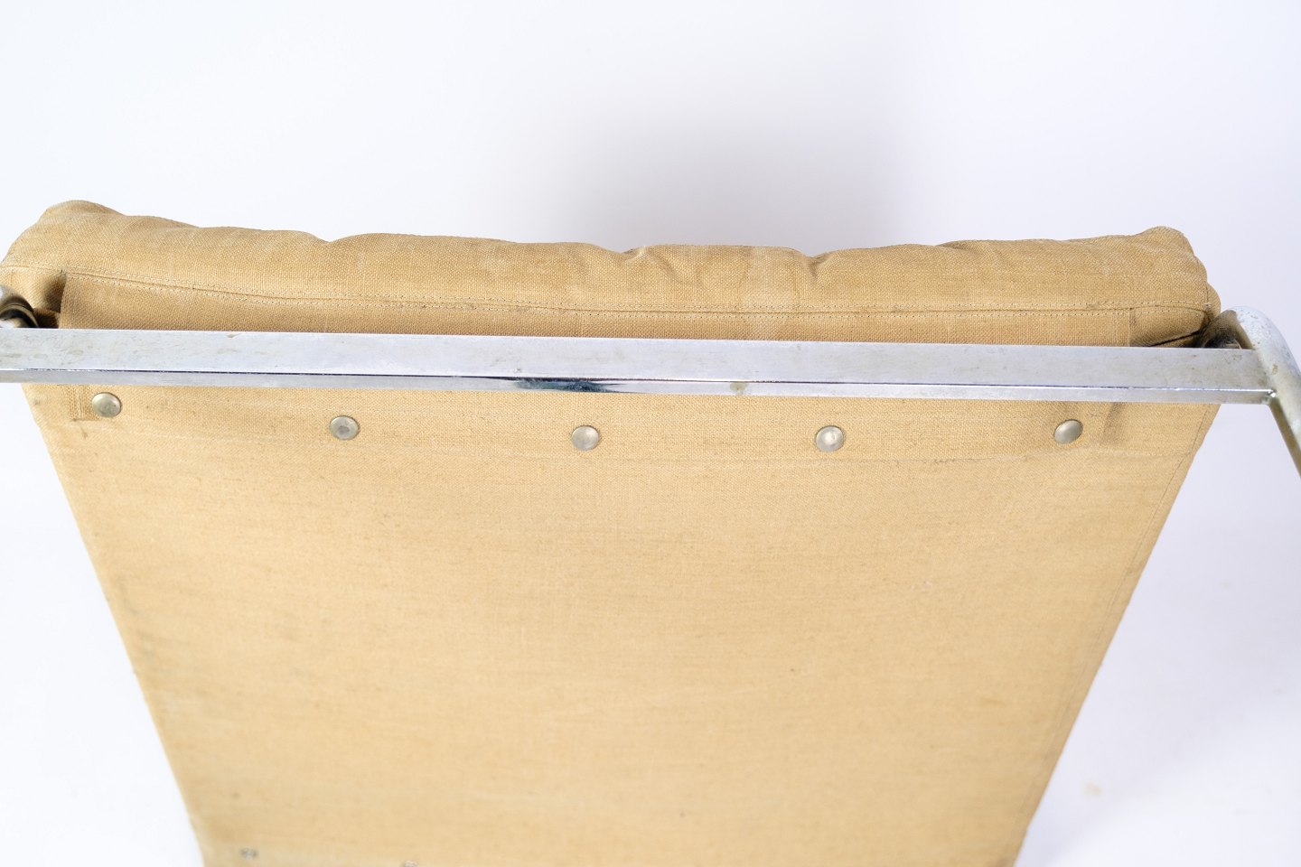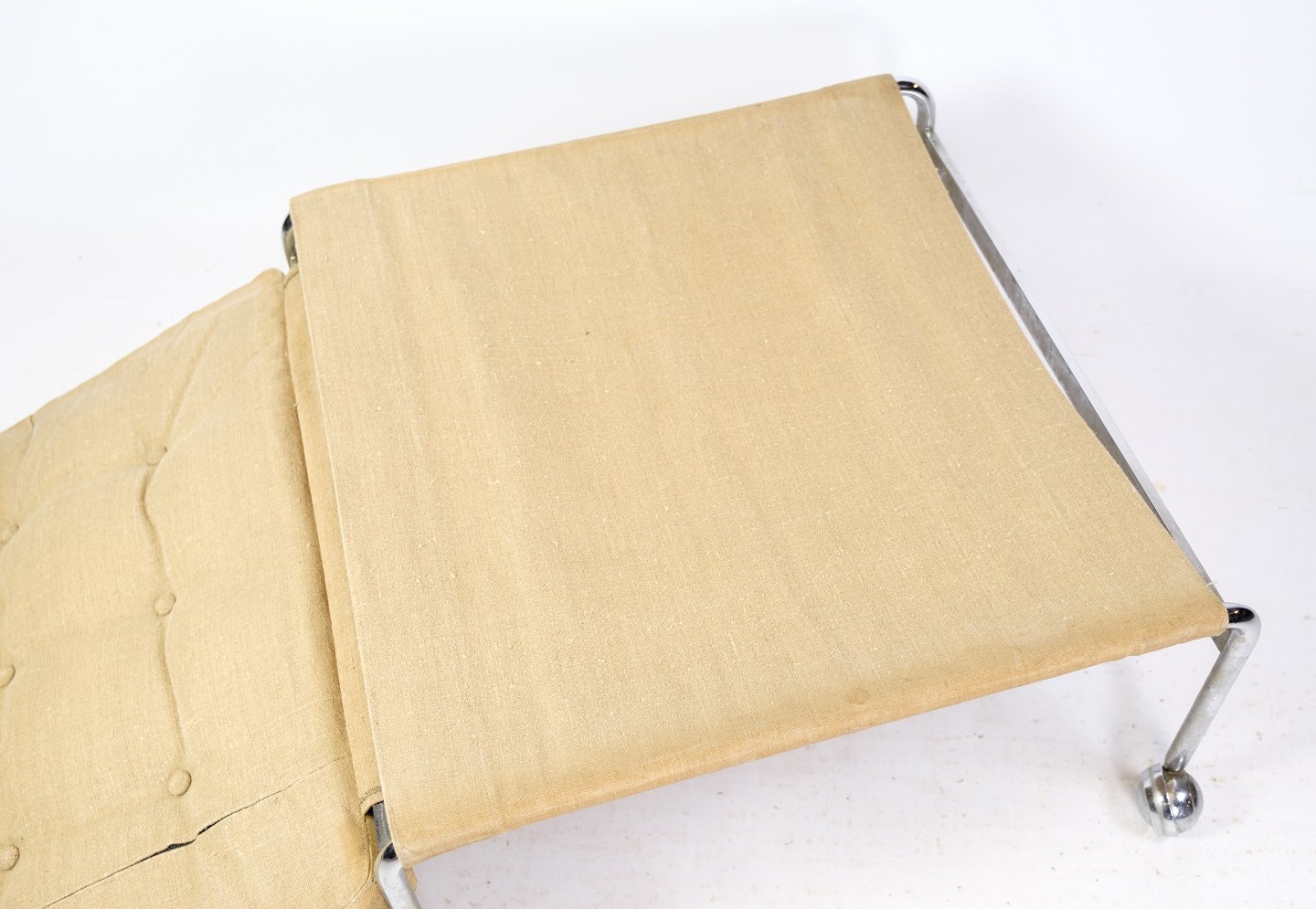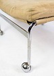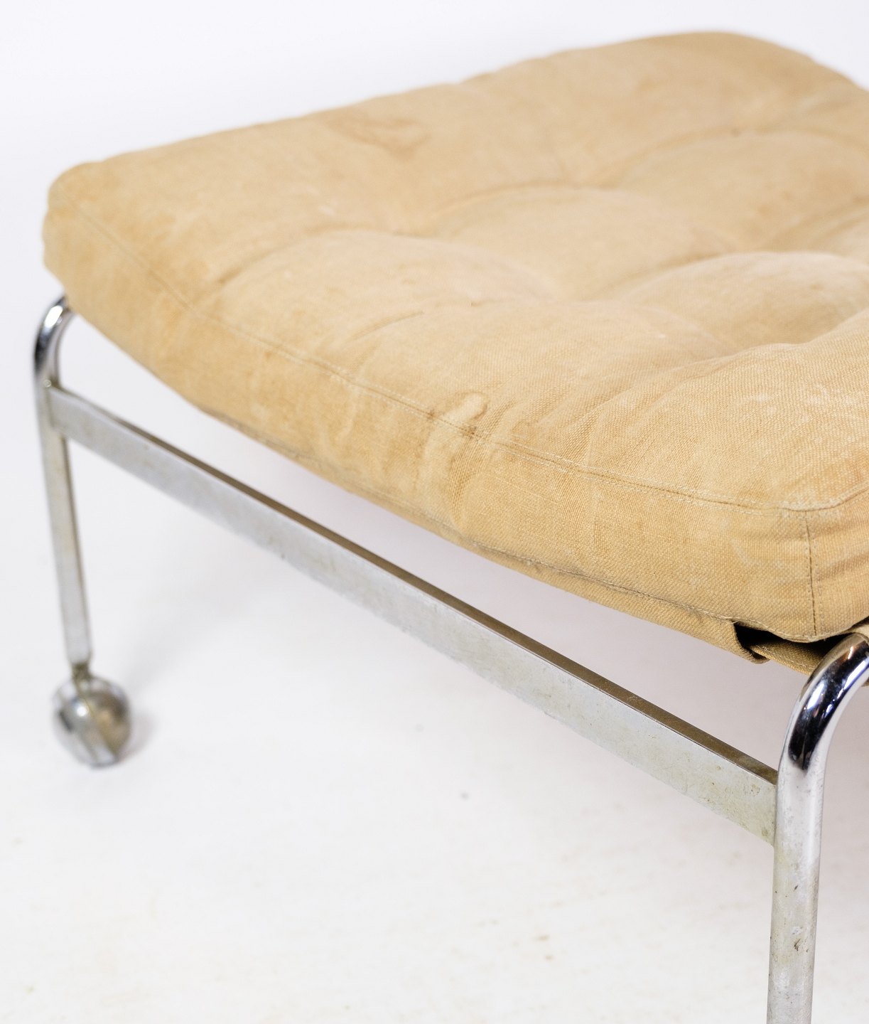 Skammel, model Karin, designet af Bruno Mathsson (1907-1988) fra omkring 1960'erne. Skamlen er betrukket med lyst knapsyet hynder af stof. Fremstår med brugsspor.
