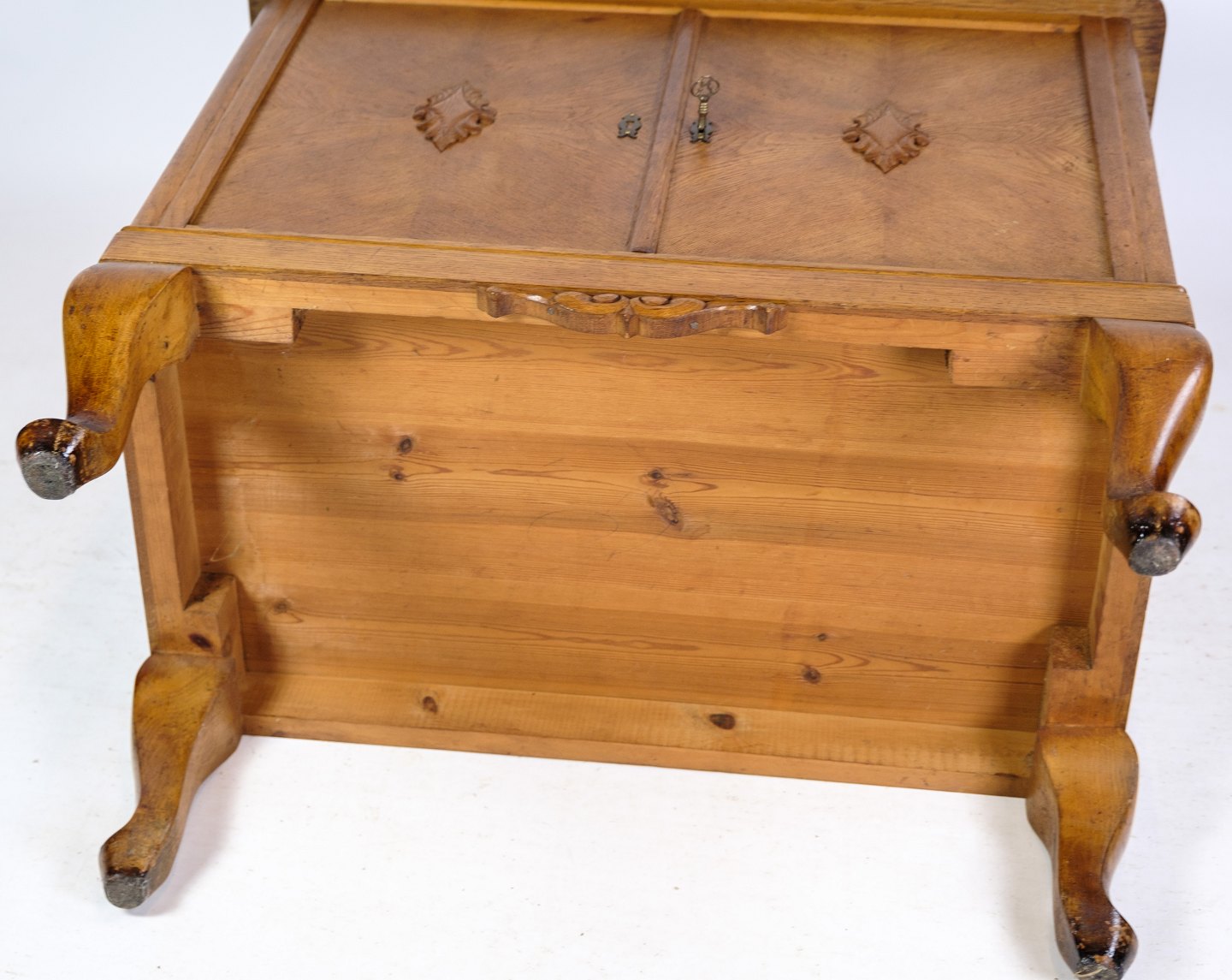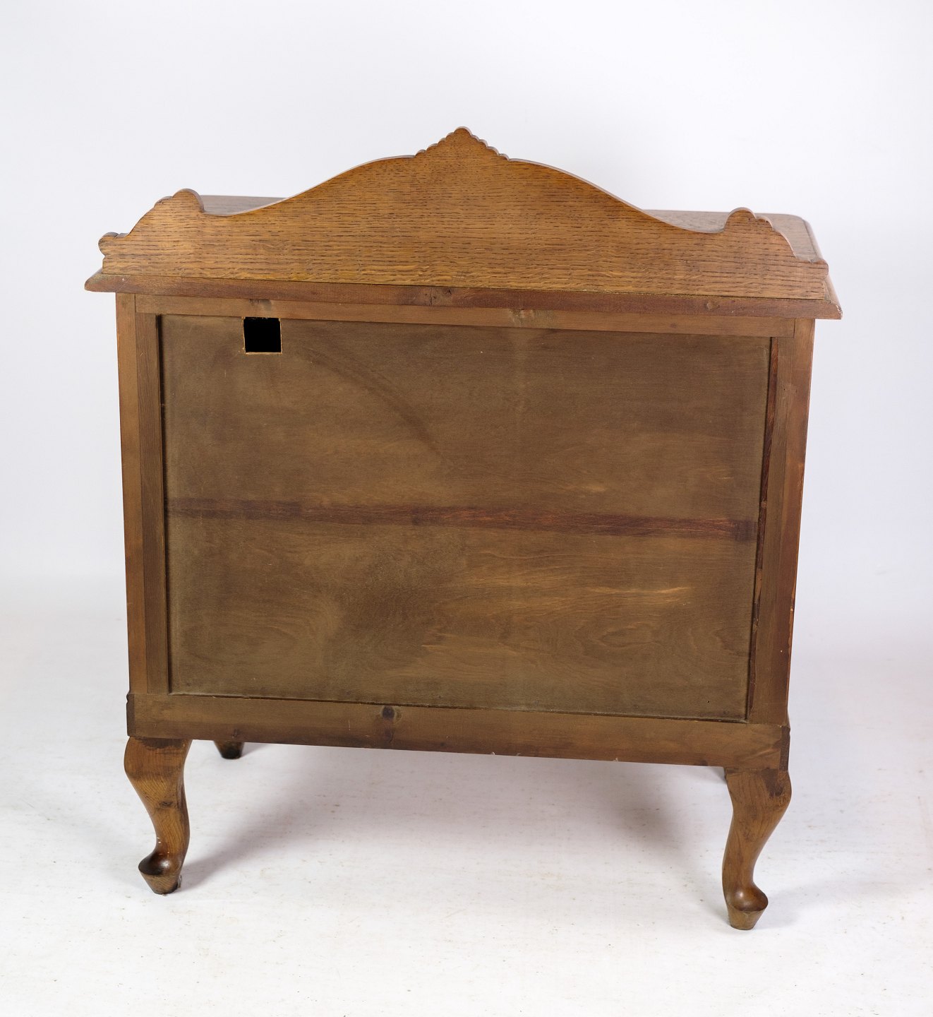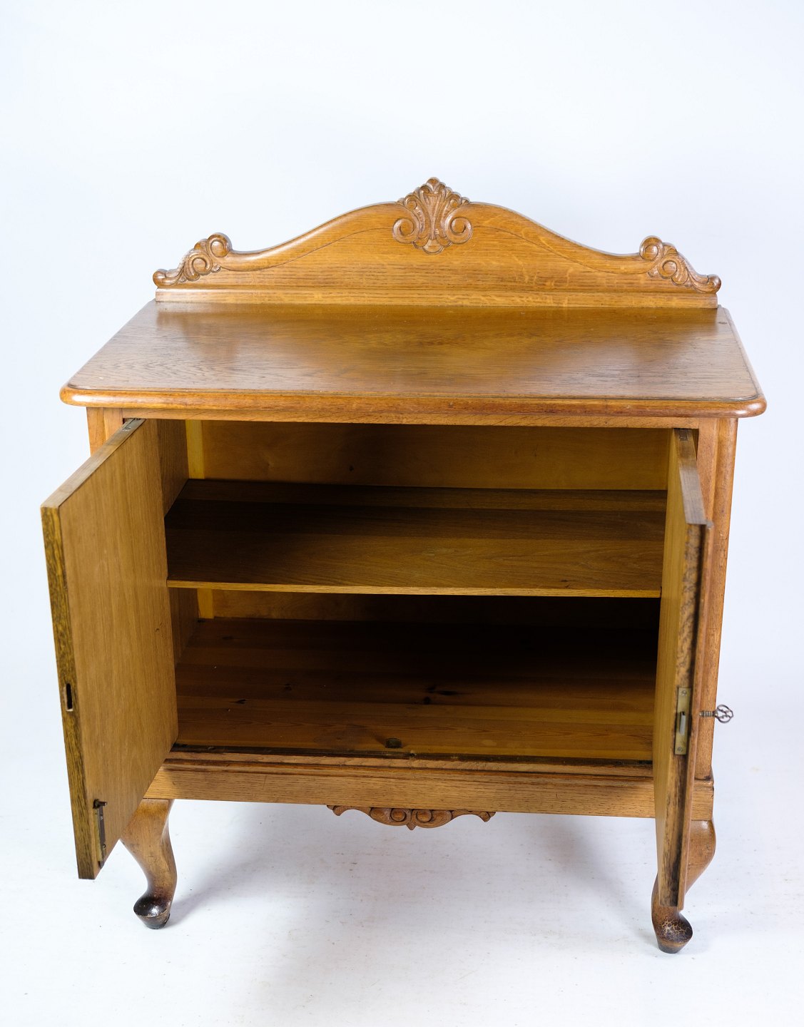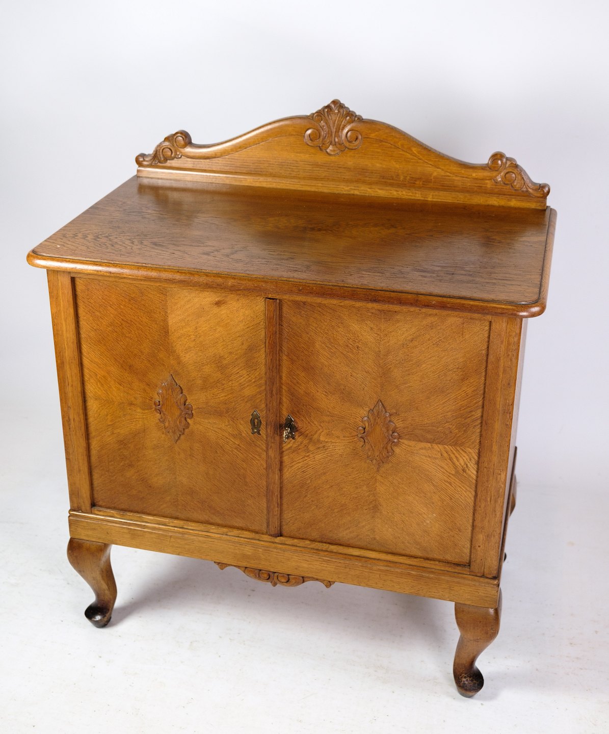 Lille skænk i egetræ med 2 låger og udskæringer fra omkring 1930’erne.