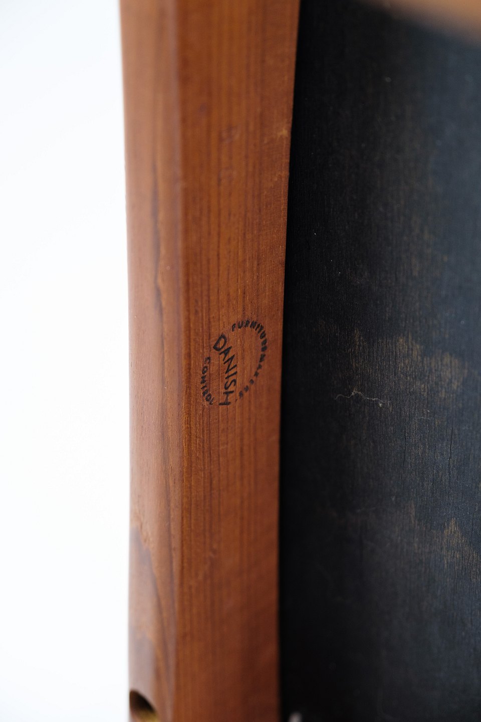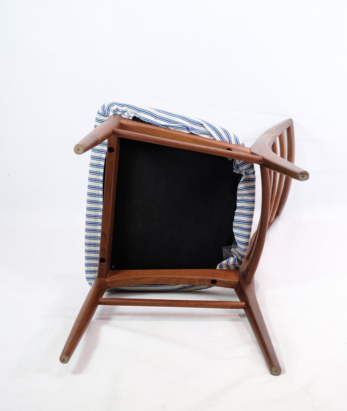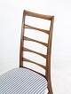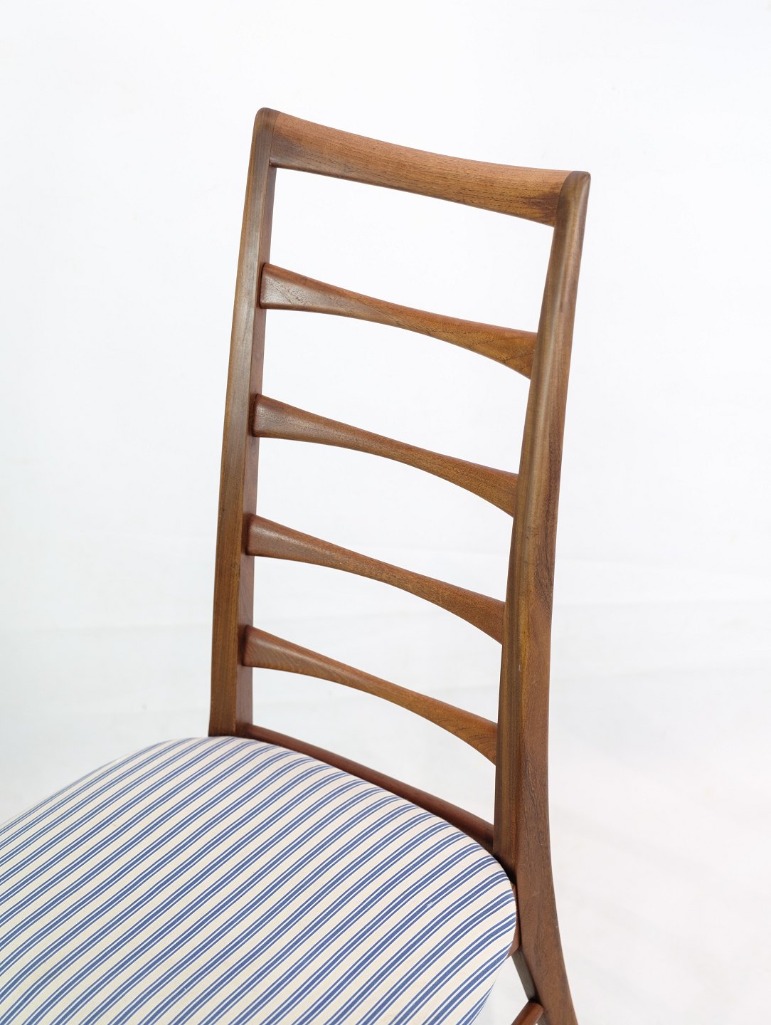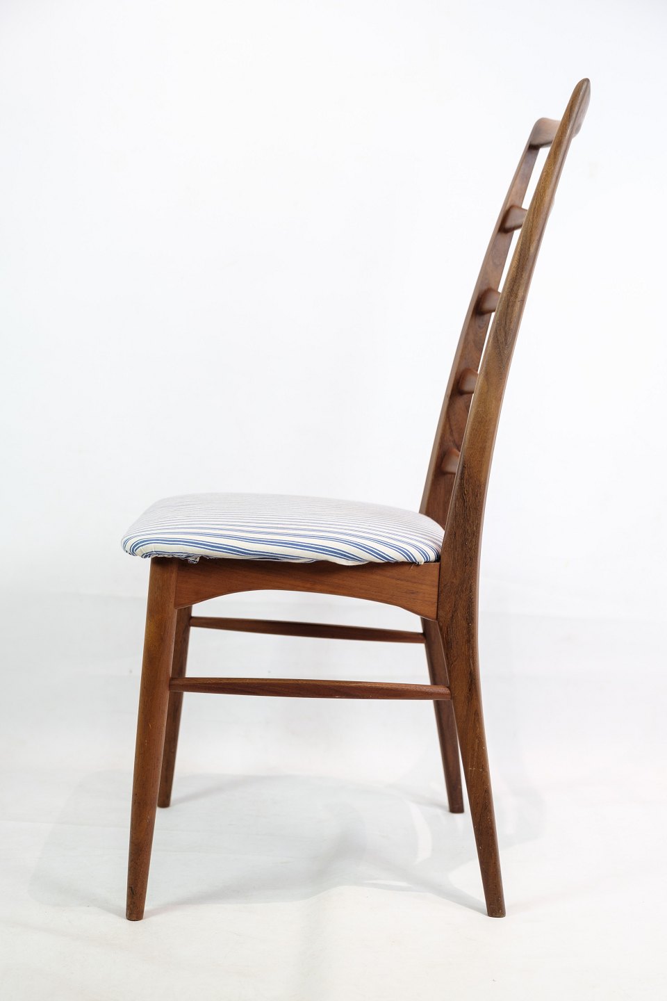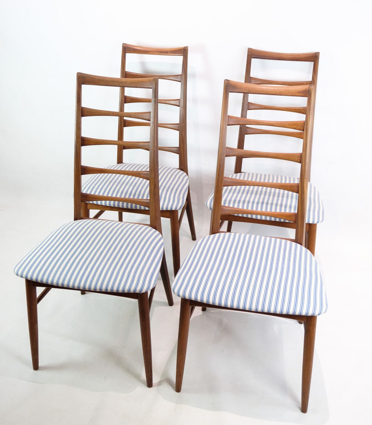 Sæt af fire stole, model "Lis", designet af Niels Koefoed i teak fra omkring 1960'erne. Stolene er polstret med flot stribet stof.