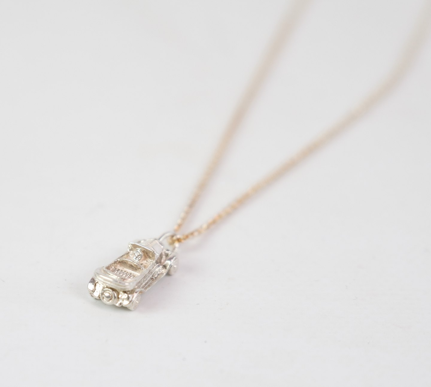 Vedhæng i 925 sølv, med motiv af en bil. Halskæden kan tilkøbes for 1950 DKK, som er 14 karat guld. Fås også i sølv. Kontakt venligst for dette.