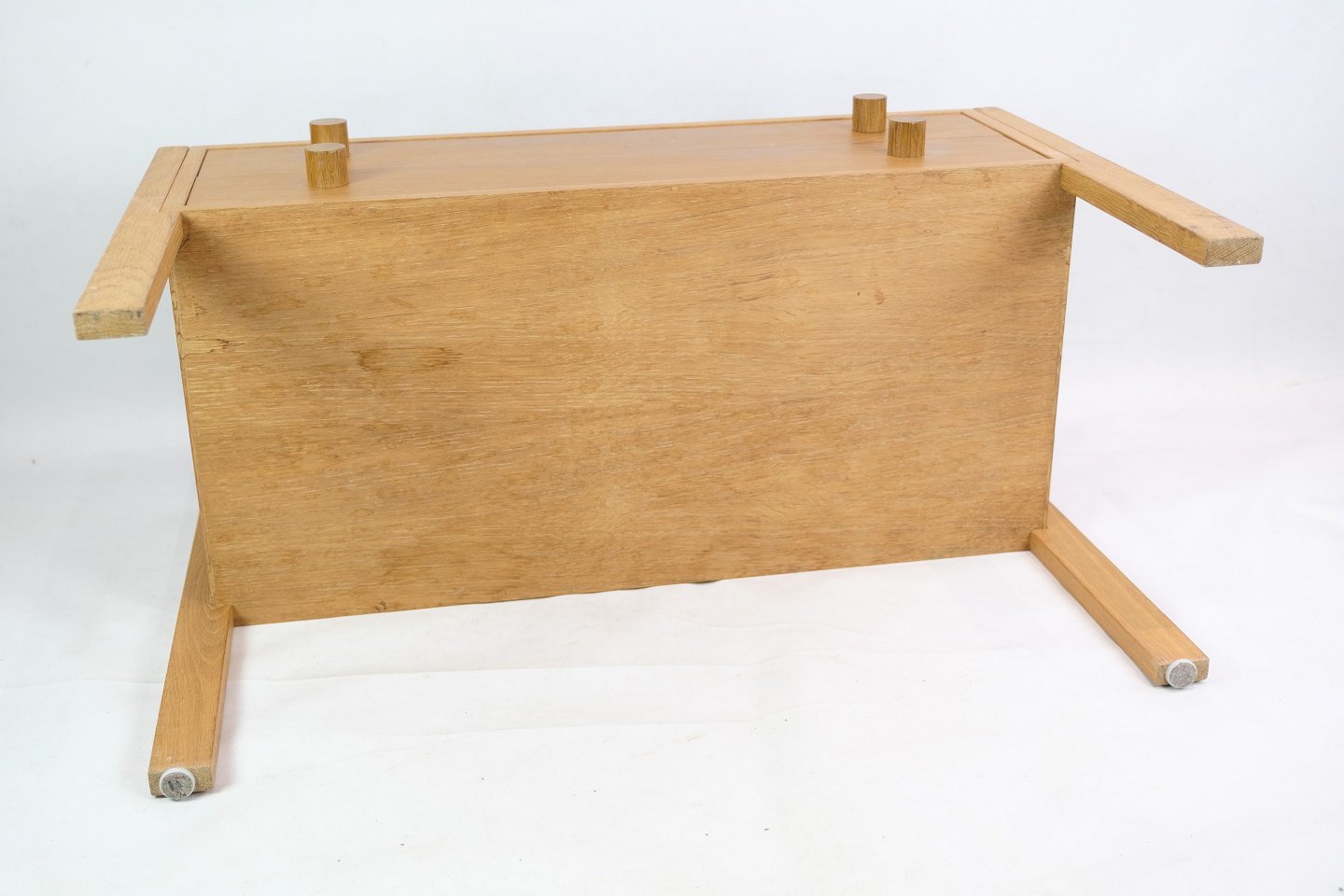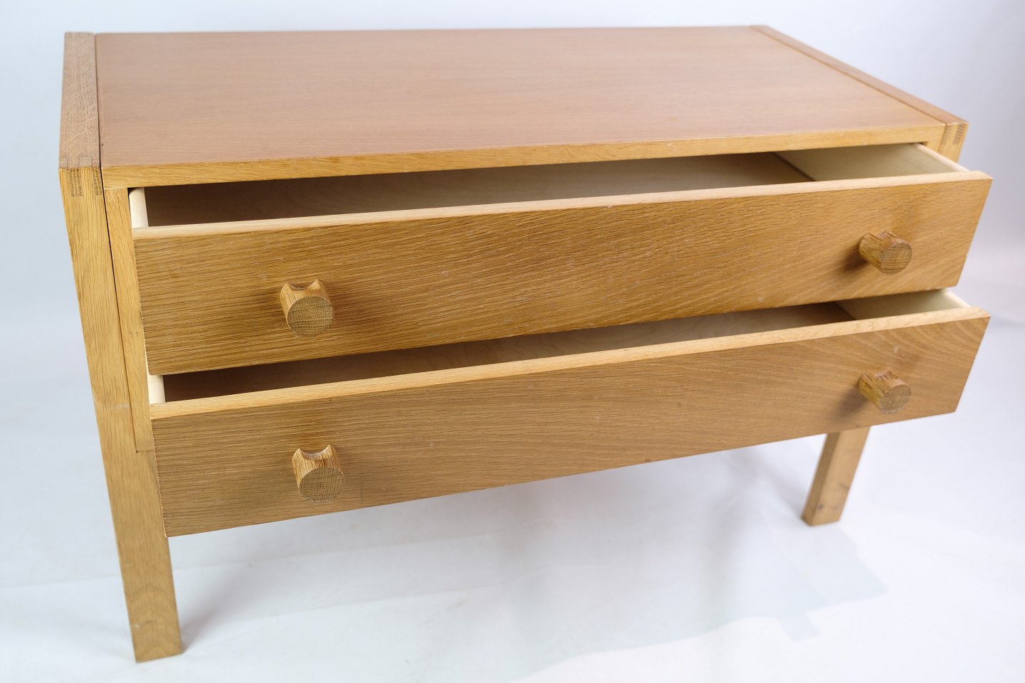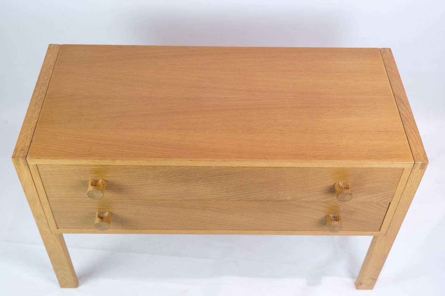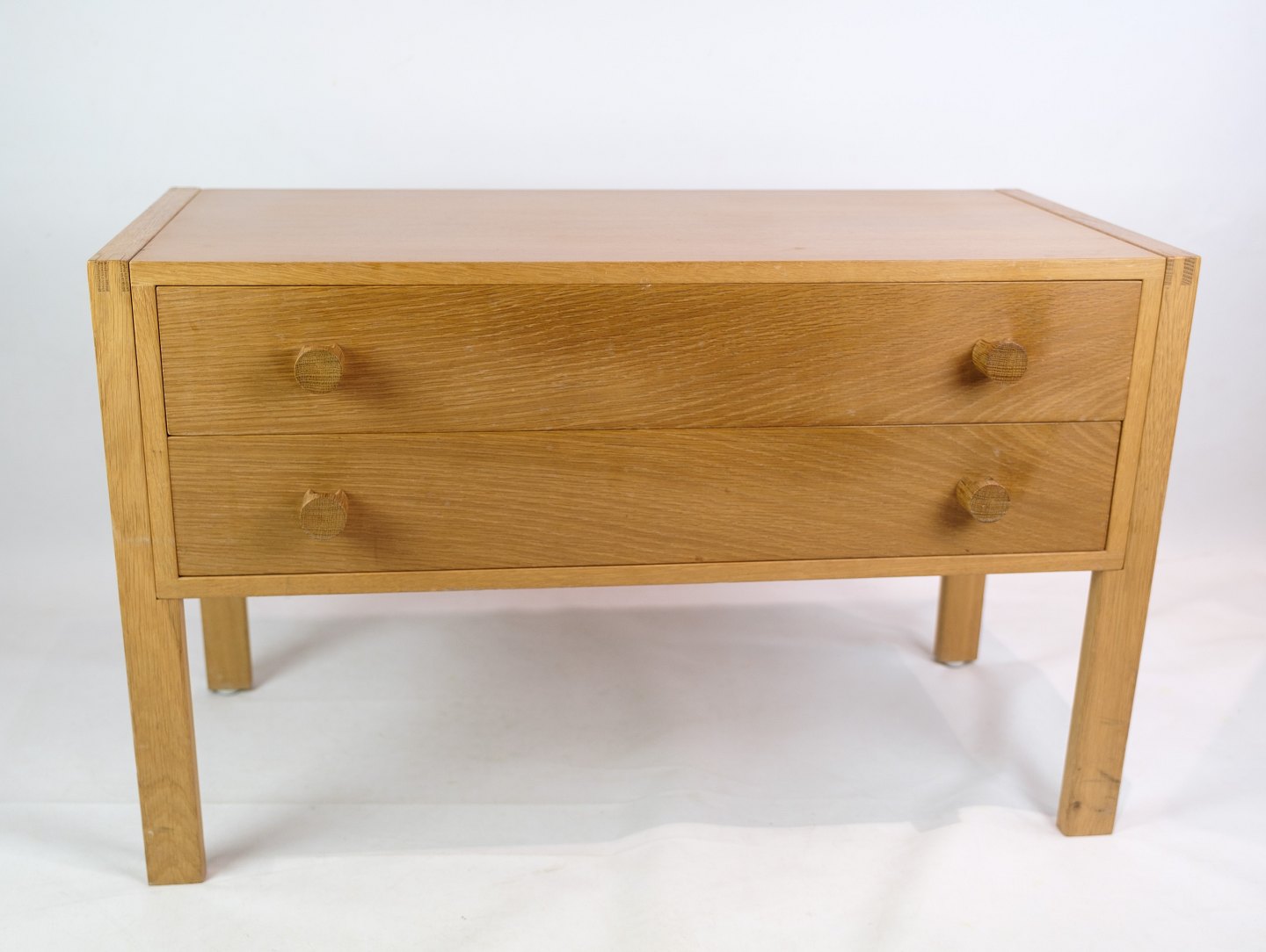 SoldOblong chest of drawers in oak with 2 drawers and wooden handles of Danish furniture design from around the 1960s. The furniture appears in very fine used condition and is well suited to be both entrance furniture, as well as storage furniture.