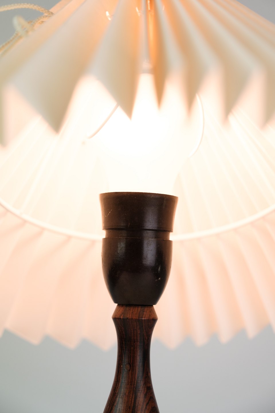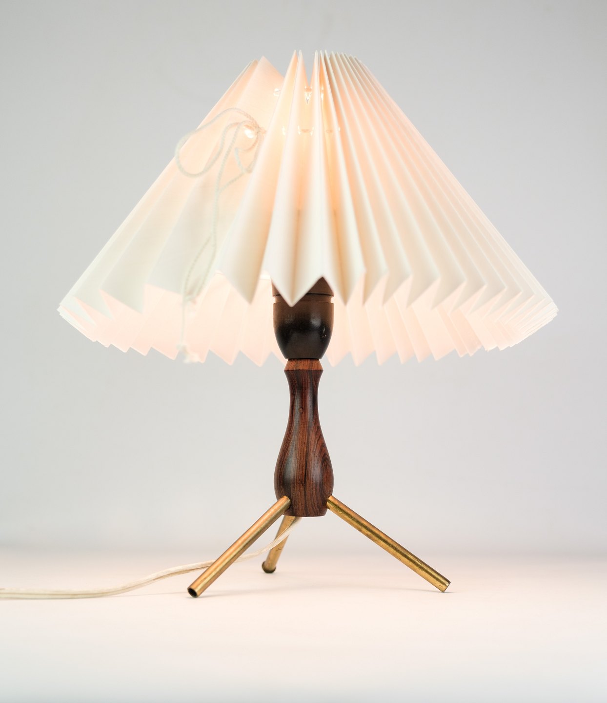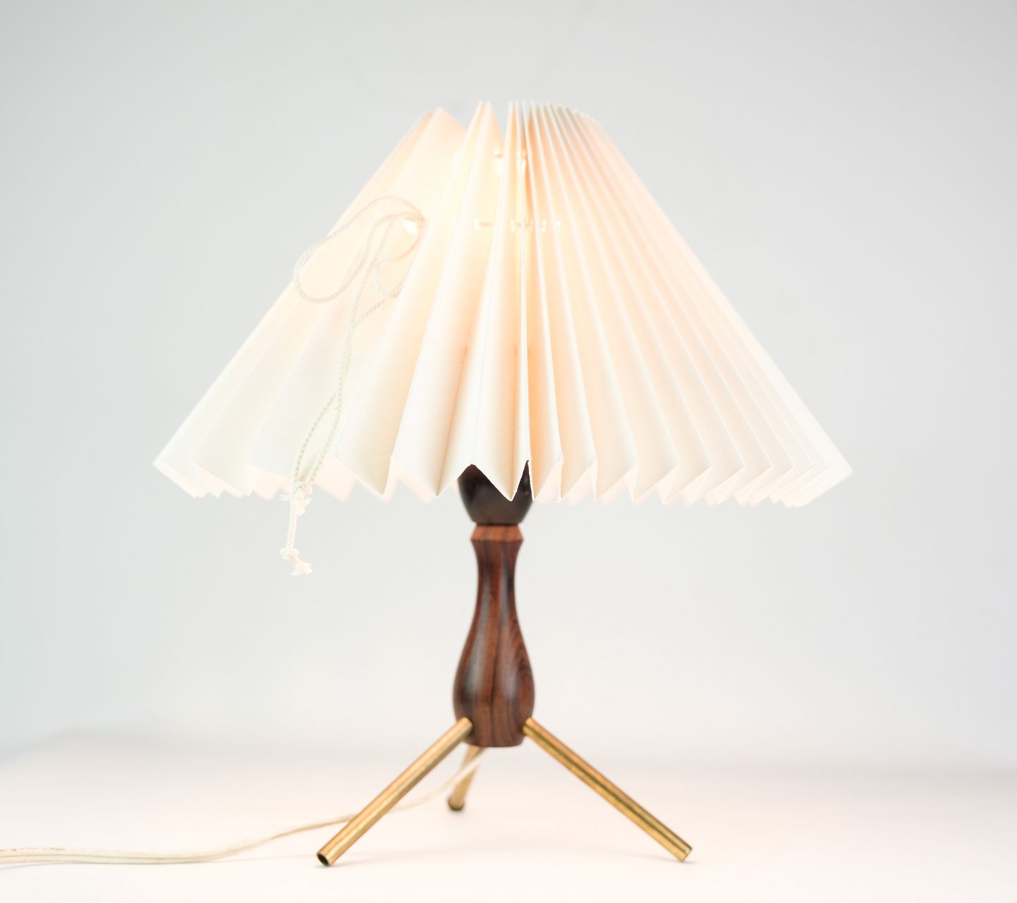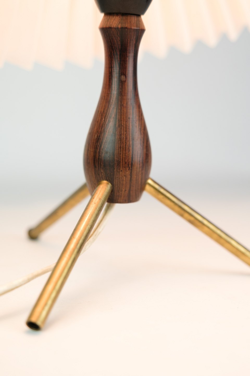 SolgtTrebenet bordlampe i palisander af dansk design med messing ben fra omkring 1960'erne. Lampe har en utrolig smuk lampeskærm. Generelt en lampe af meget høj kvalitet