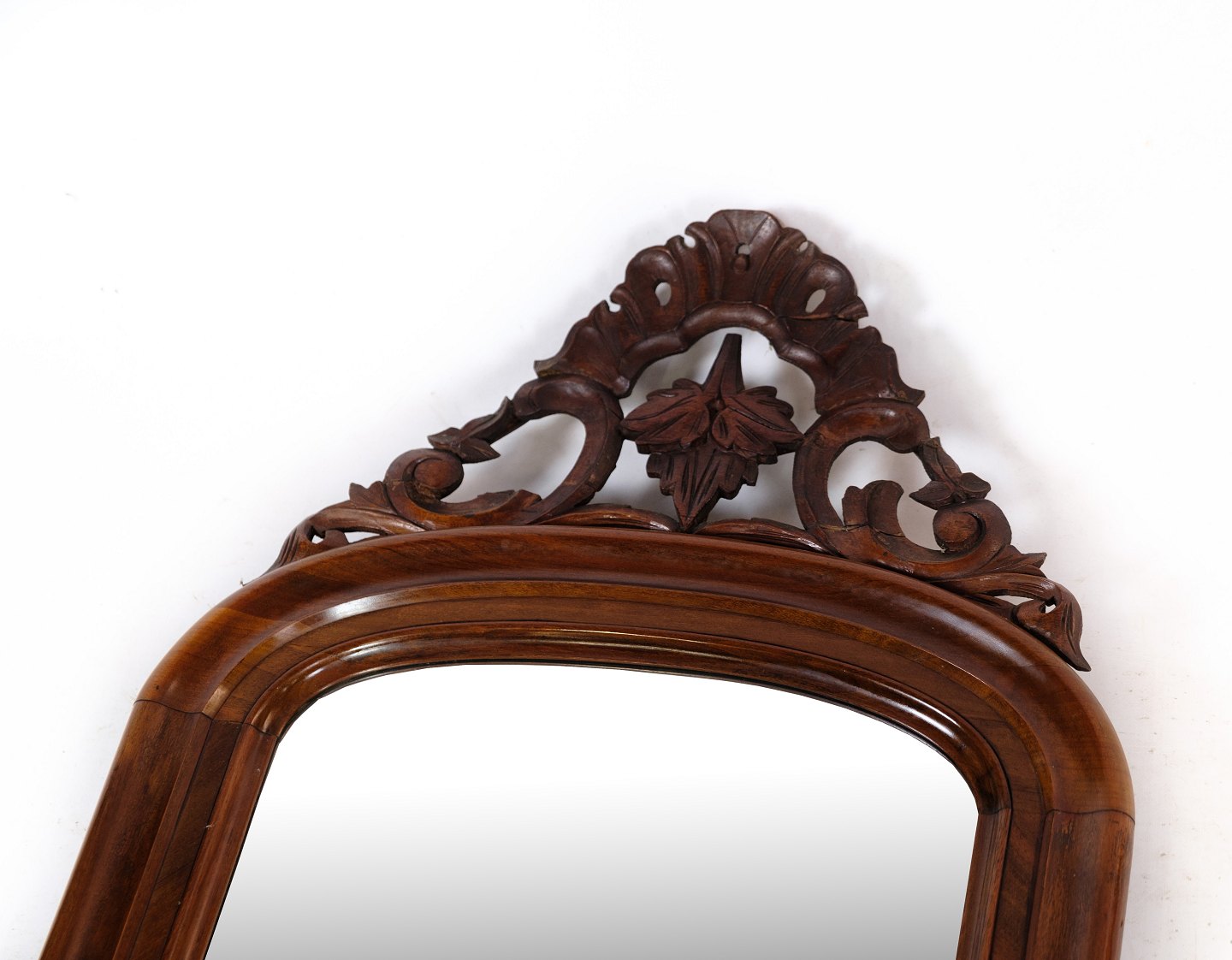 SoldAntique mirror in mahogany wood, decorated with carvings from around the 1860s.