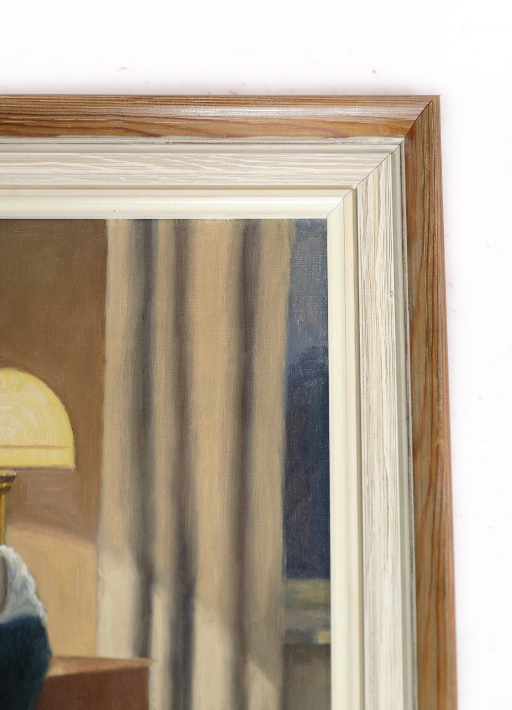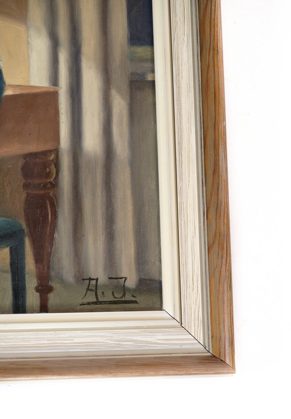 SoldOil painting on canvas by Aage Jessen, an interior picture with motif at the piano exhibited at Charlottenborg from around the 1950s.