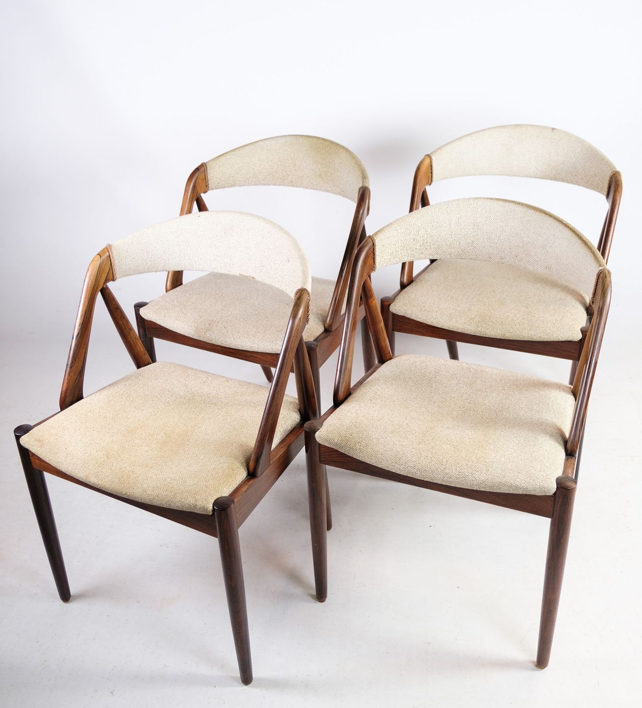 Set of 4, model 31, dining room chairs designed by Kai Kristiansen from around the 1960s. The chairs are made by Schou Andersen with rosewood frames in very fine condition. The fabric needs reupholstering, which we also do in our own workshop. Write a message so we can talk about which fabric you want to wear for an additional price.