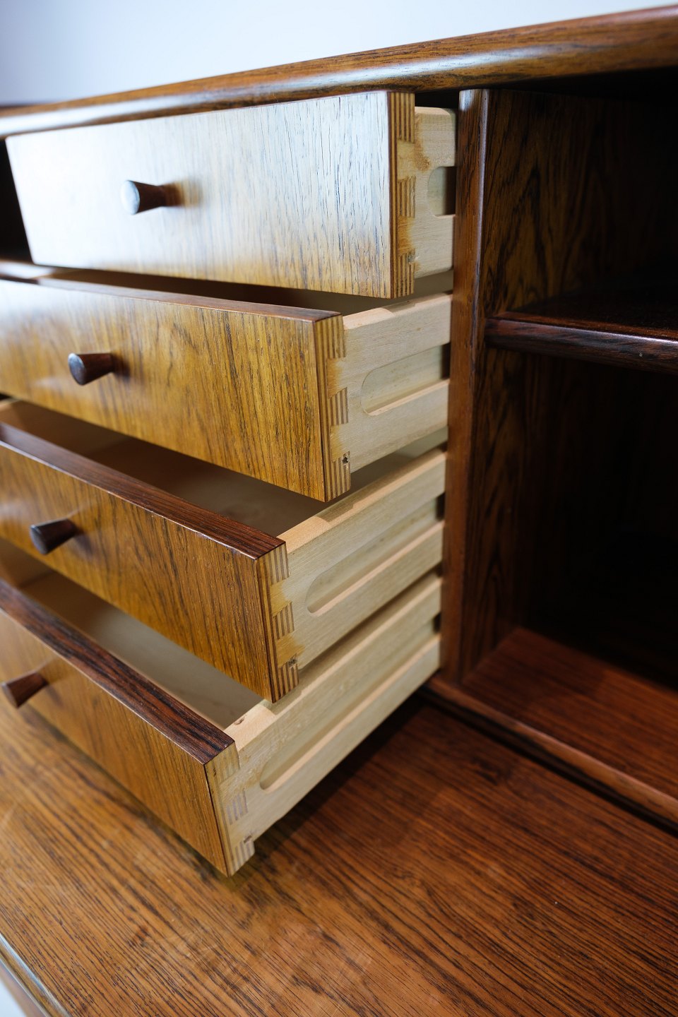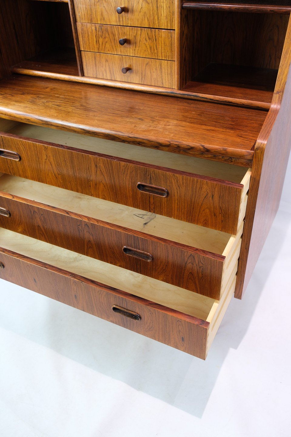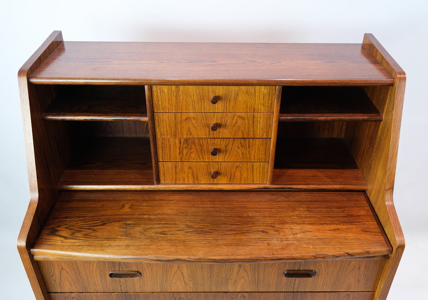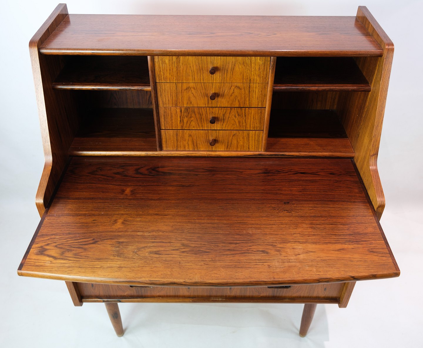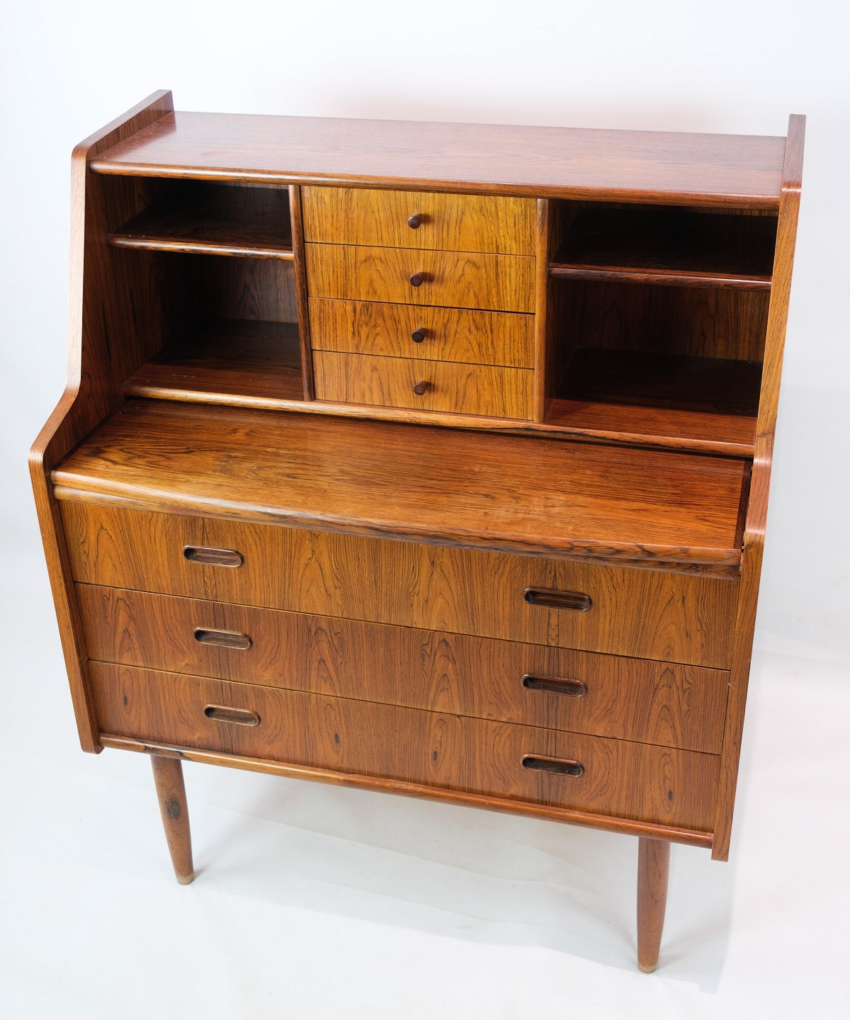 Small chatol in rosewood of Danish design from around the 1960s. Looks incredibly nice in the stand with 3 drawers at the bottom and 4 drawers at the top with shelves on each side. In addition to this, the chartolette has a pull-out.