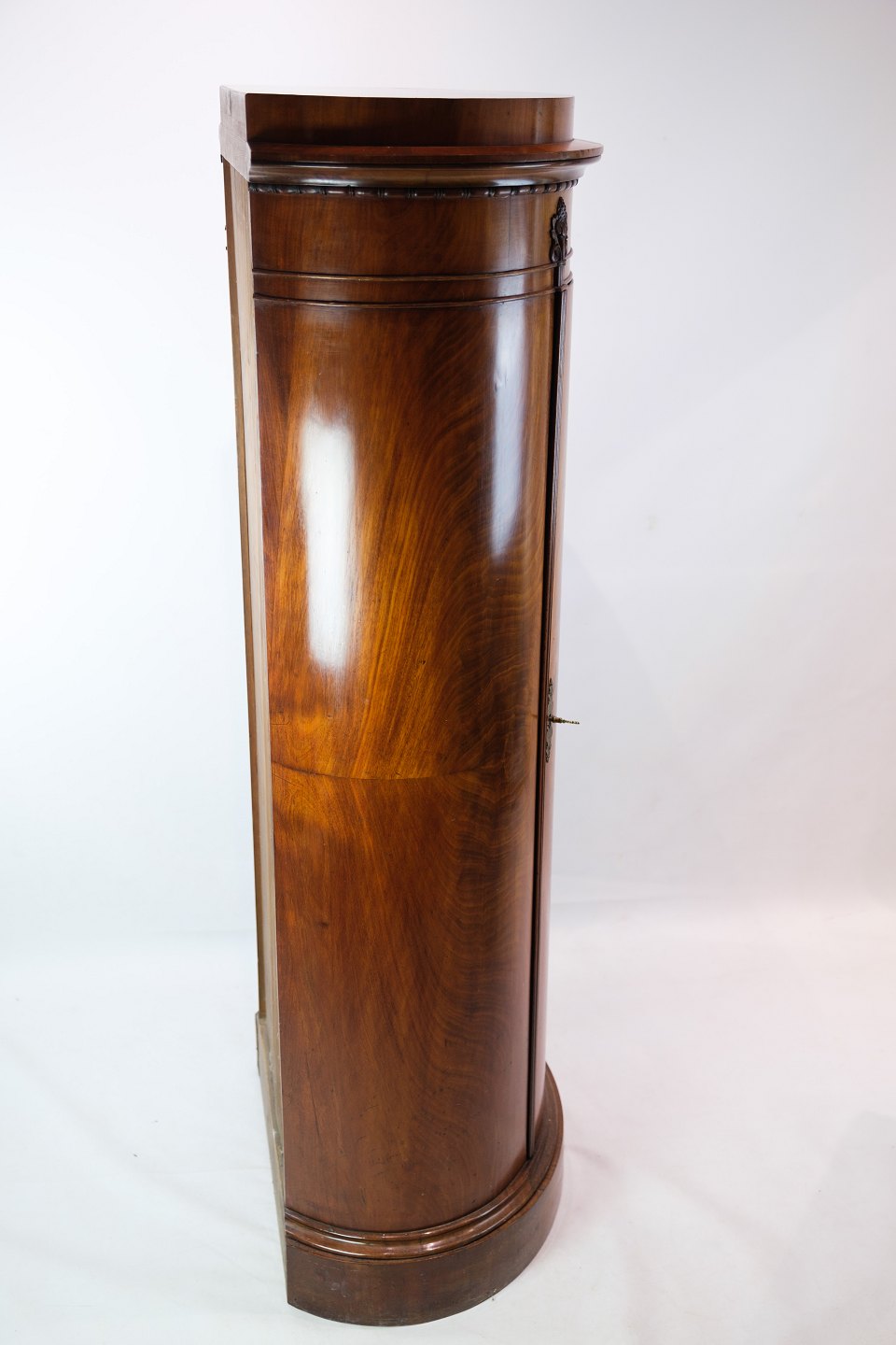 Antikt ovalt piedestalskab i mahogni med udskæringer og smuk struktur i træet fra omkring år 1840'erne.