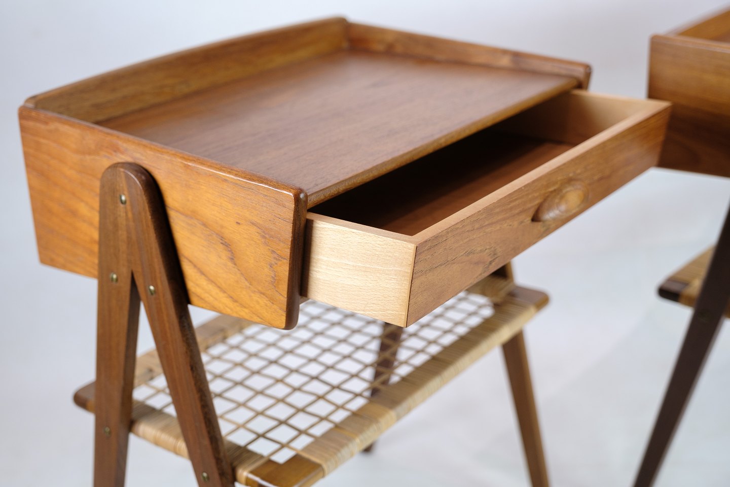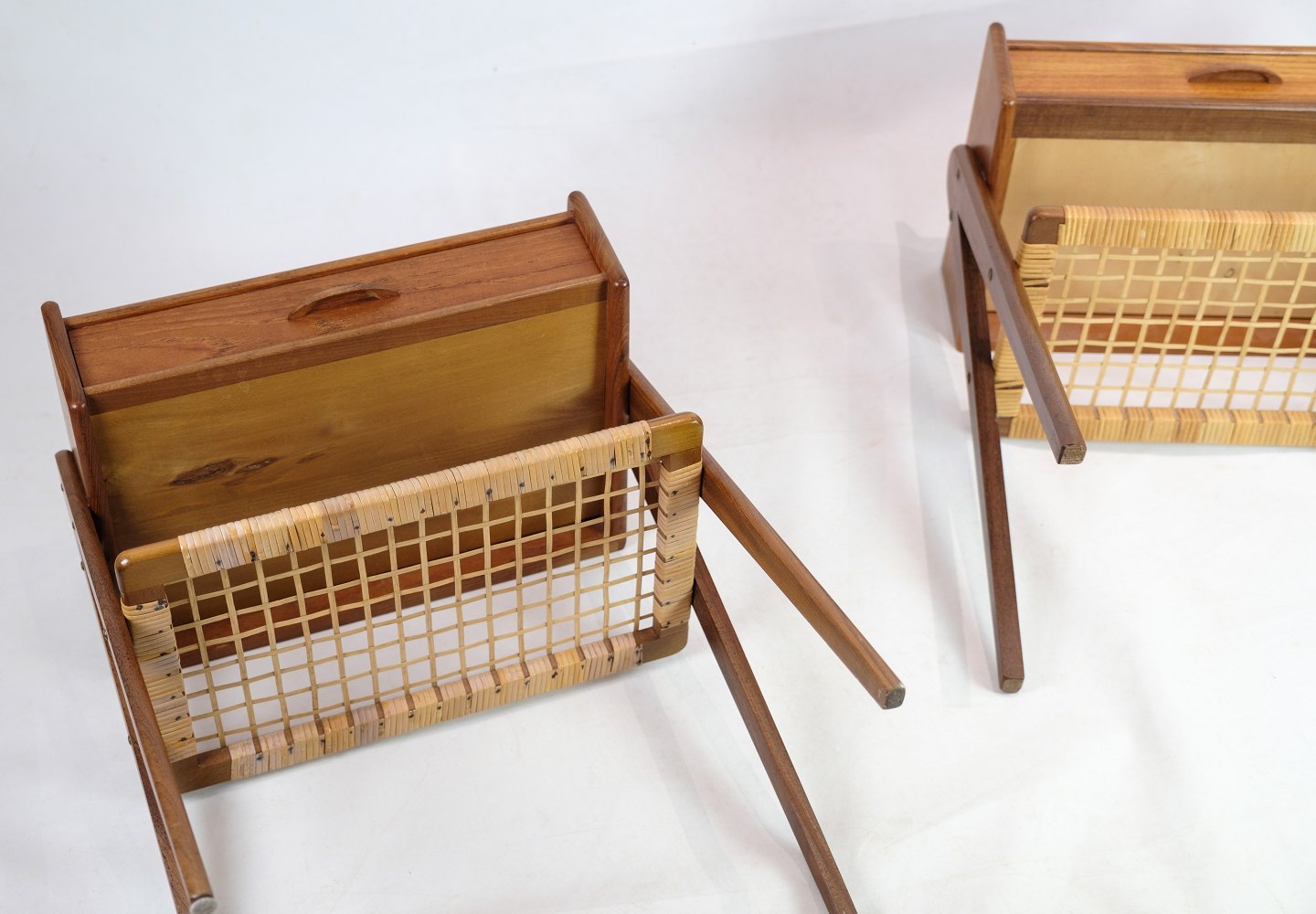 A pair of bedside tables / bedside tables, designed by Søren Rasmussen in teak wood with drawer and wicker lid from around the 1960s.