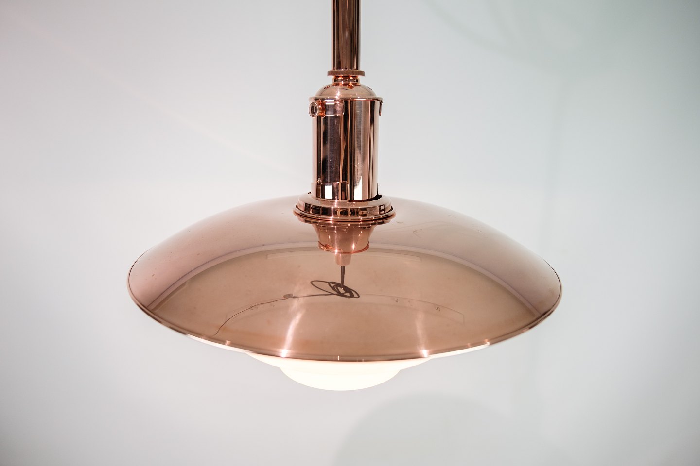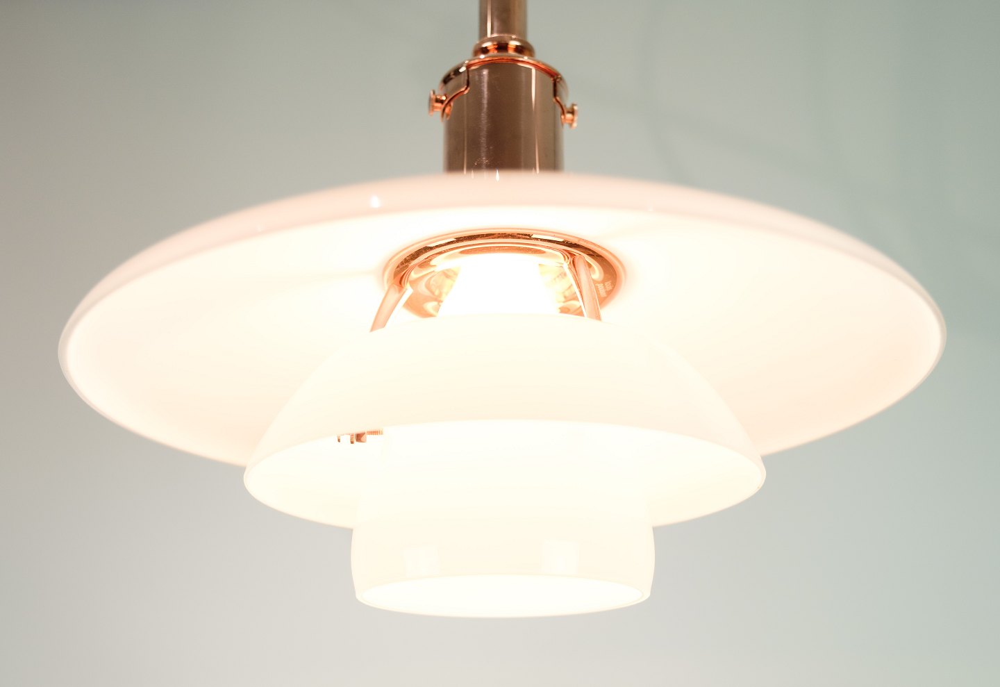PH pendant, model 3½-3, limited edition in copper, designed by Poul Henningsen and produced by Louis Poulsen. On the occasion of Poul Henningsen's 120th birthday. Was only produced between 1 March 2014 to 30 May 2014. The lamp is made of copper with two lower shades of white opal glass. An upper scade in white opal glass is also included in the price