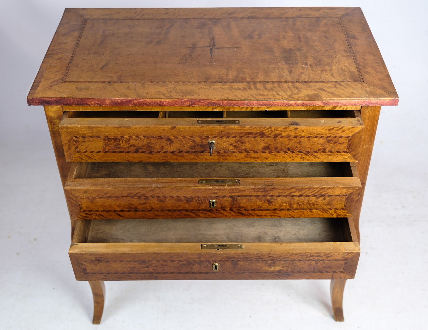 SoldAntique chest of drawers in walnut with marquetry and brass keyholes from around the 1920s. Key included.