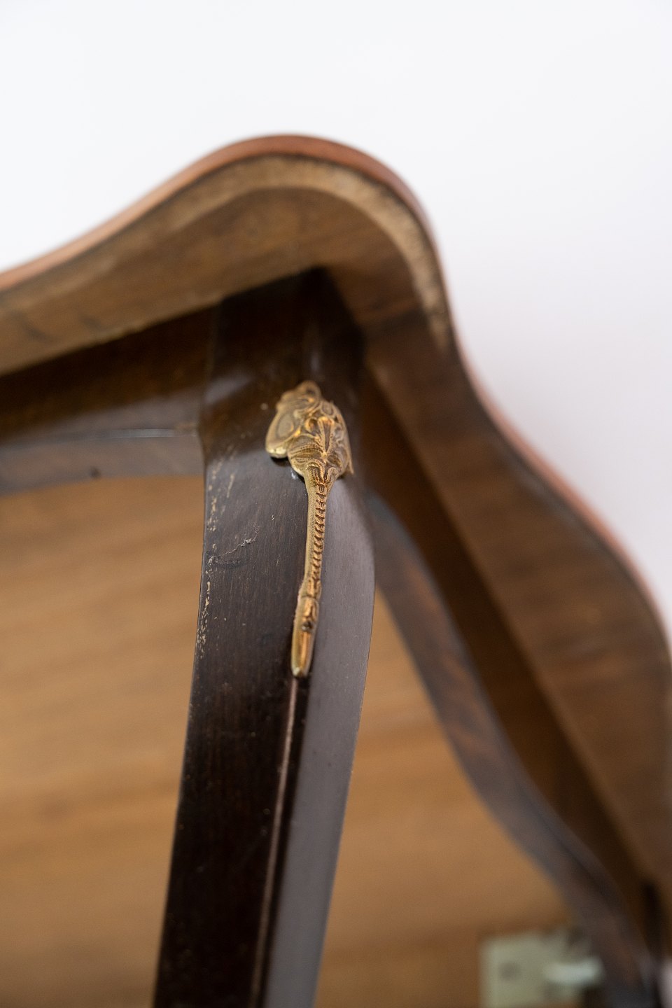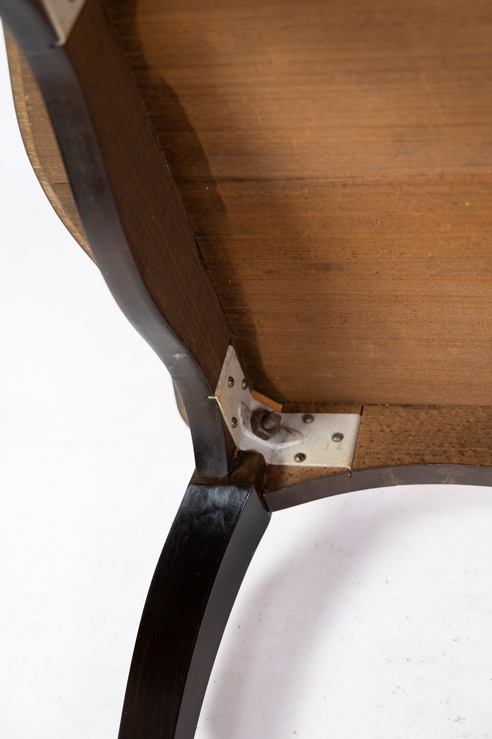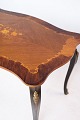 Antikt sofabord af rococo stil med ben af bejdset træ med messing dekoration og overflade i rosentræ med intarsia fra omkring 1930'erne.