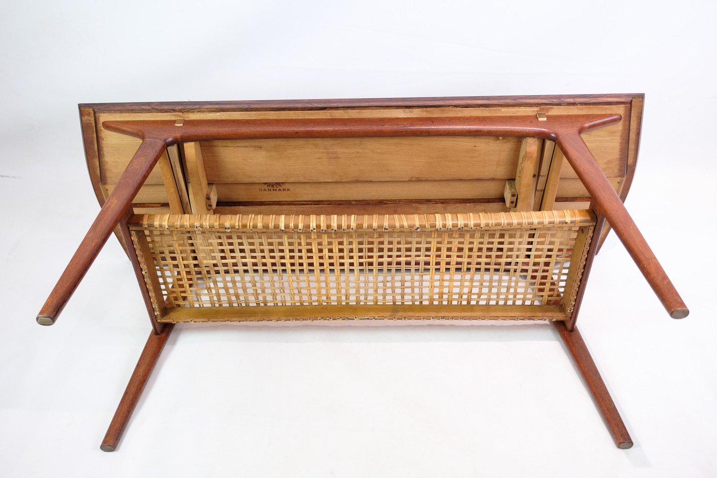 SolgtSofabord i palisander af Heltborg Møbler Danmark med underliggende flethylde fra omkring 1960'erne. Sofabordet har også udtræksplader i hver side, som gør det henholdsvis 47 cm og 87 cm bredt.