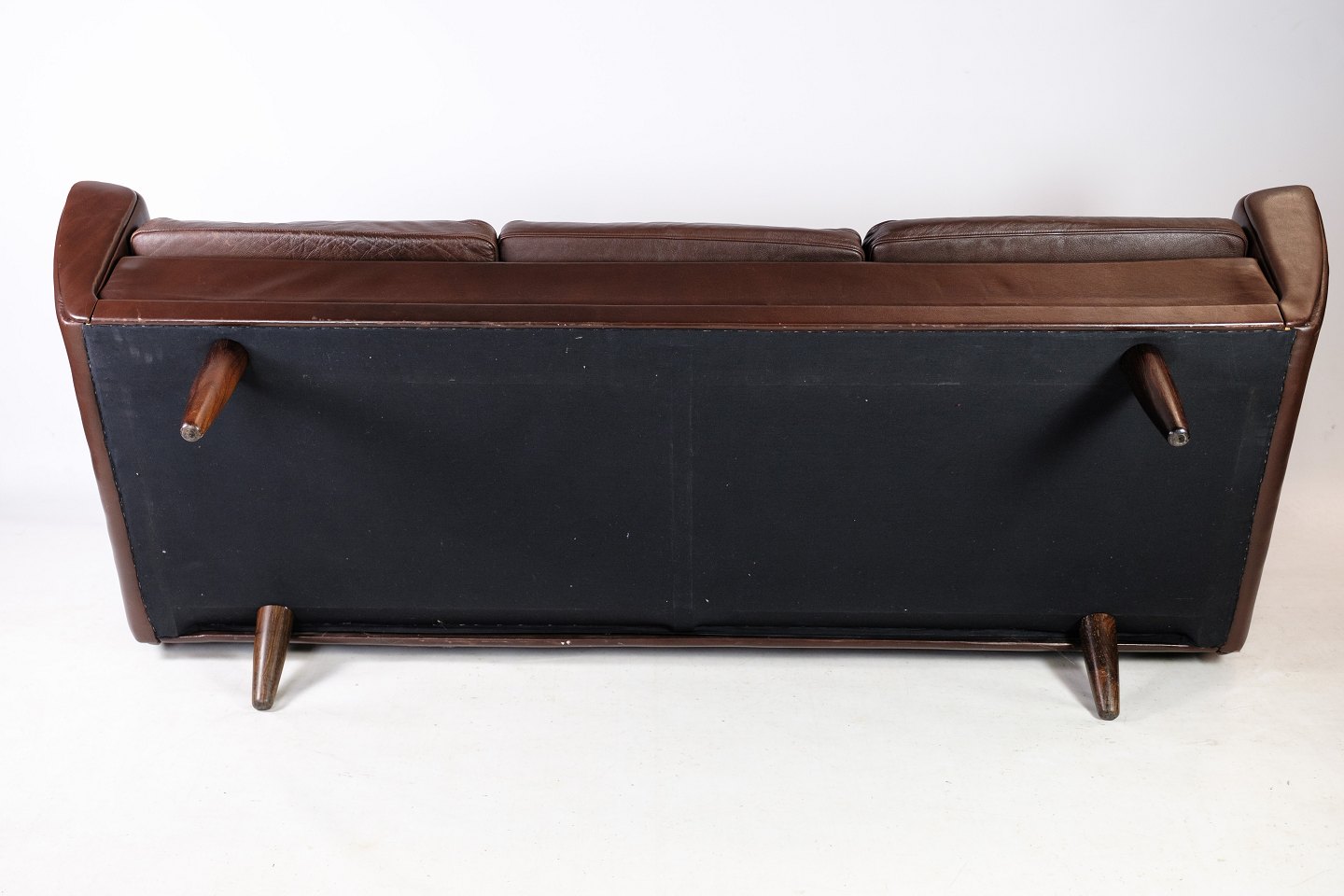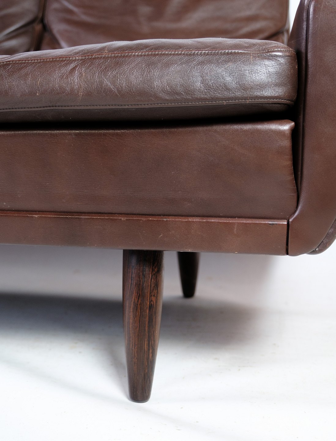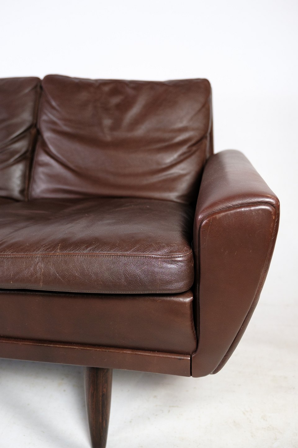 SoldThis elegant Brown leather sofa, model 64, was designed by Georg Thams and manufactured by Vejen Polstermøbelfabrik in Denmark in the 1960s. The sofa is made with solid rosewood feet, which gives a beautiful and durable finish. The leather is of high quality and will age beautifully over time, while the solid rosewood feet add a touch of elegance to the sofa. With its timeless design and high quality, this sofa will be an excellent choice for any decor.
