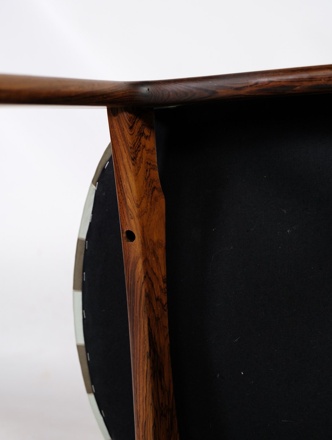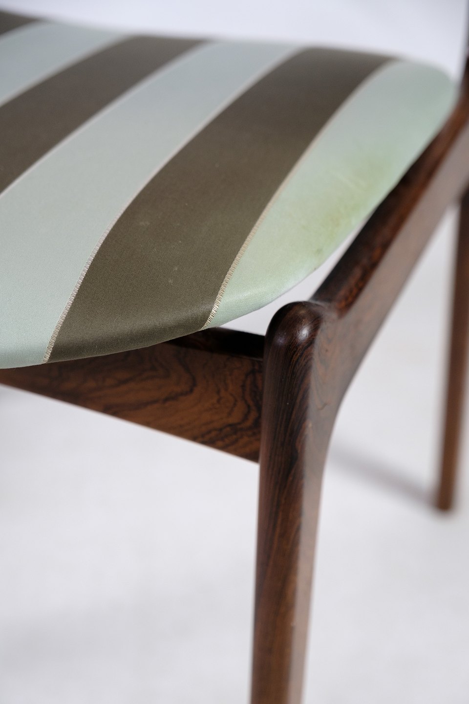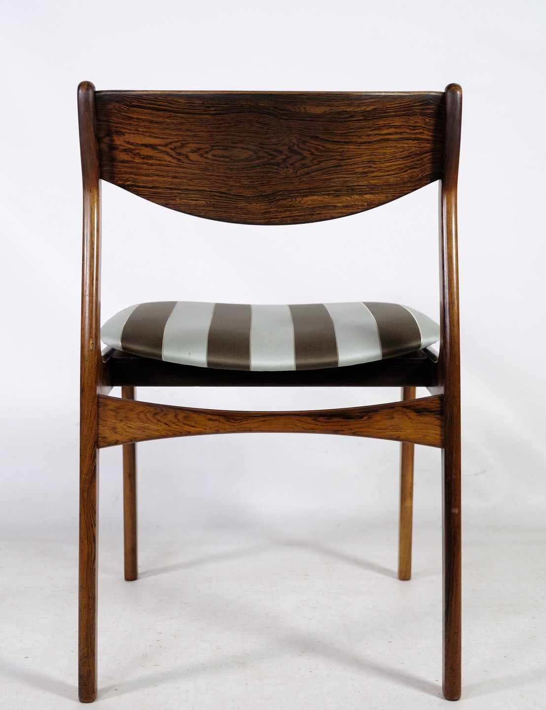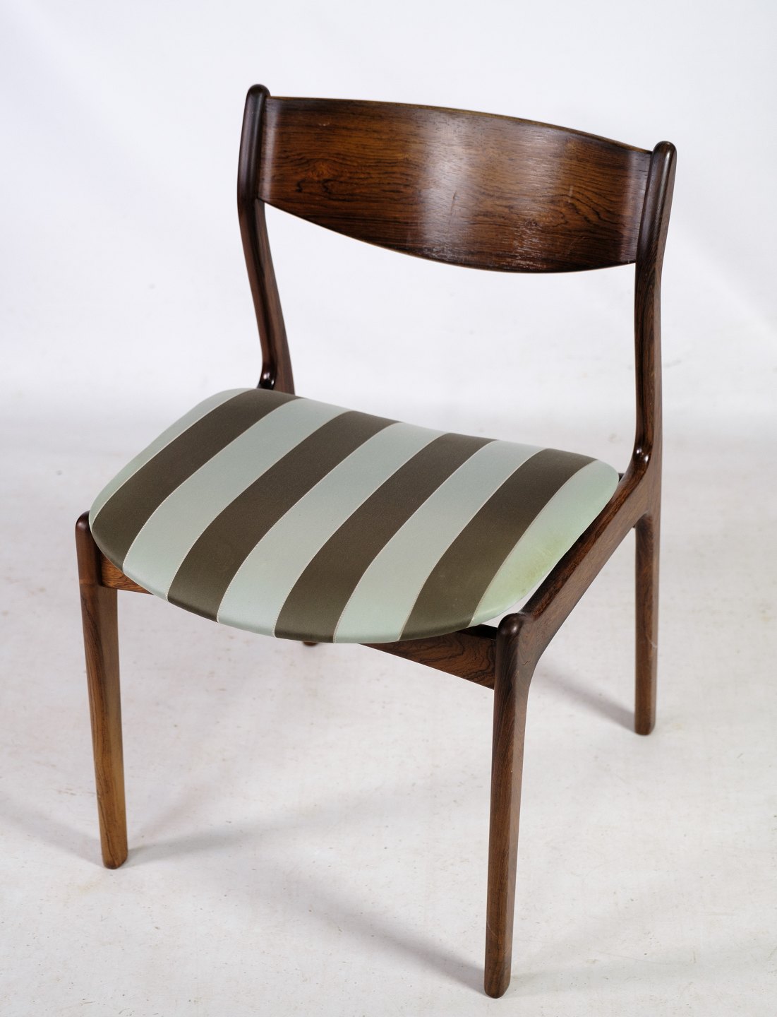 SoldSet of six dining chairs of Danish design in the wood type rosewood manufactured by Farsø møbelfabrik from around the 1960s. The chair is in very nice condition with striped fabric cover.