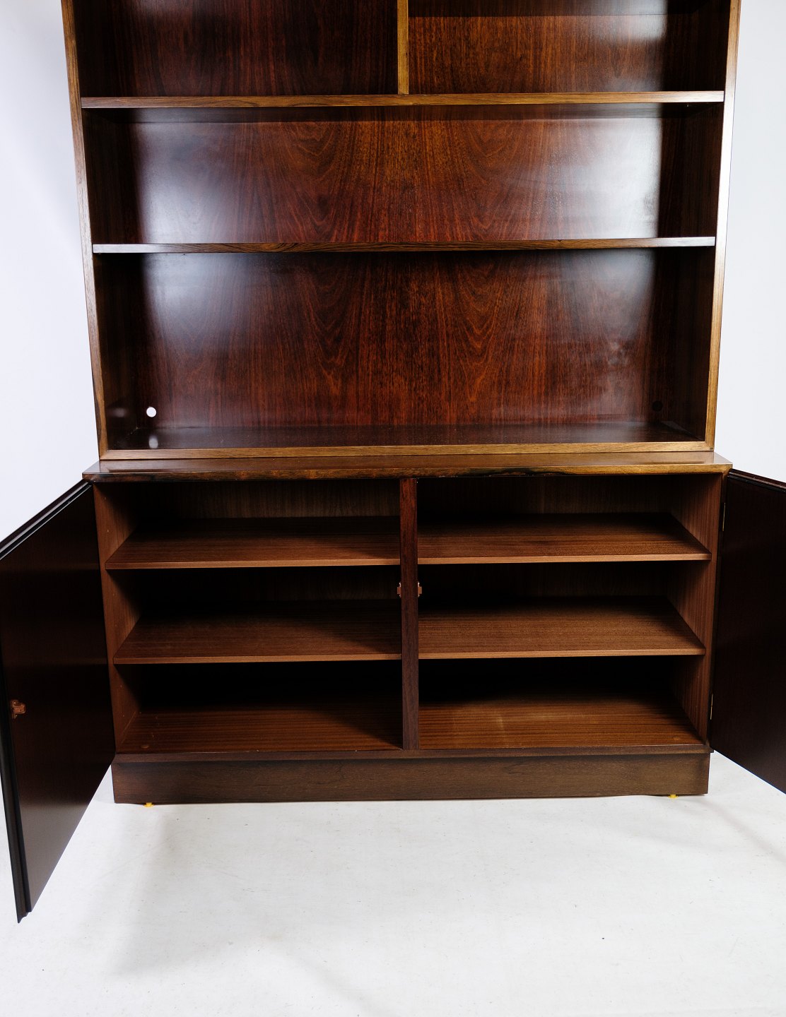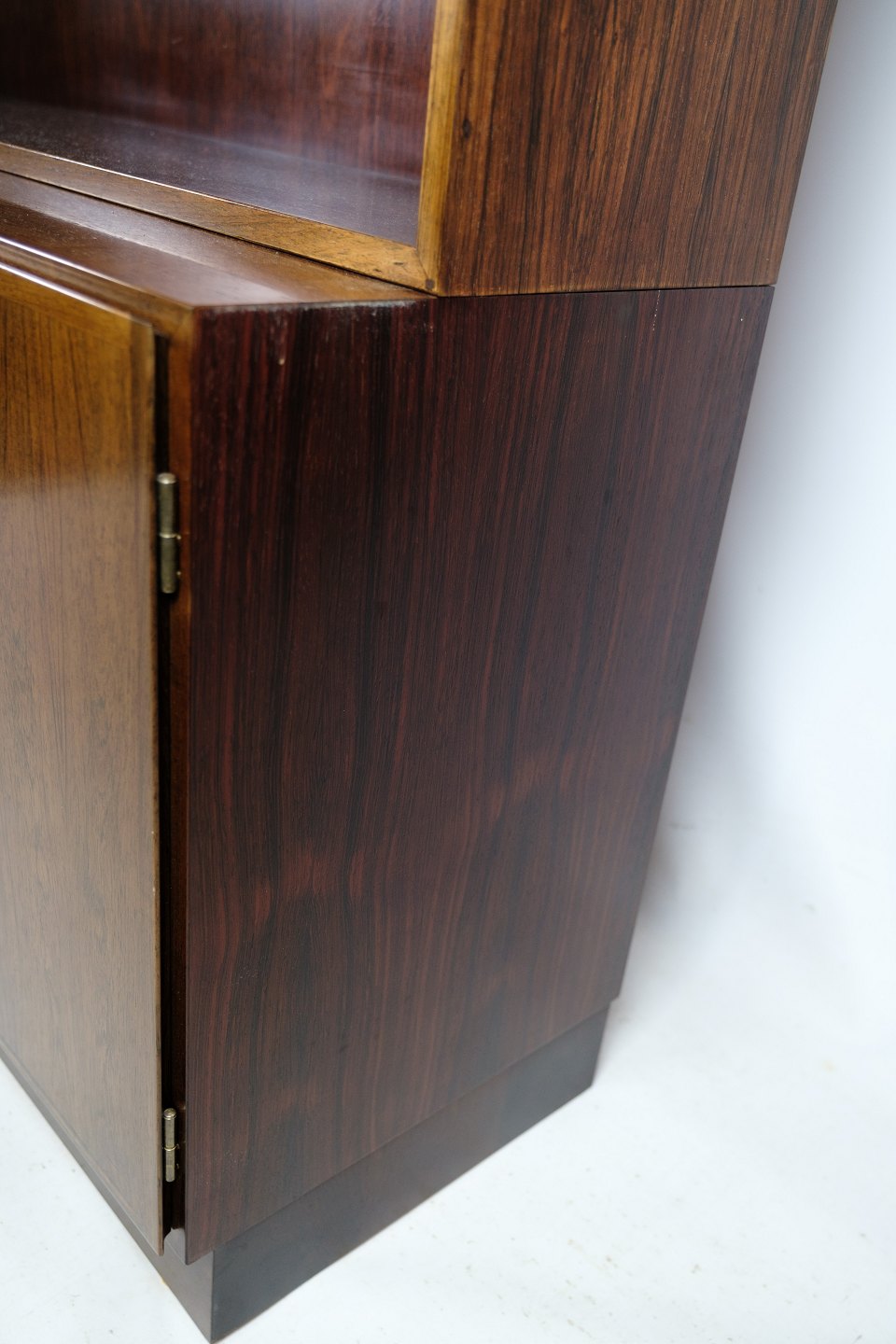 Fremstillet af palisander udstråler det varme og naturlige træ en unik skønhed og charme. Systemet består af en underdel med to låger og en vitrineoverdel med hylder, der tilbyder både funktionel opbevaring og smuk udstillingsplads.