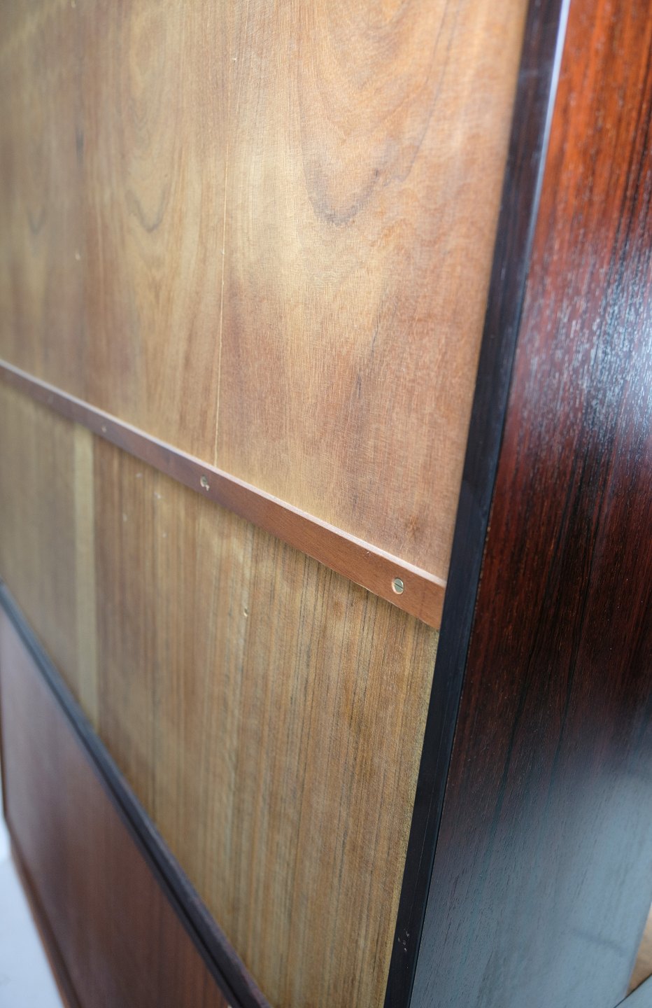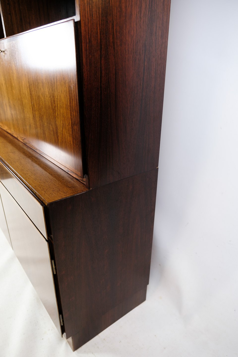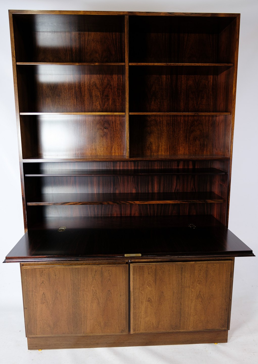 Reol system med sekretær, Model 9, designet af Omann Junior i palisander af dansk design fremstillet hos Omann Juniors Møbelfabrik fra 1960'erne. Bestående af underdel med 2 låger og vitrine overdel med hylder.