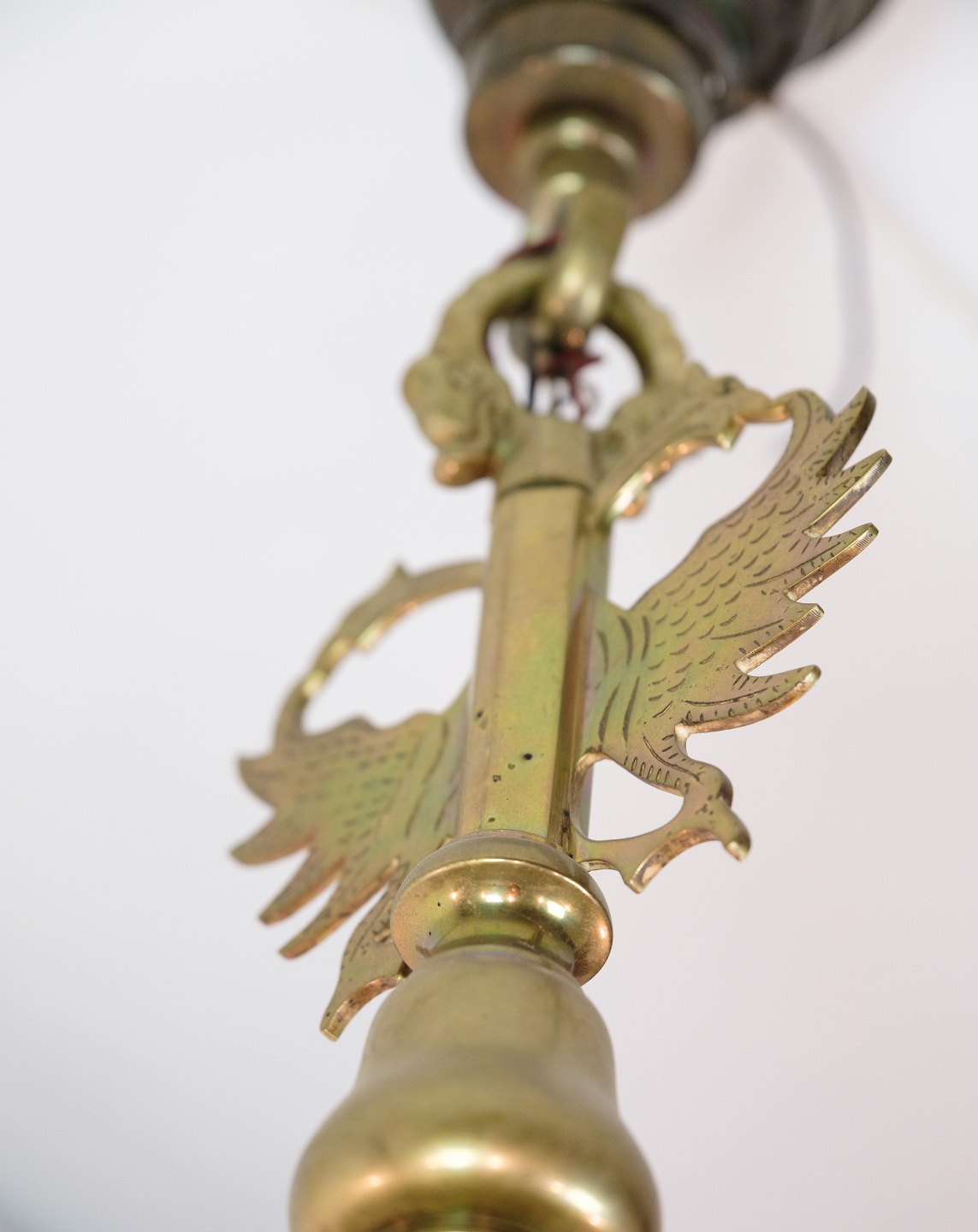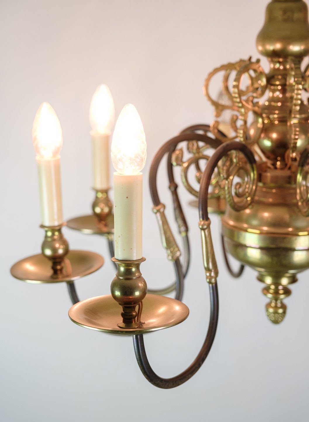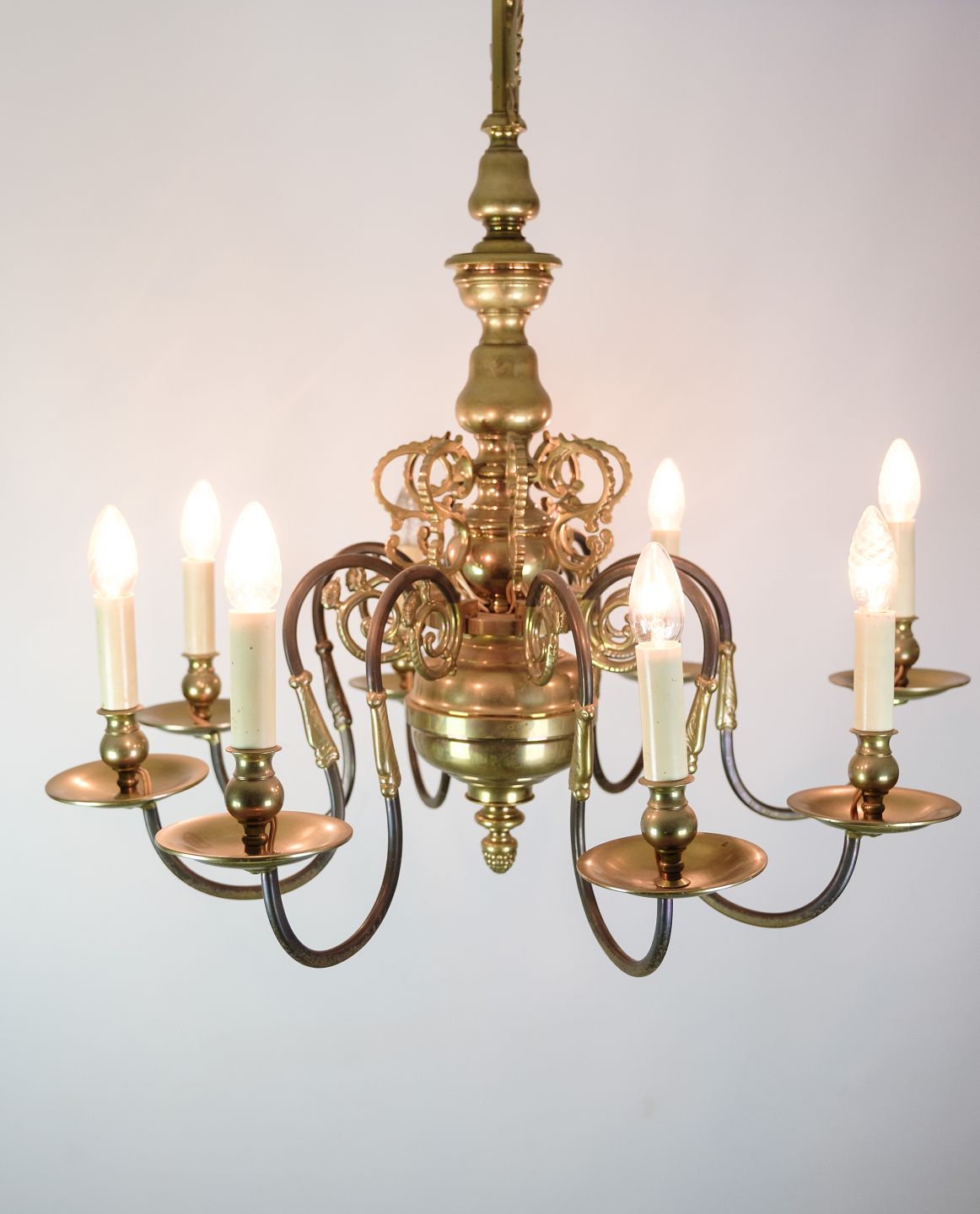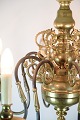 Church chandelier with eight arms in a French style of brass from around the 1920s. The lamp can be connected to power.