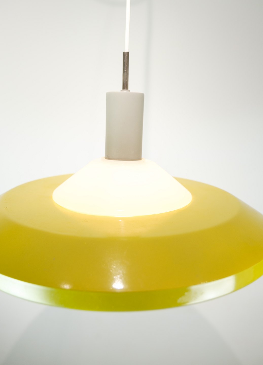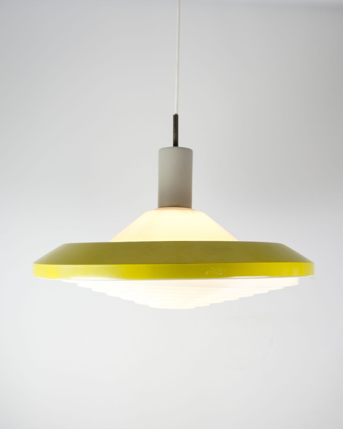 Stockholm pendant in yellow lacquered metal and opal glass by Louis Poulsen from the 1960s.
