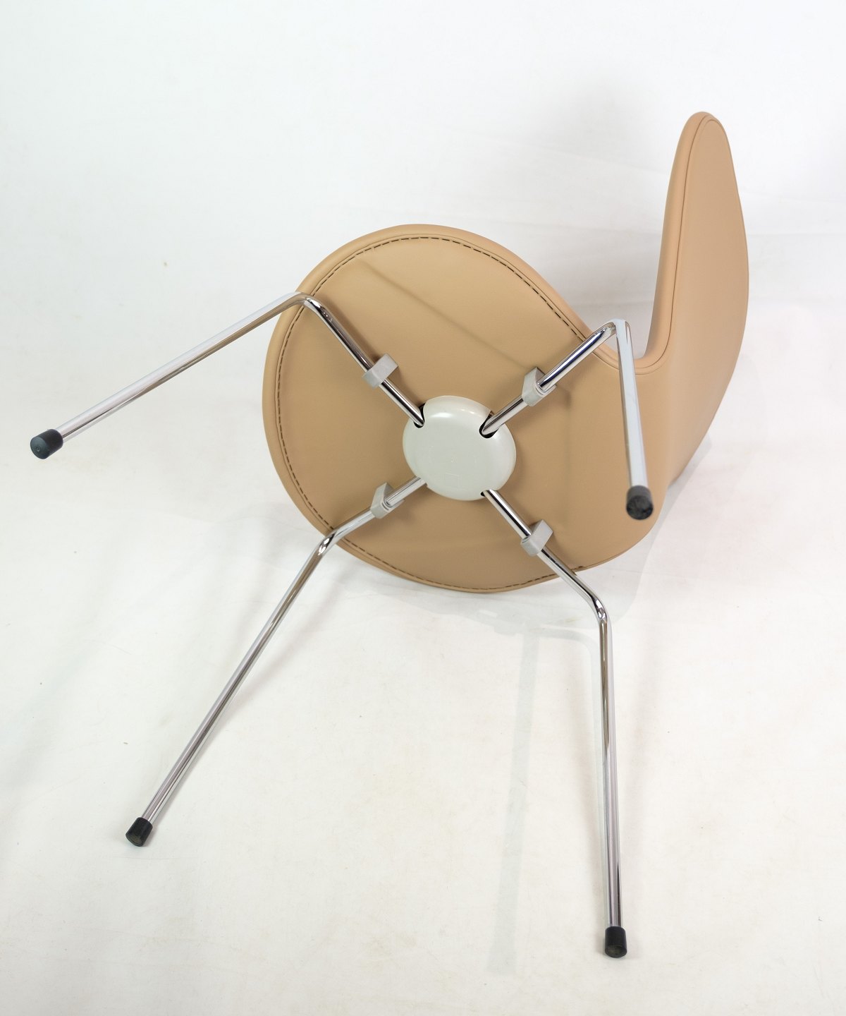 Et sæt af 4 Syver stole, model 3107, designet af Arne Jacobsen og fremstillet hos Fritz Hansen. Stolene er polstret i cream farvet elegance læder og i rigtig flot brugt stand. Vi kan polstre flere efter ønske.