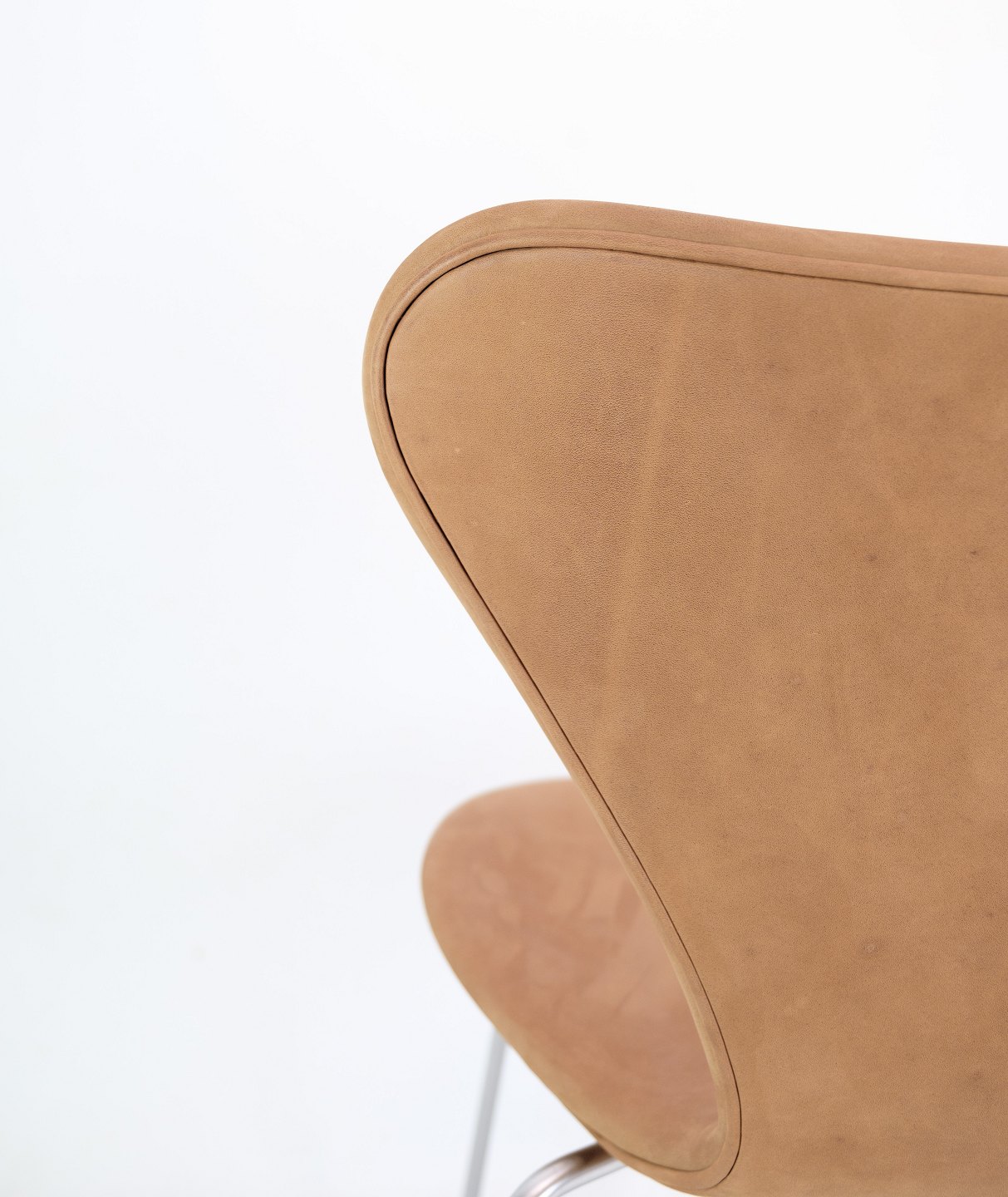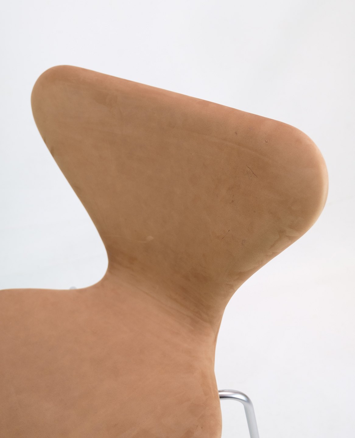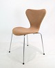 A set of 6 Seven chairs, model 3107, designed by Arne Jacobsen and manufactured by Fritz Hansen. The chairs are upholstered in light cognac elegance leather and in very nice used condition.