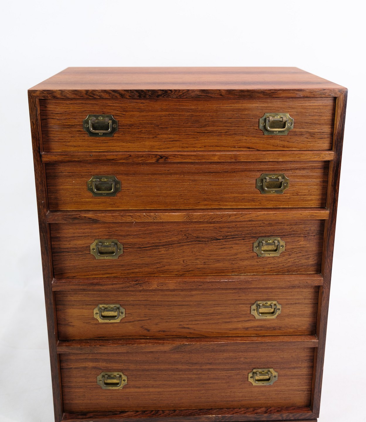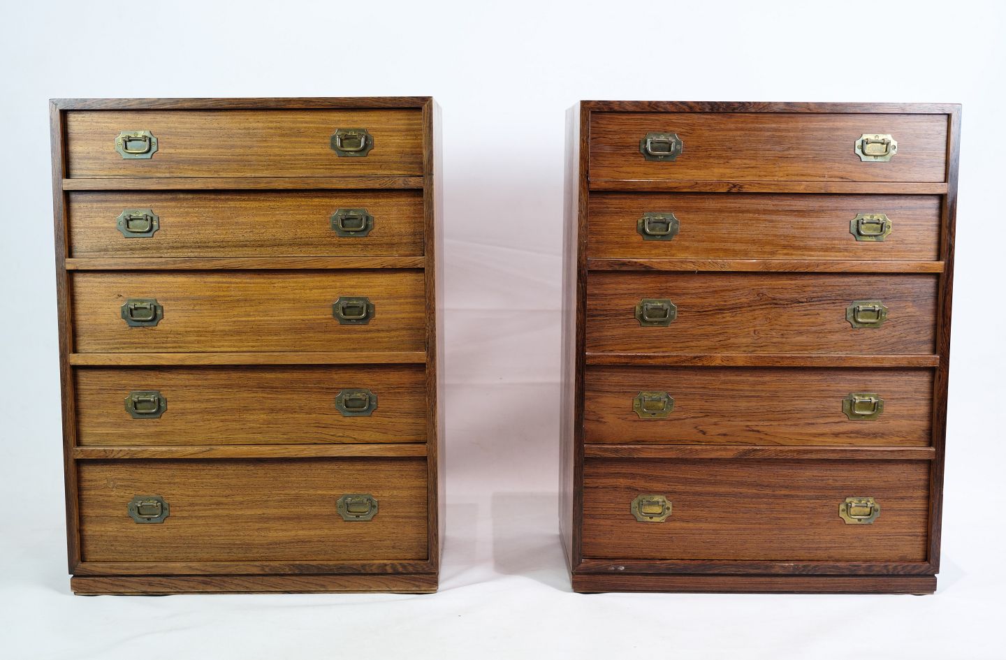 This set of two chests of drawers, designed by Henning Korch, is made of rosewood and makes an elegant and functional addition to any room. Each chest of drawers has five spacious drawers with brass handles that add a subtle touch of luxury to the design. The natural warmth and beautiful texture of the rosewood is combined with the timeless aesthetics and craftsmanship quality that is characteristic of Henning Korch's designs. Manufactured at Silkeborg Møbelfabrik, these chests of drawers are not only beautiful, but also durable and functional, making them a valued addition to any interior.