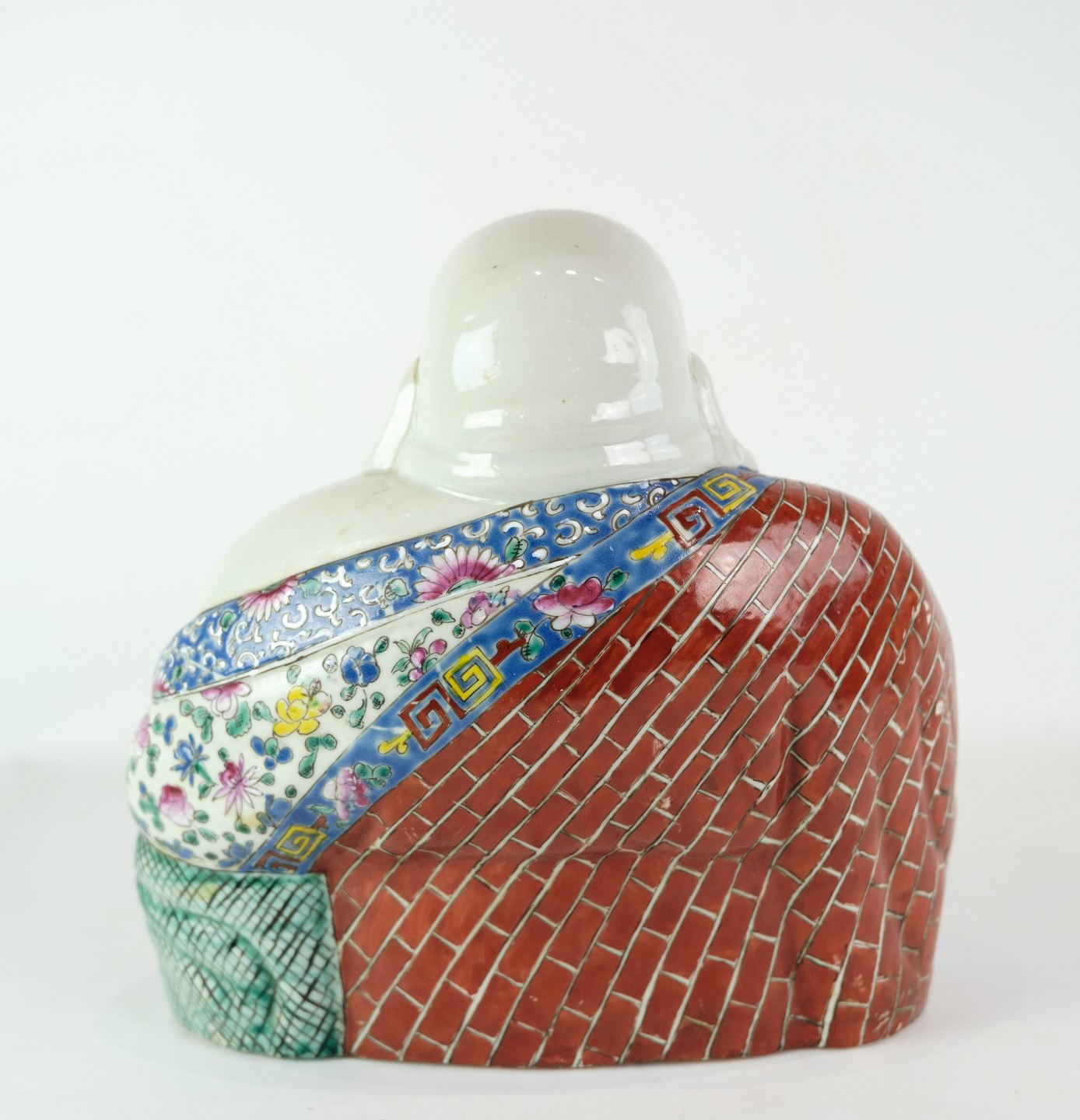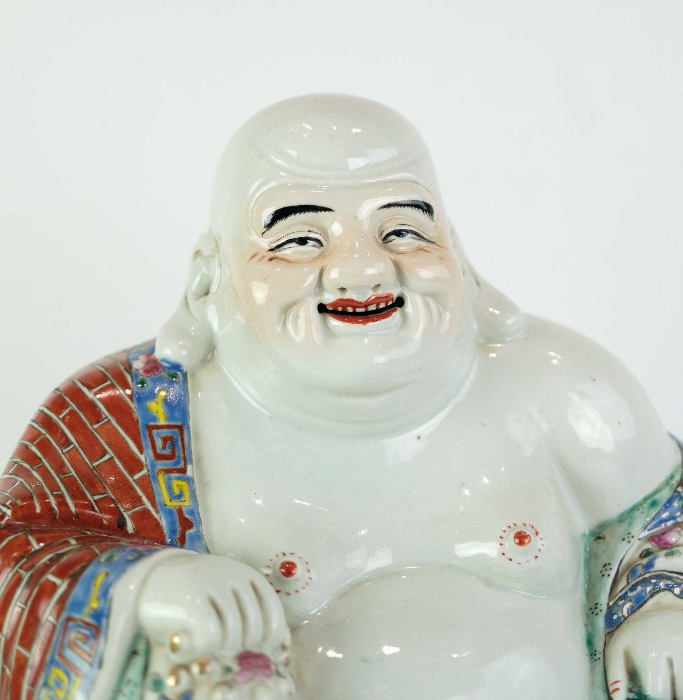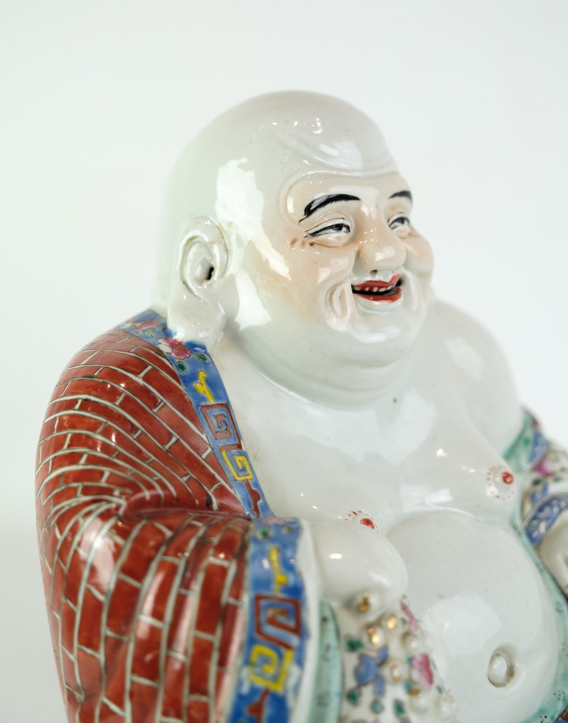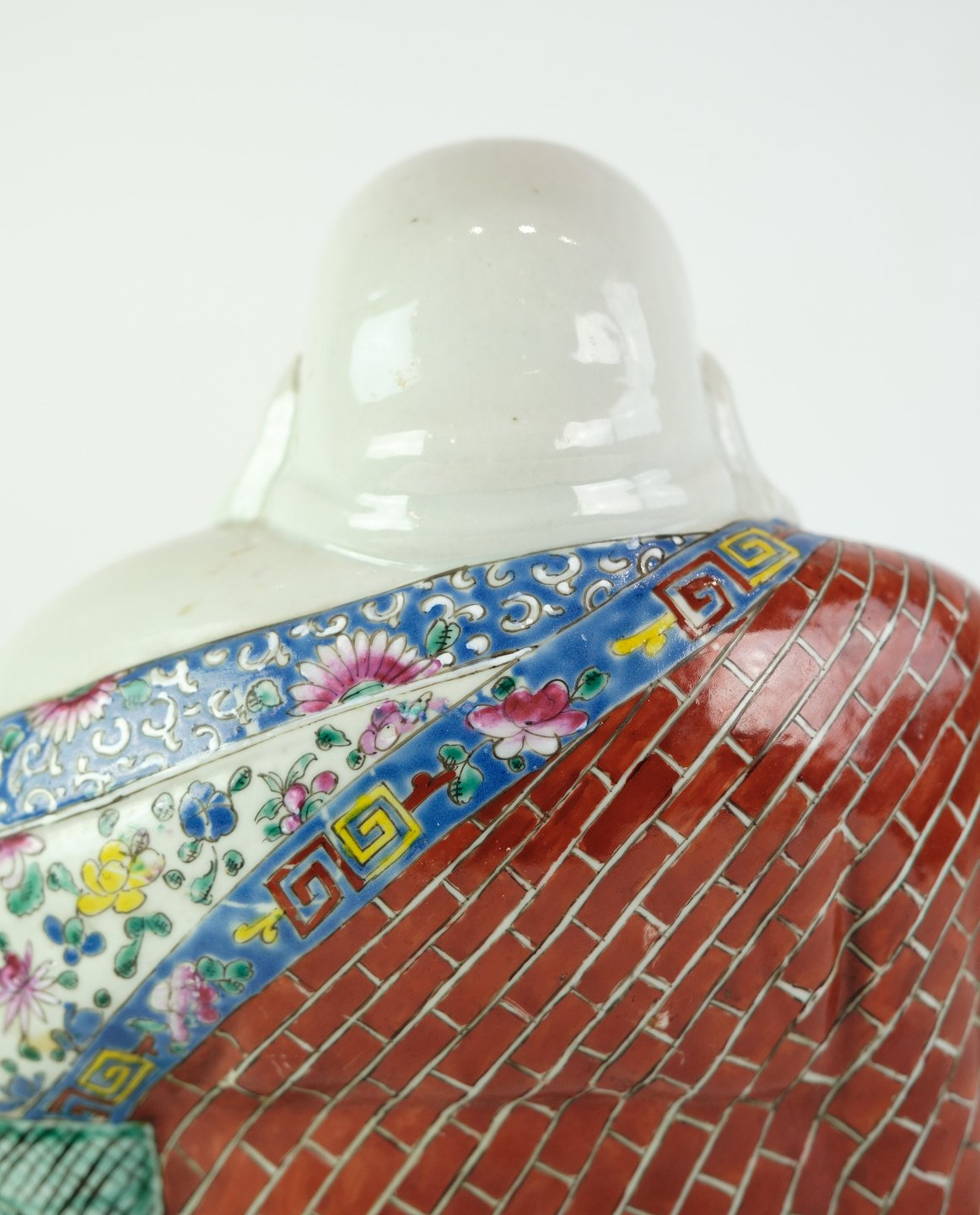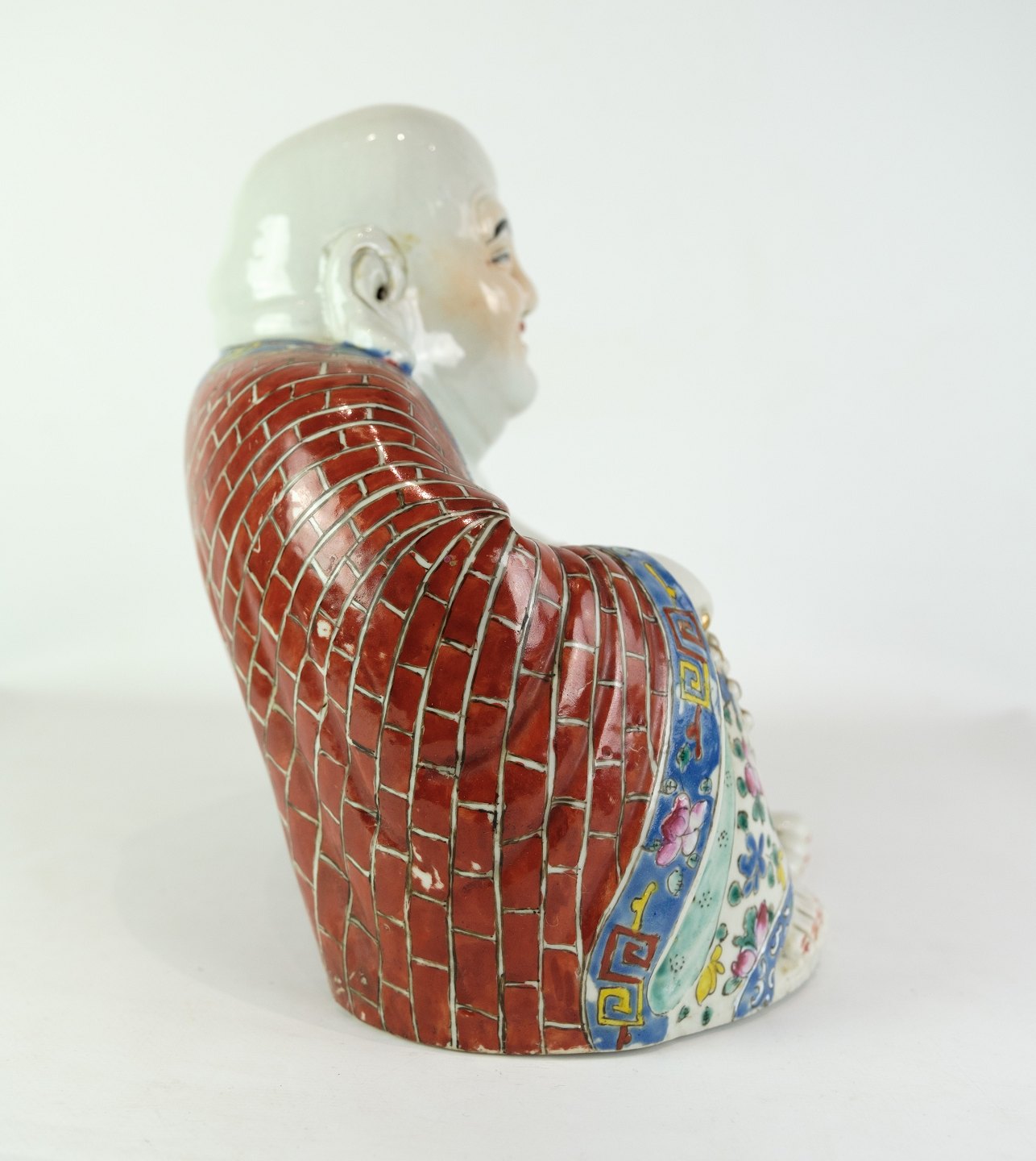 Sitting Buddha darduse porcelain figure decorated in light and brown colors from China around the 20th century.