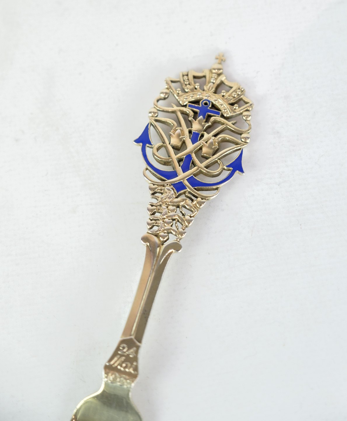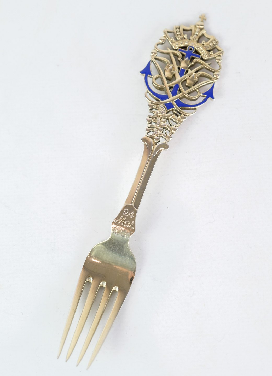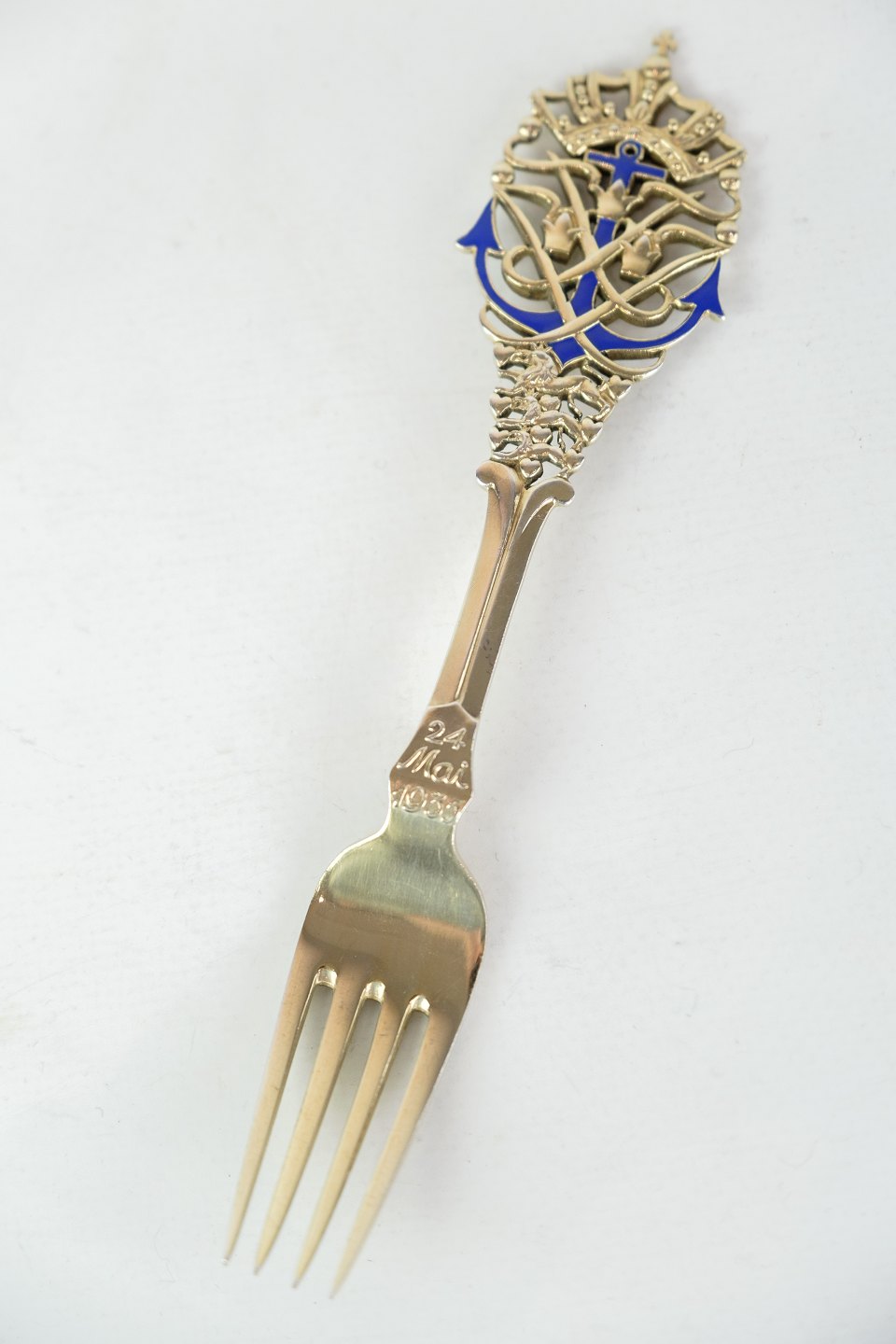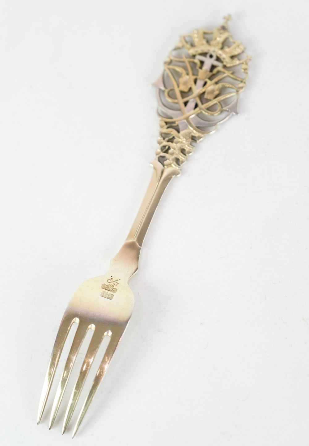Jubilæumsgaffel fra A. Michelsen i sølv forgyldt i anledning af Kronprins Frederik og kronprinsesse Ingrids bryllup d. 24 Maj 1935.